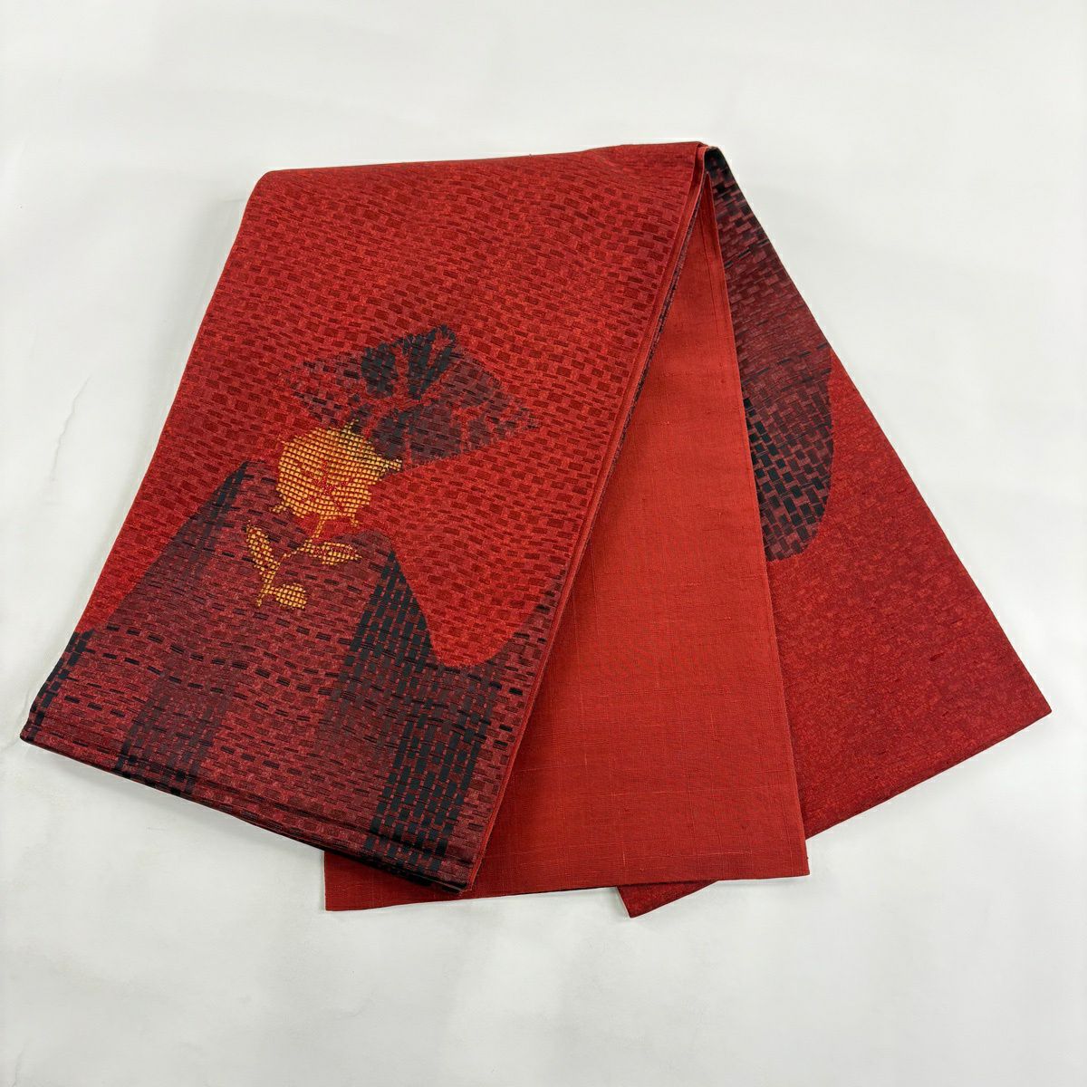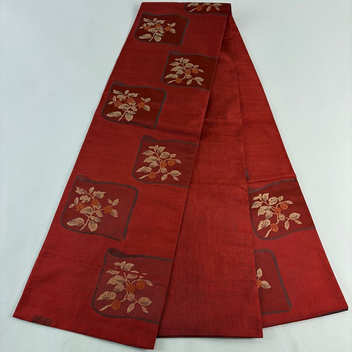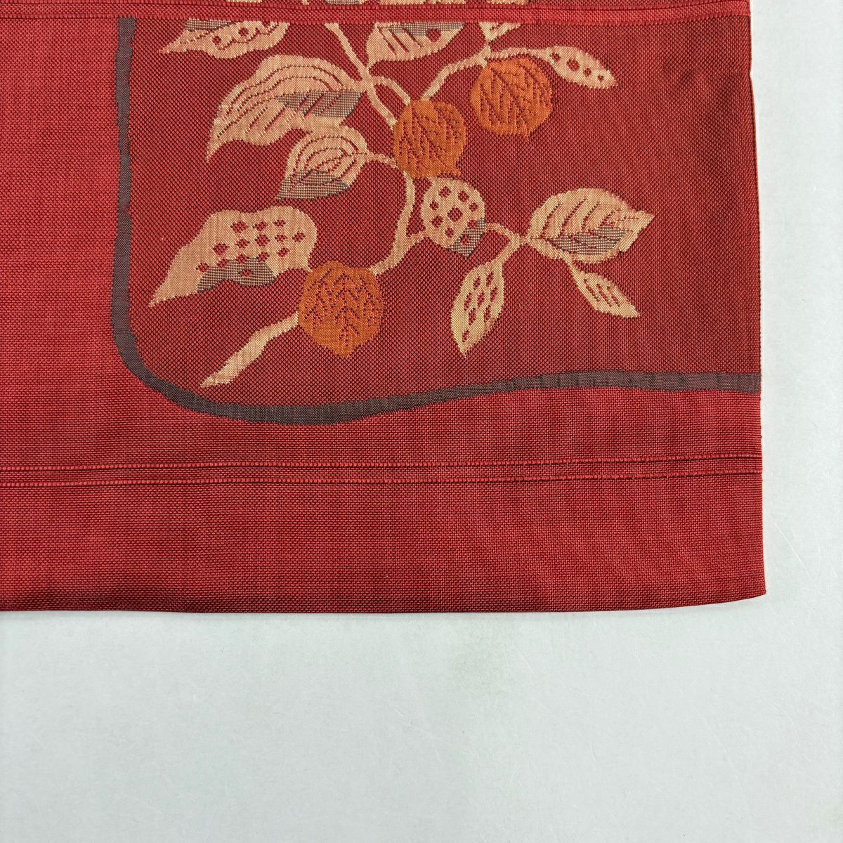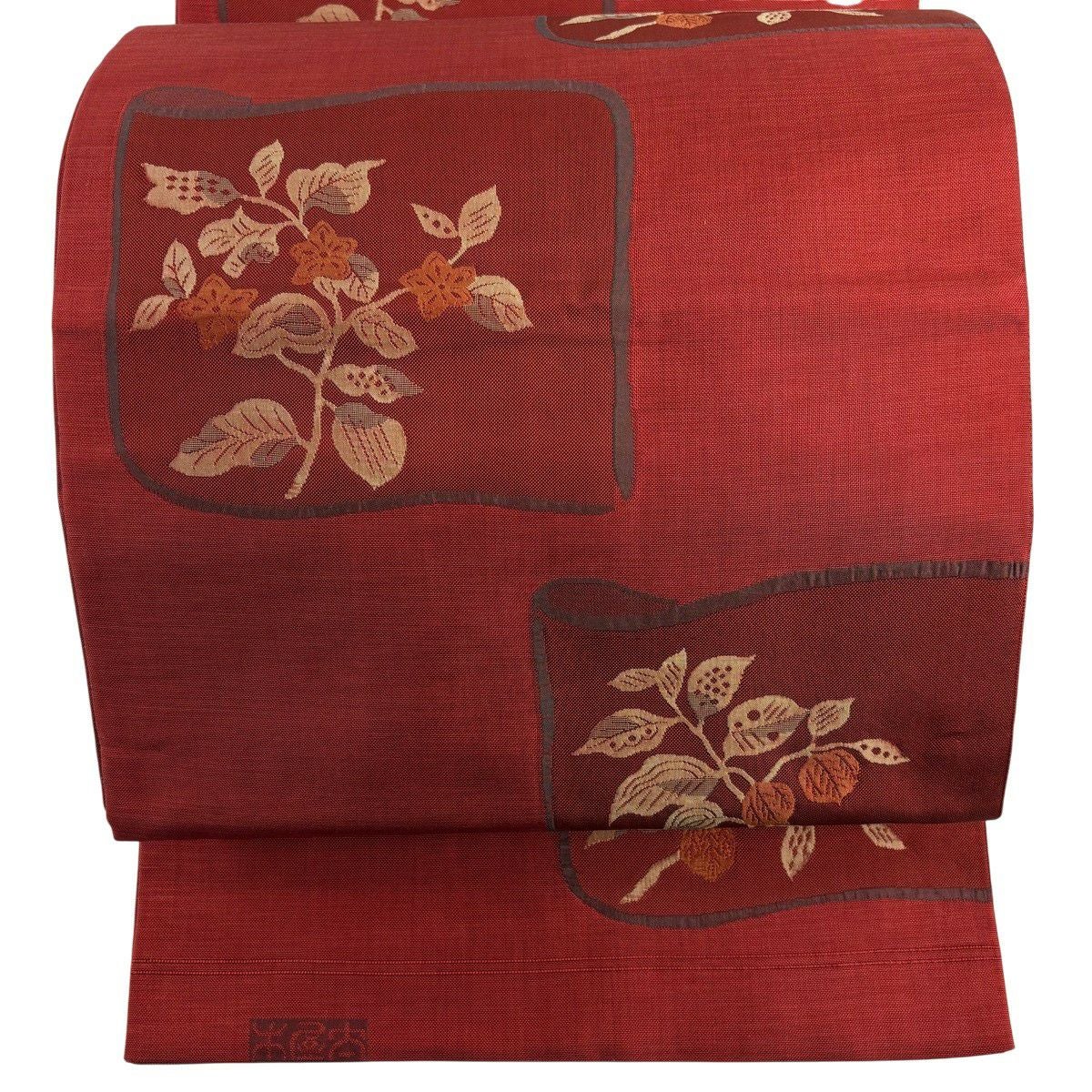 【美品】 袋帯 秀品 紬地 草花 幾何学模様 えんじ色 お太鼓柄 正絹