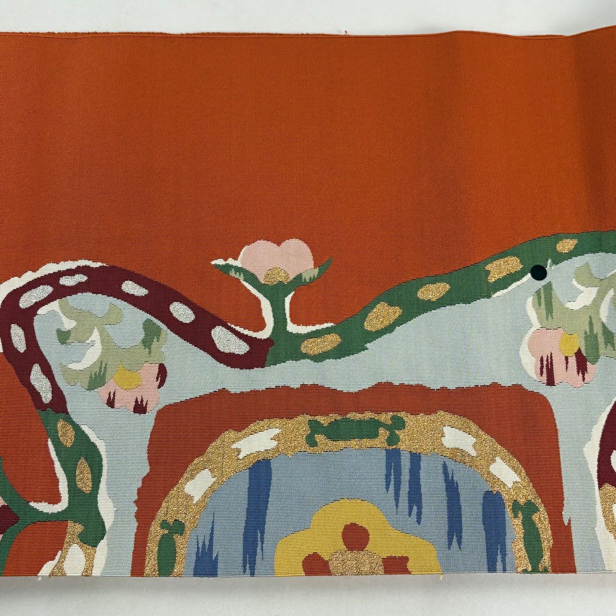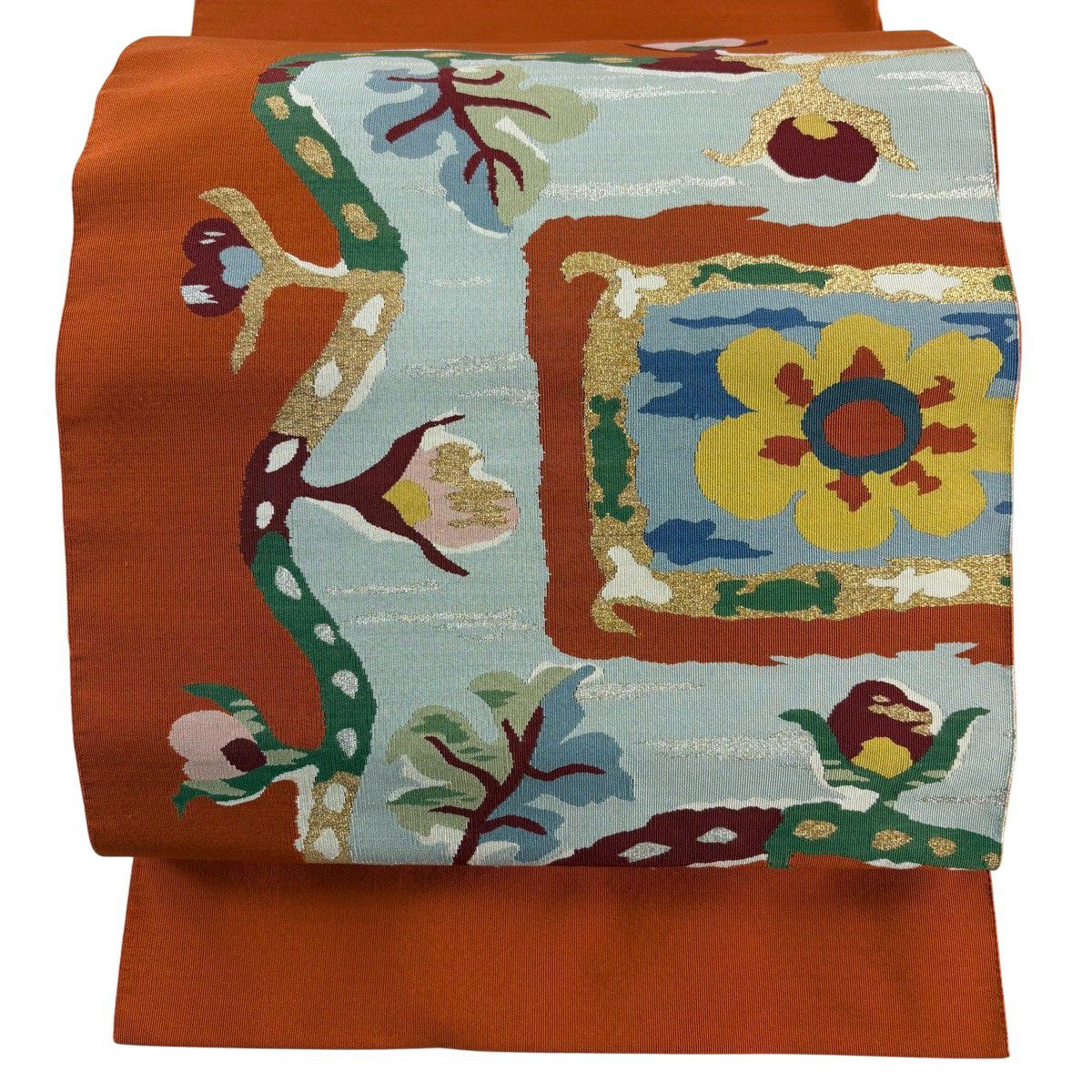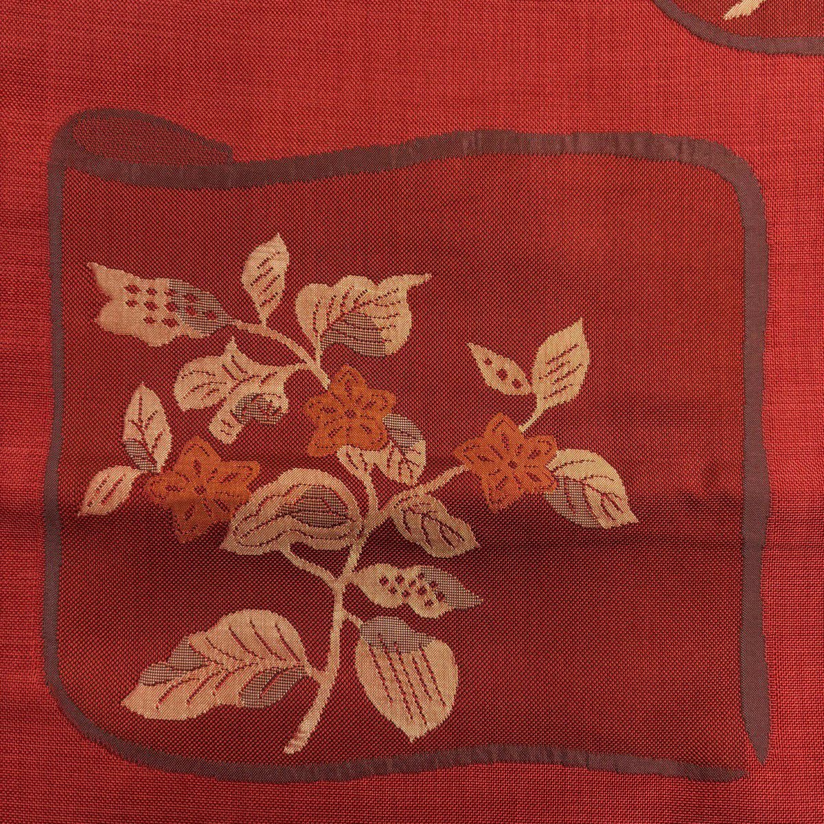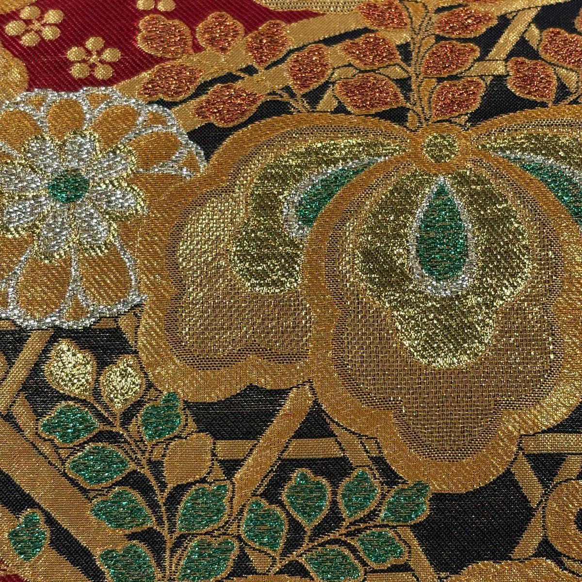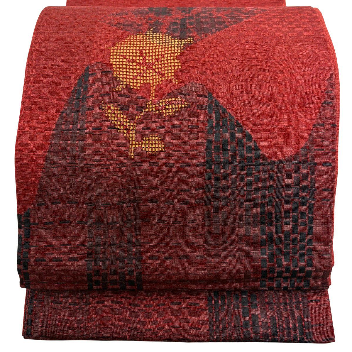 【美品】 袋帯 秀品 紬地 草花 幾何学模様 えんじ色 お太鼓柄 正絹