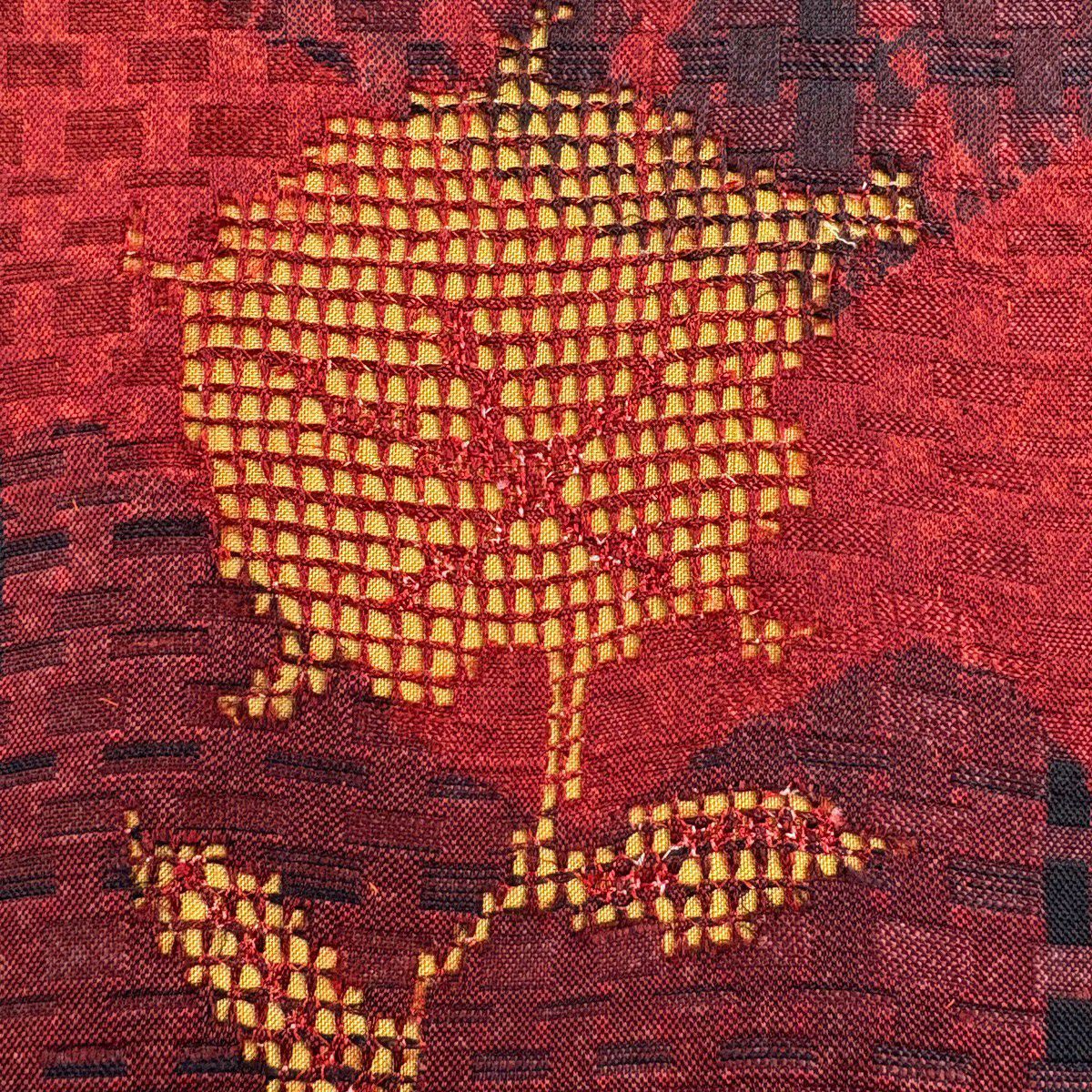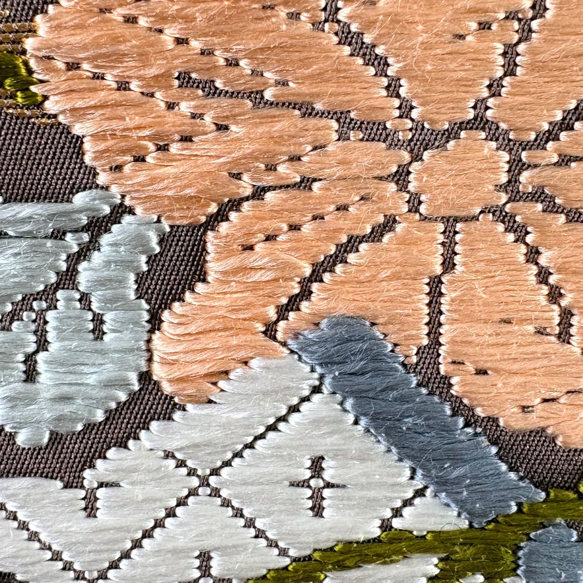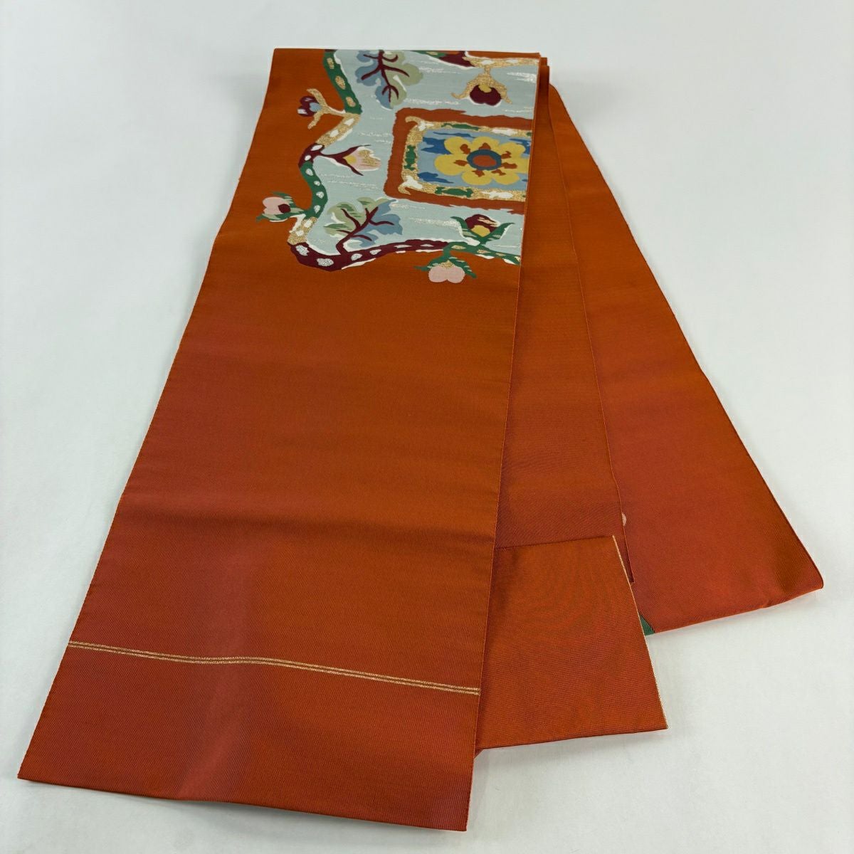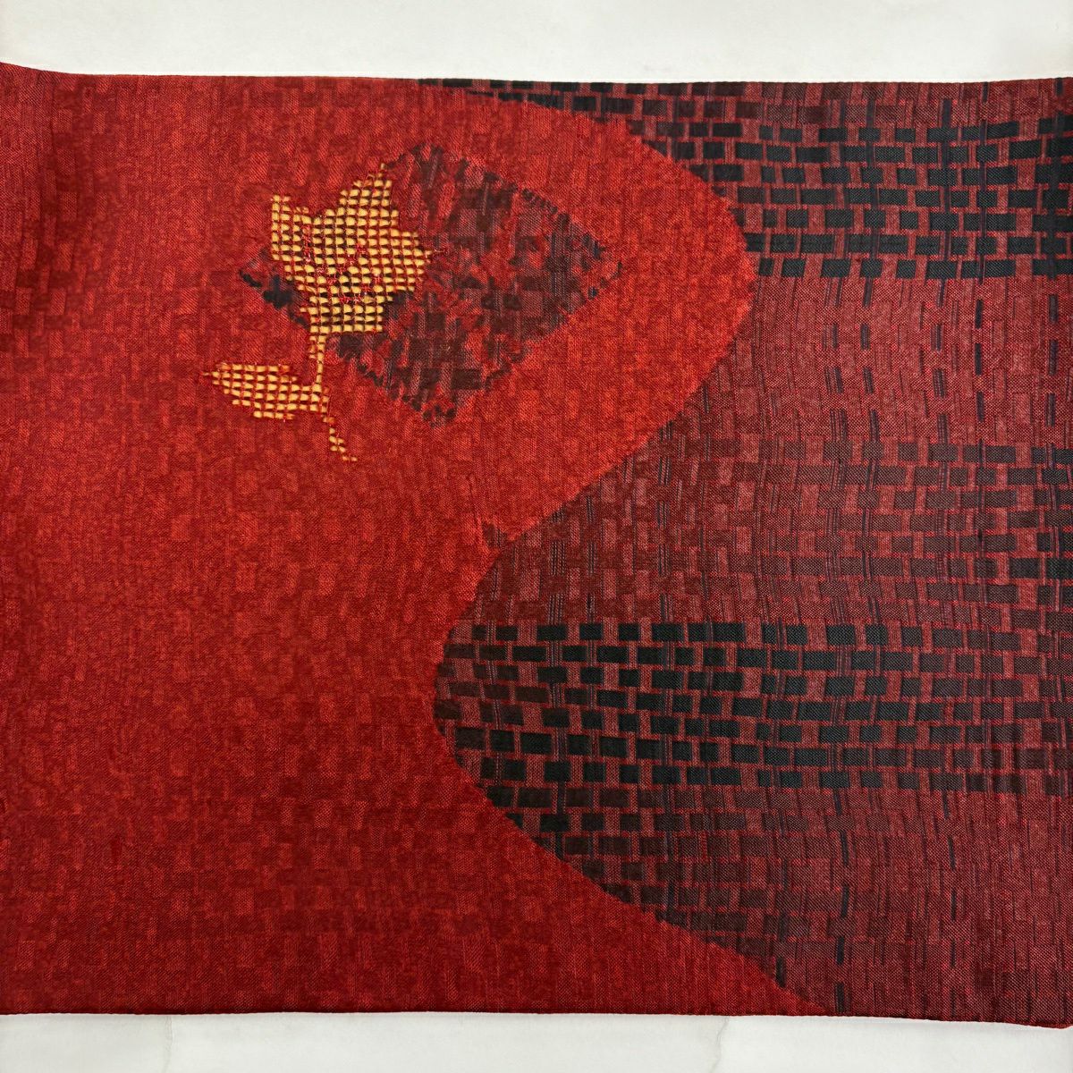 【美品】 袋帯 秀品 紬地 草花 幾何学模様 えんじ色 お太鼓柄 正絹
