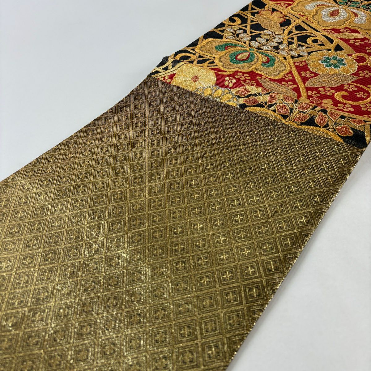 【美品】 袋帯 秀品 振袖向き 桐 バチ梅 金糸 箔 赤 六通 正絹