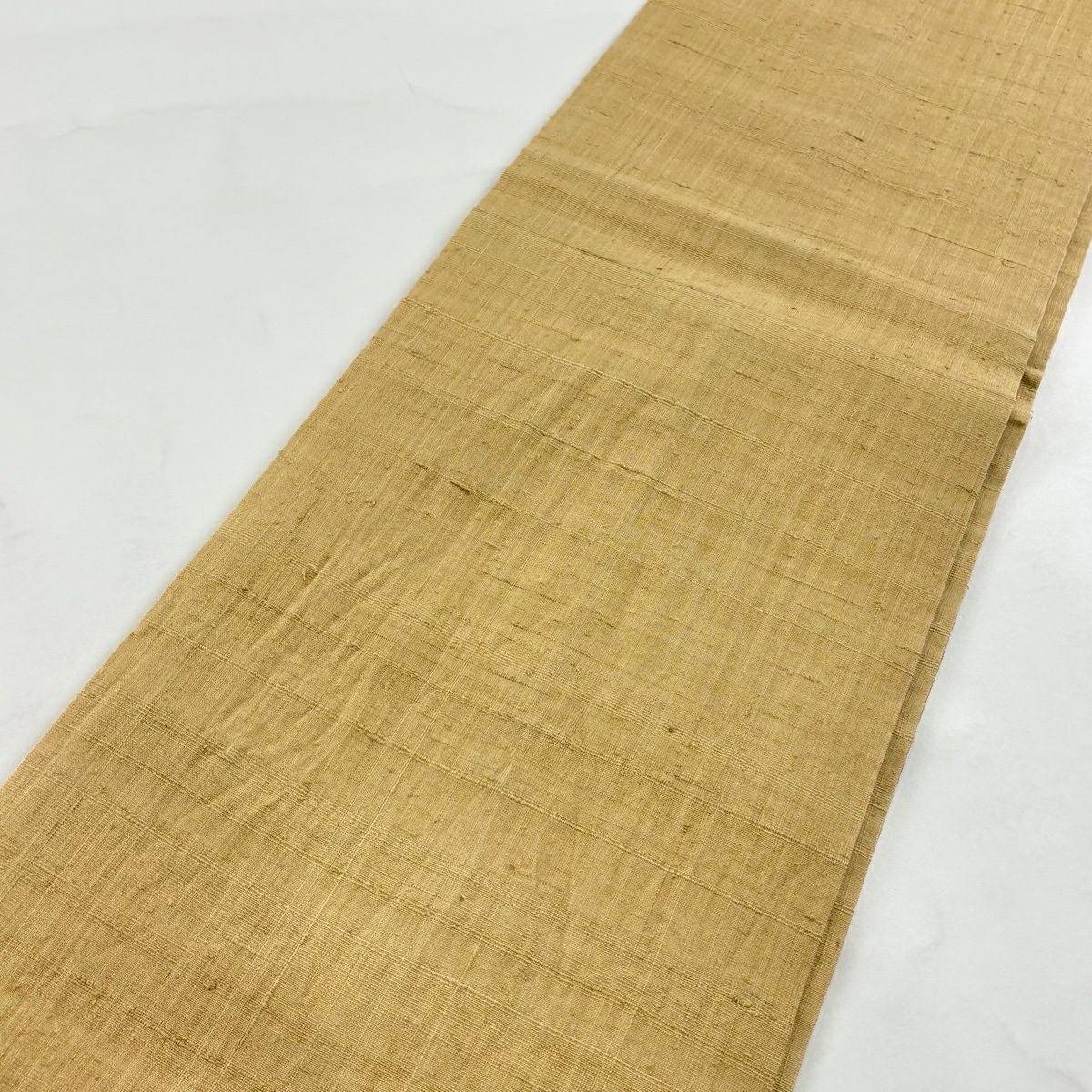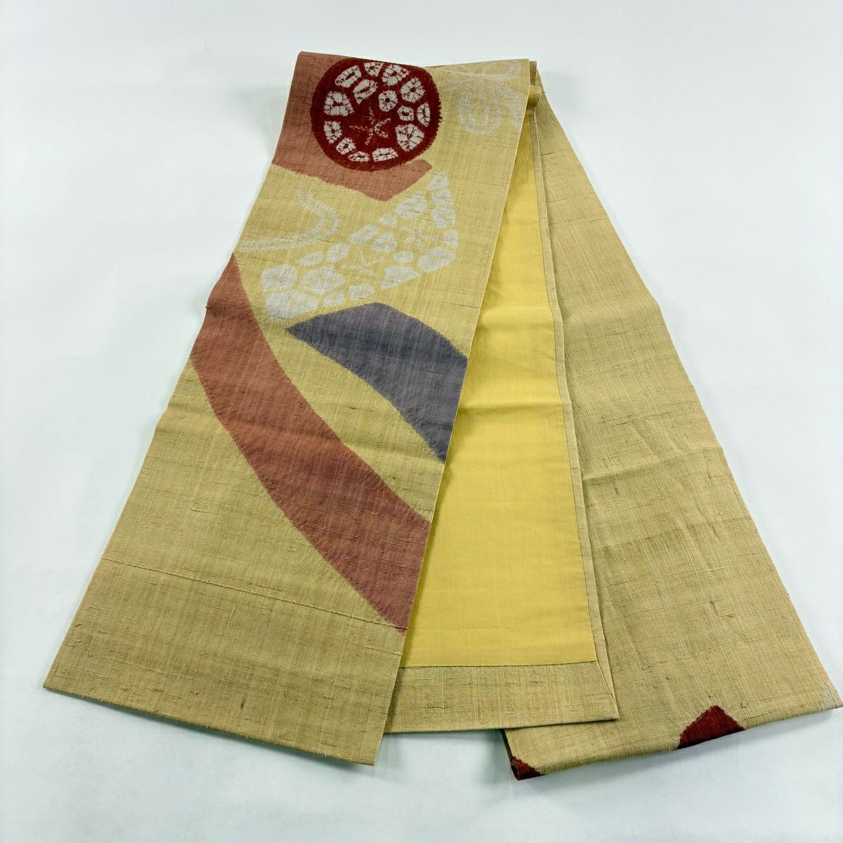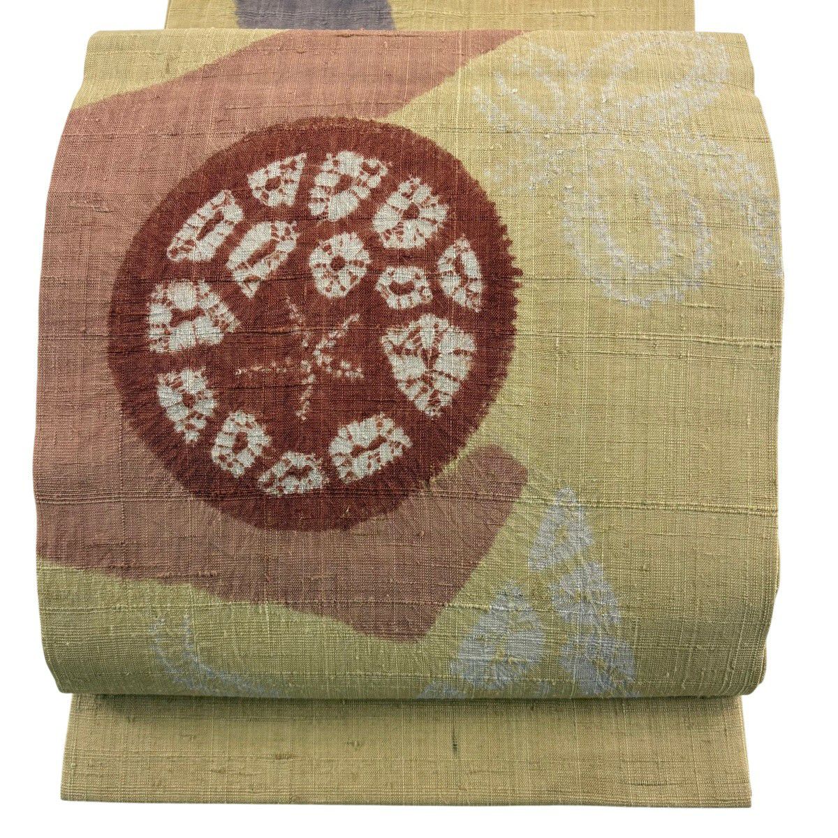 【美品】 開き名古屋帯 秀品 紬地 丸文 幾何学 絞り 薄黄土色 正絹