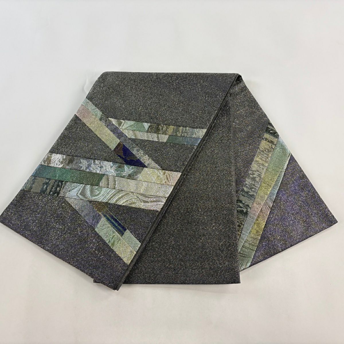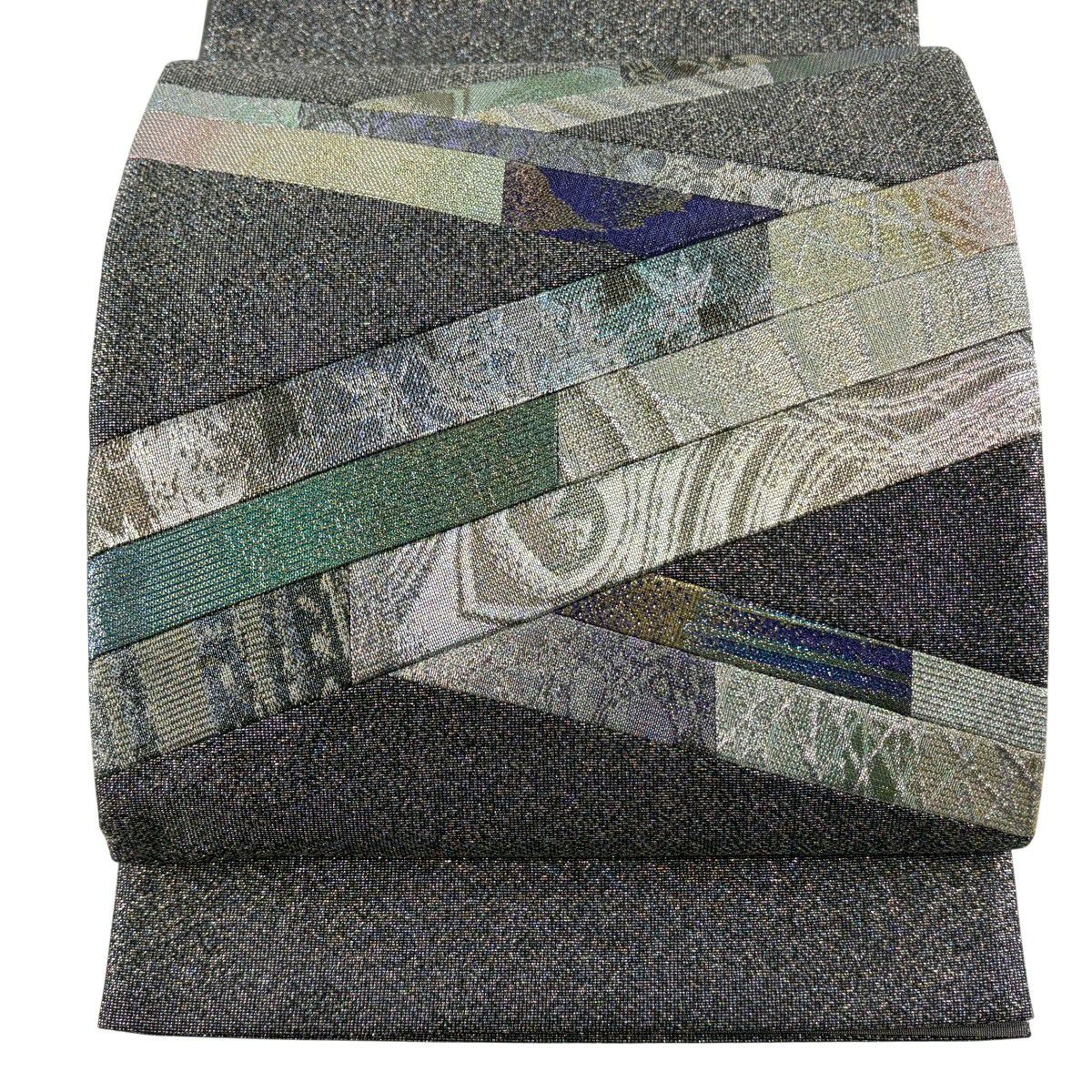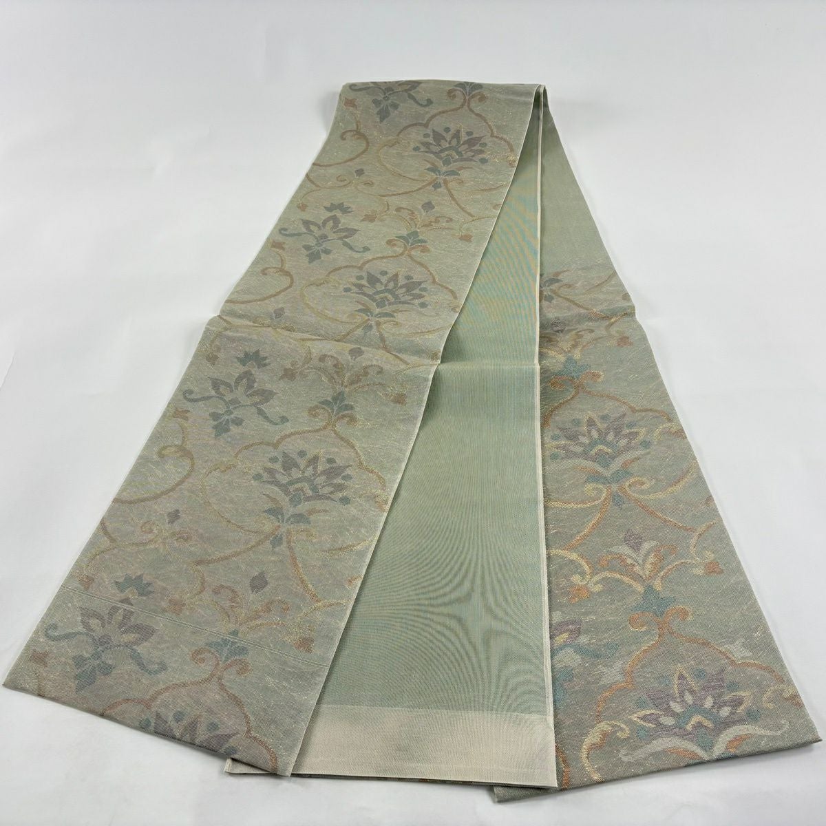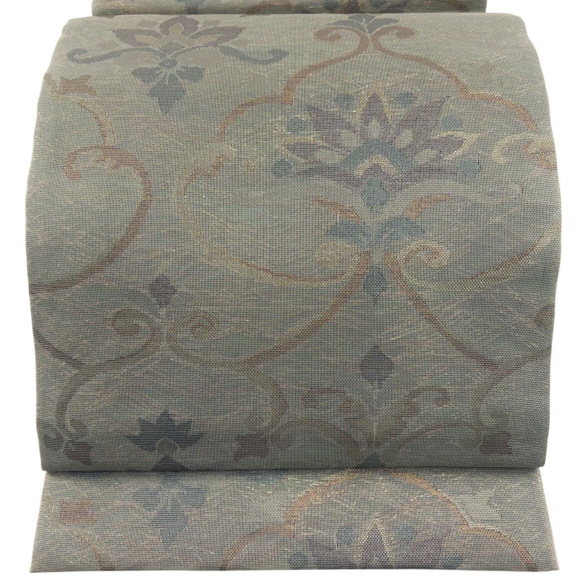 【美品】 袋帯 秀品 夏帯 紗 草花 幾何学模様 箔 灰緑 六通 正絹