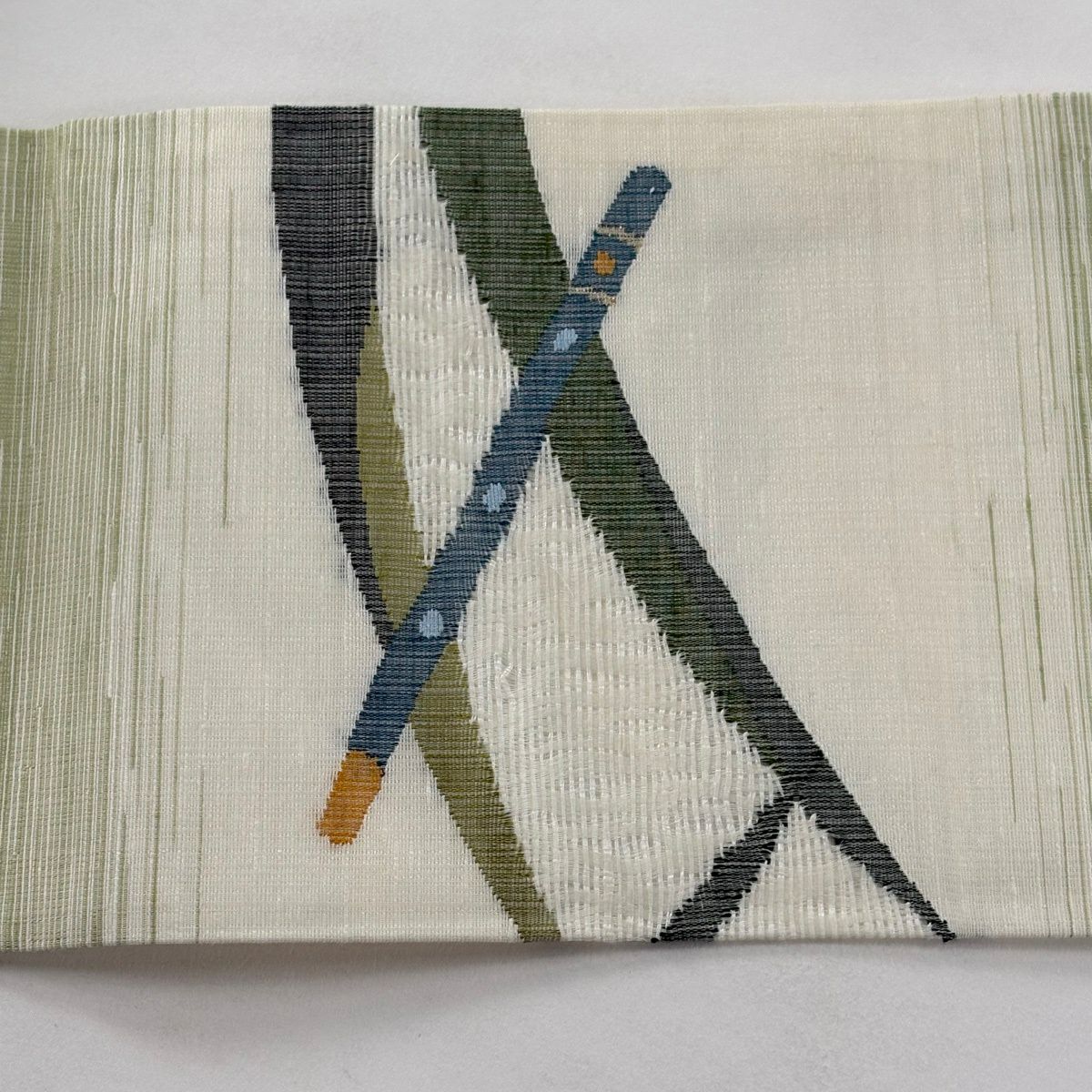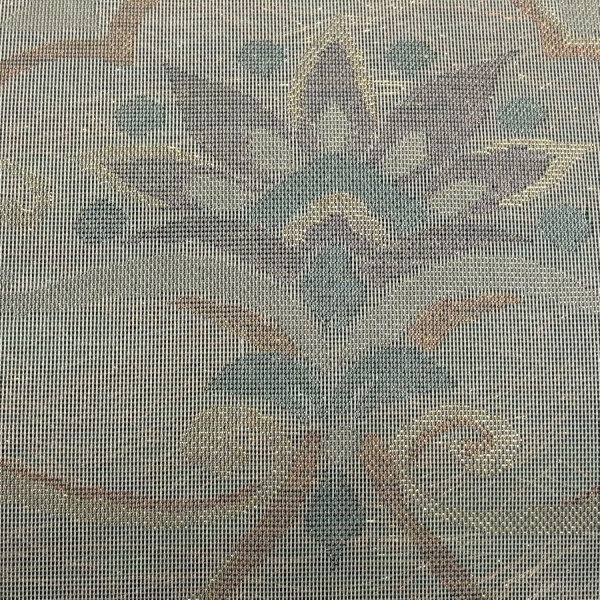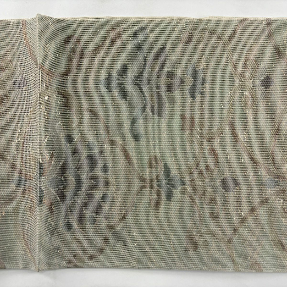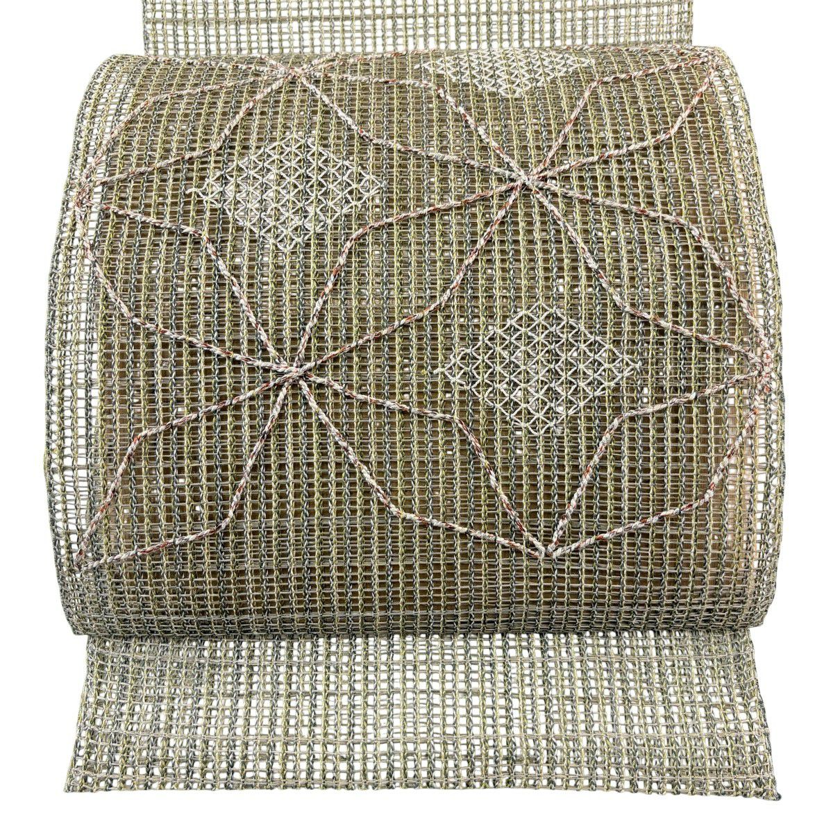 【美品】 袋帯 秀品 夏帯 紗 草花 幾何学模様 箔 灰緑 六通 正絹