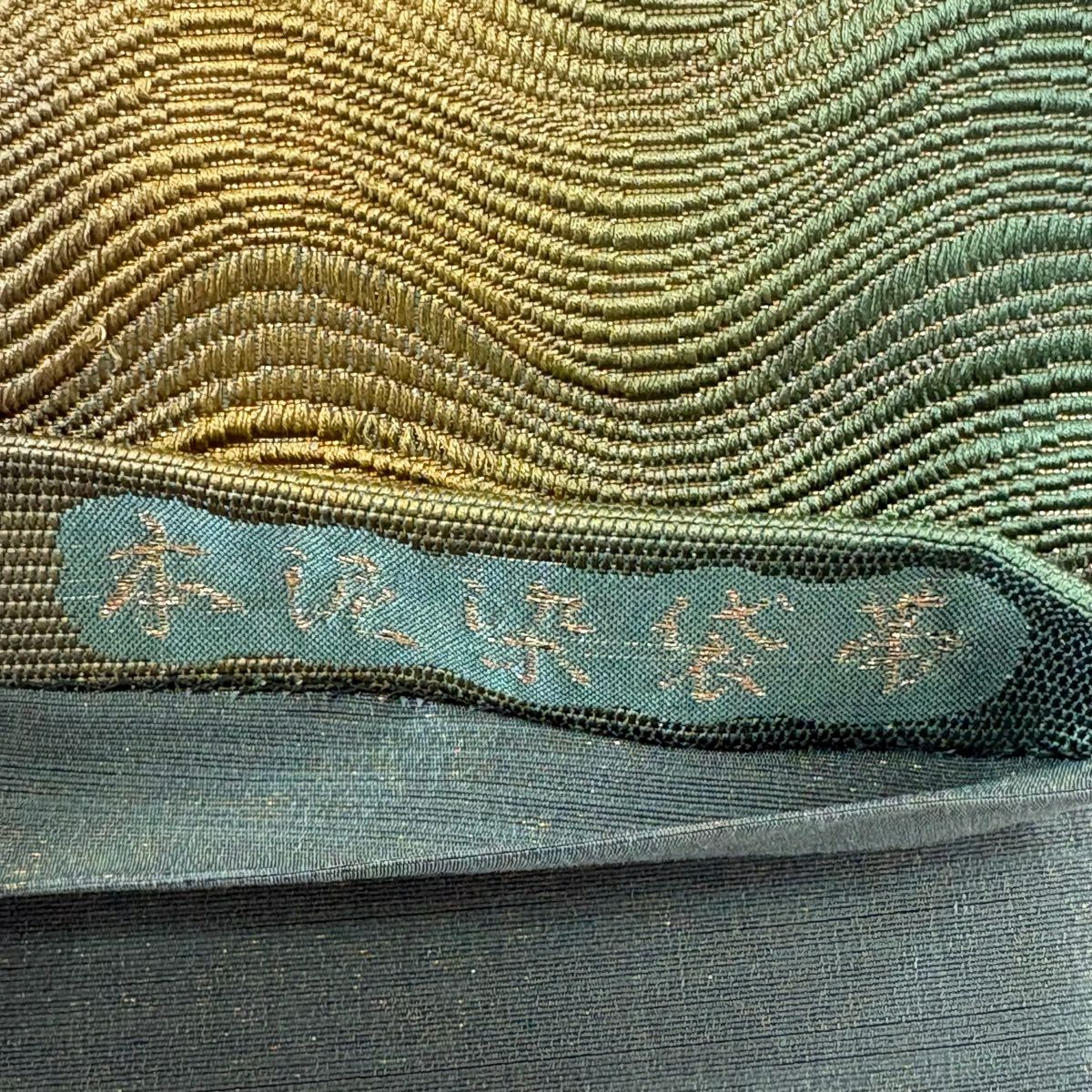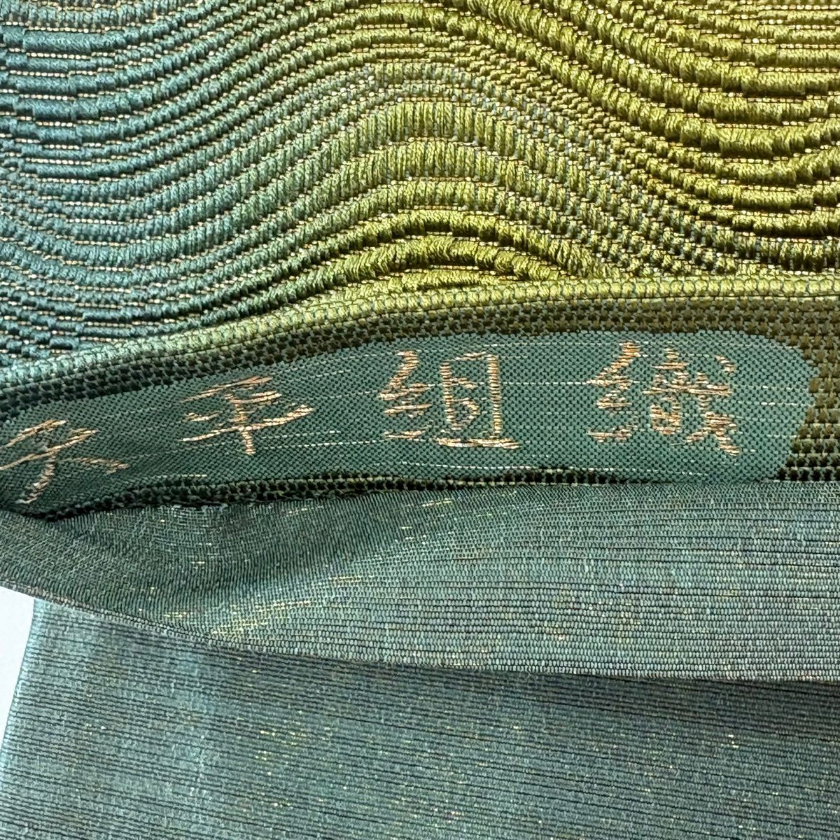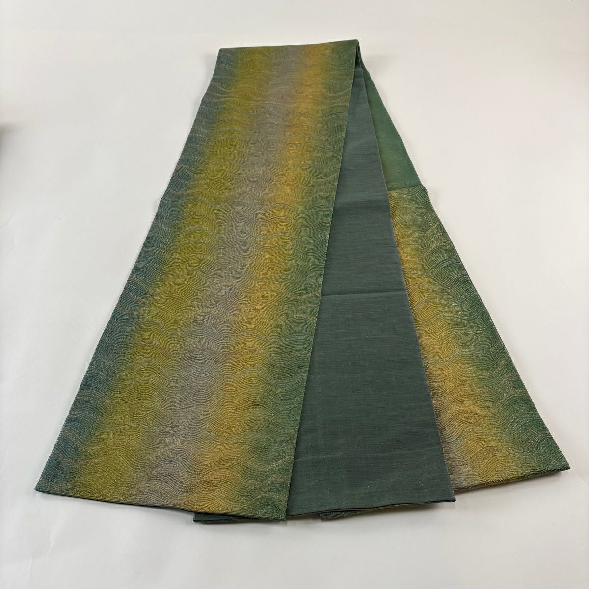 【美品】 袋帯 秀品 天平組織 よろけ縞 金糸 本泥染 緑 六通 正絹