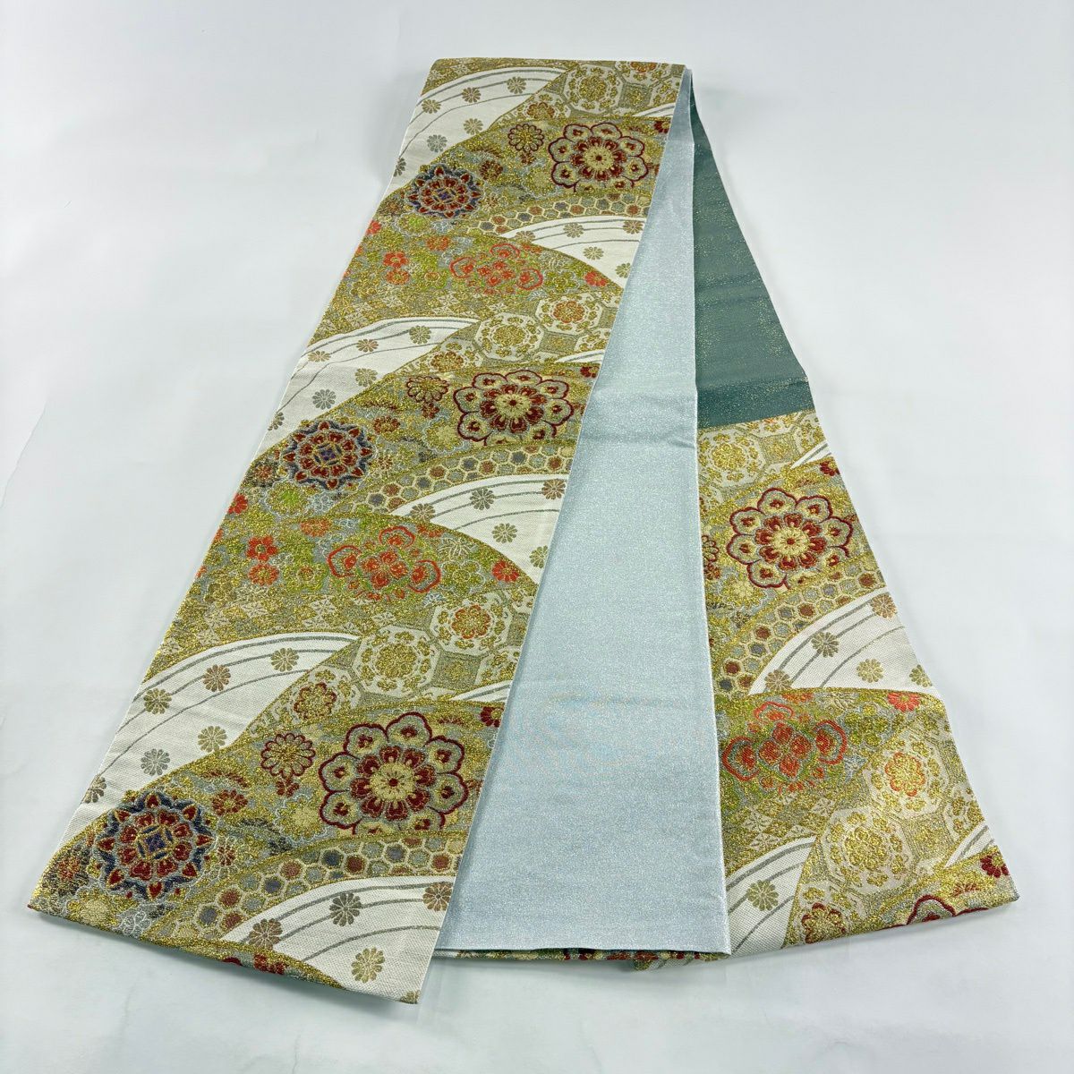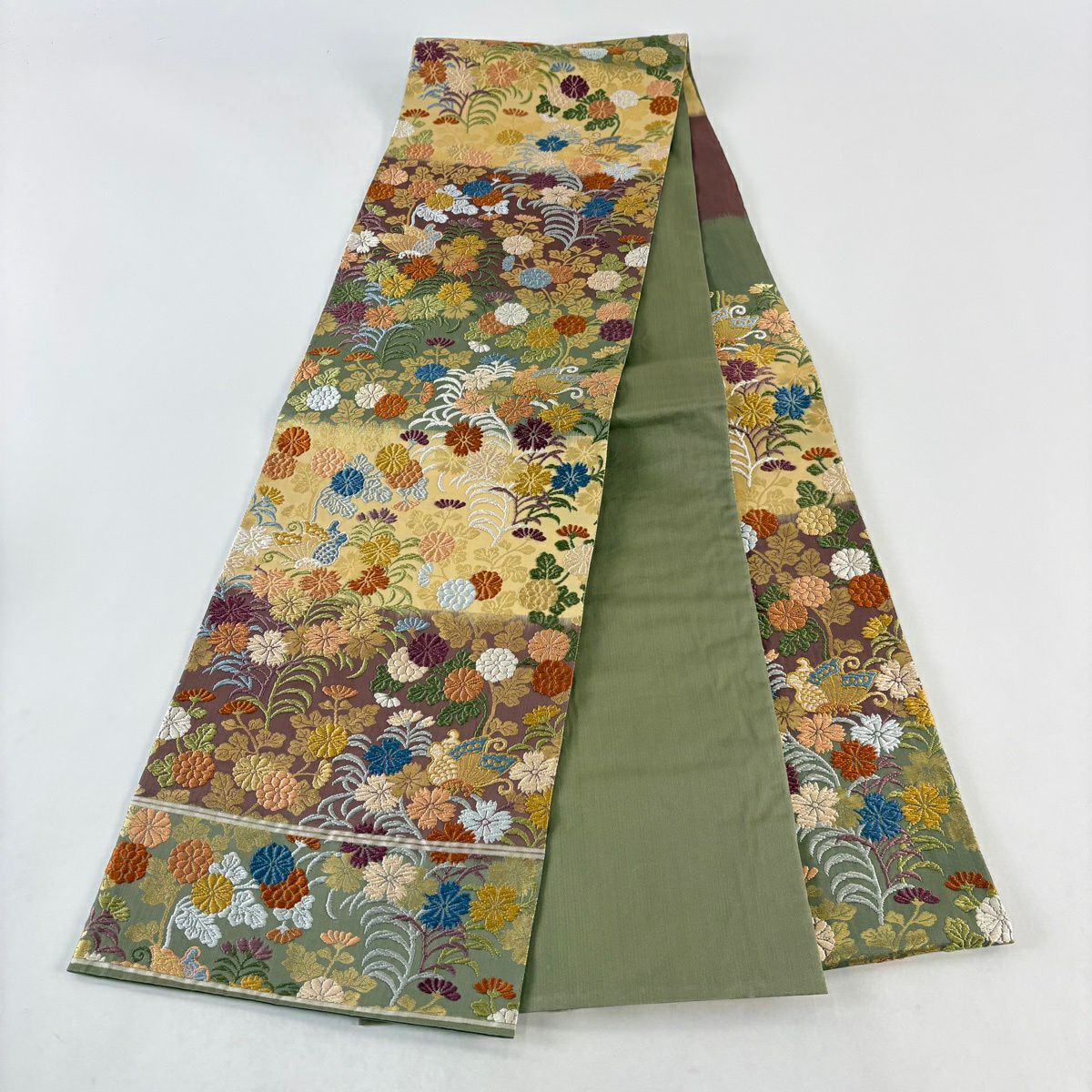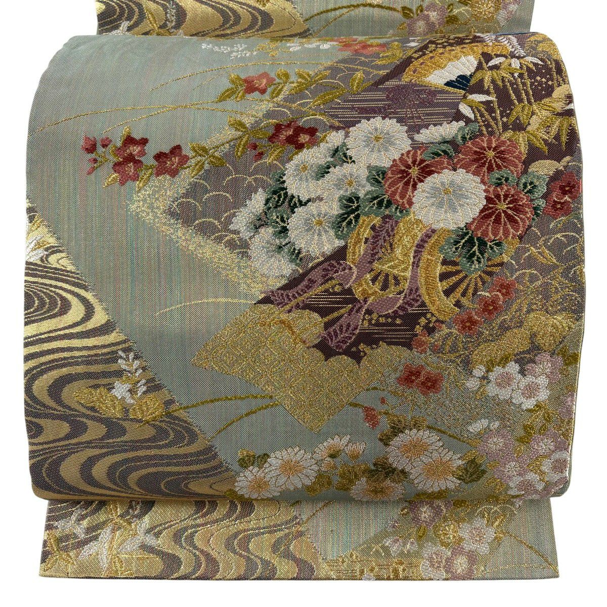 【美品】 袋帯 秀品 証紙あり 花車 草花 金糸 箔 薄緑 六通 正絹