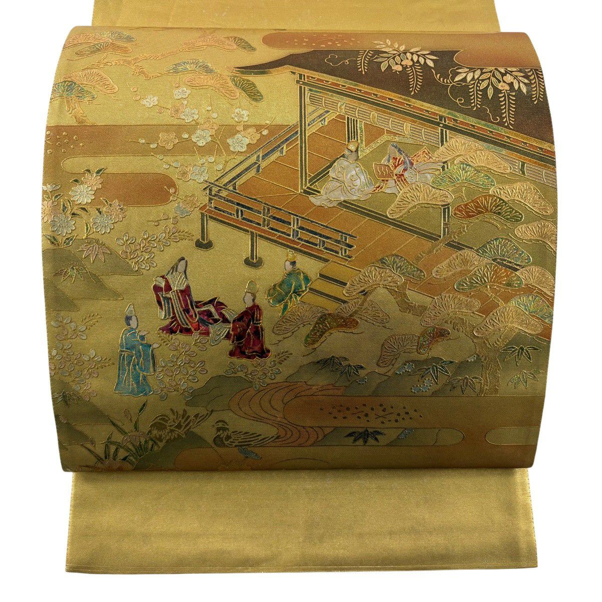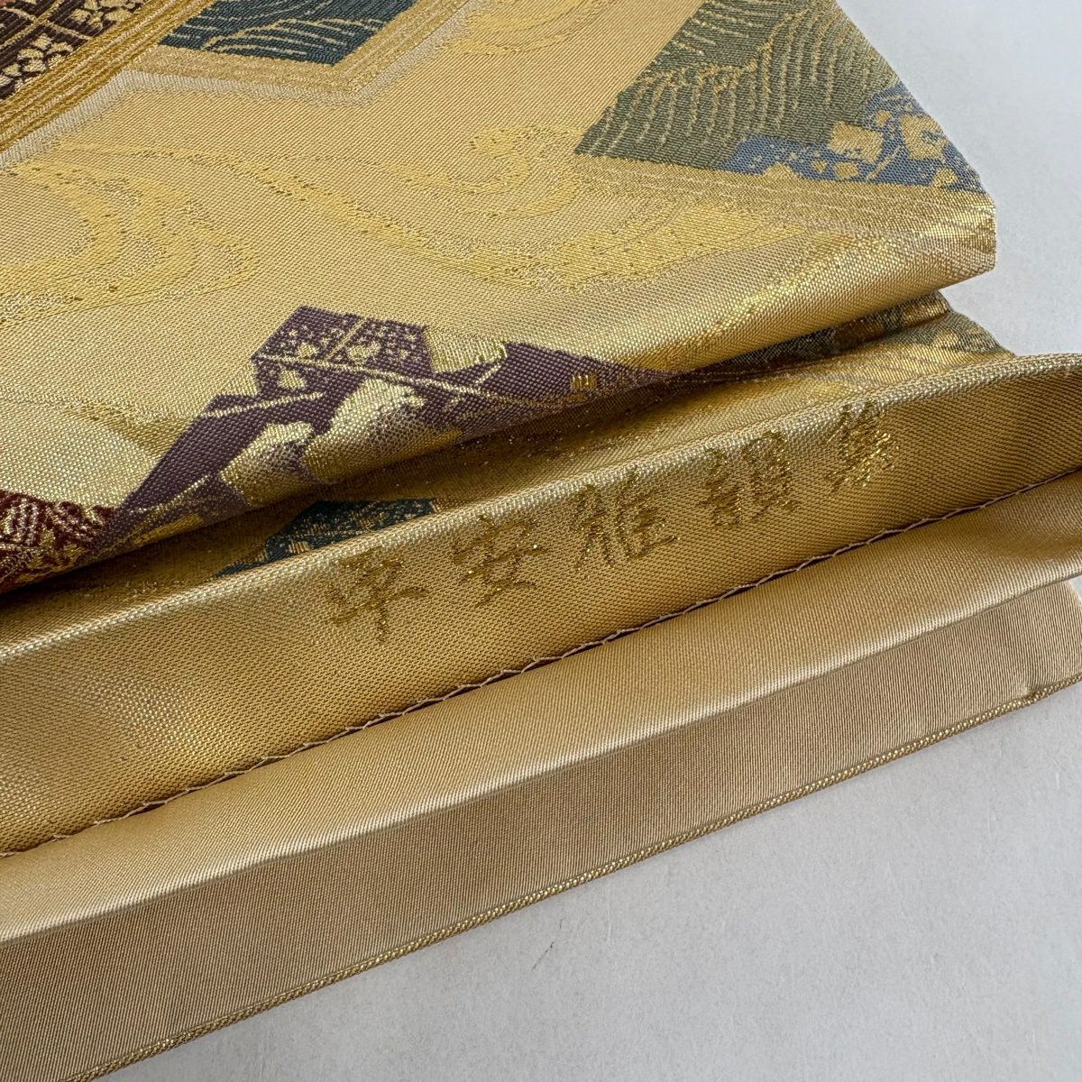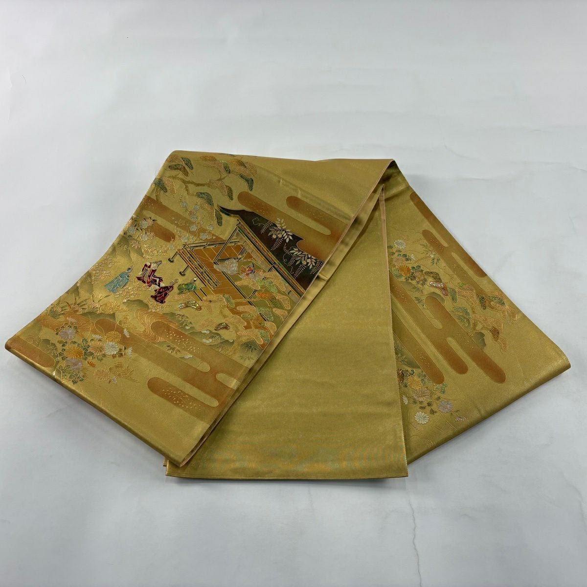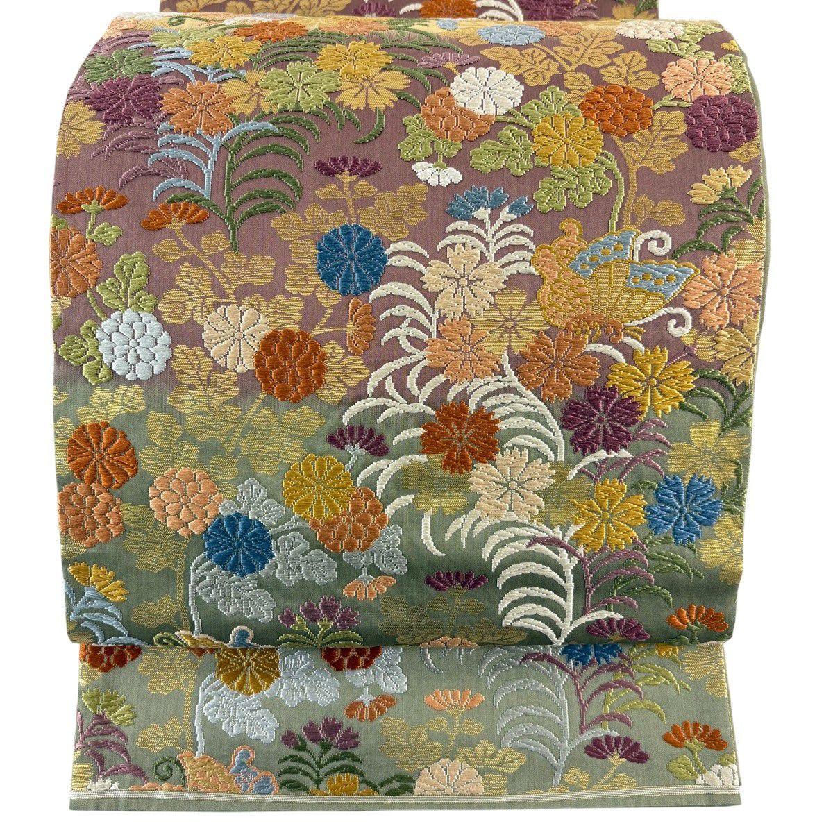 【美品】 袋帯 秀品 証紙あり 花車 草花 金糸 箔 薄緑 六通 正絹