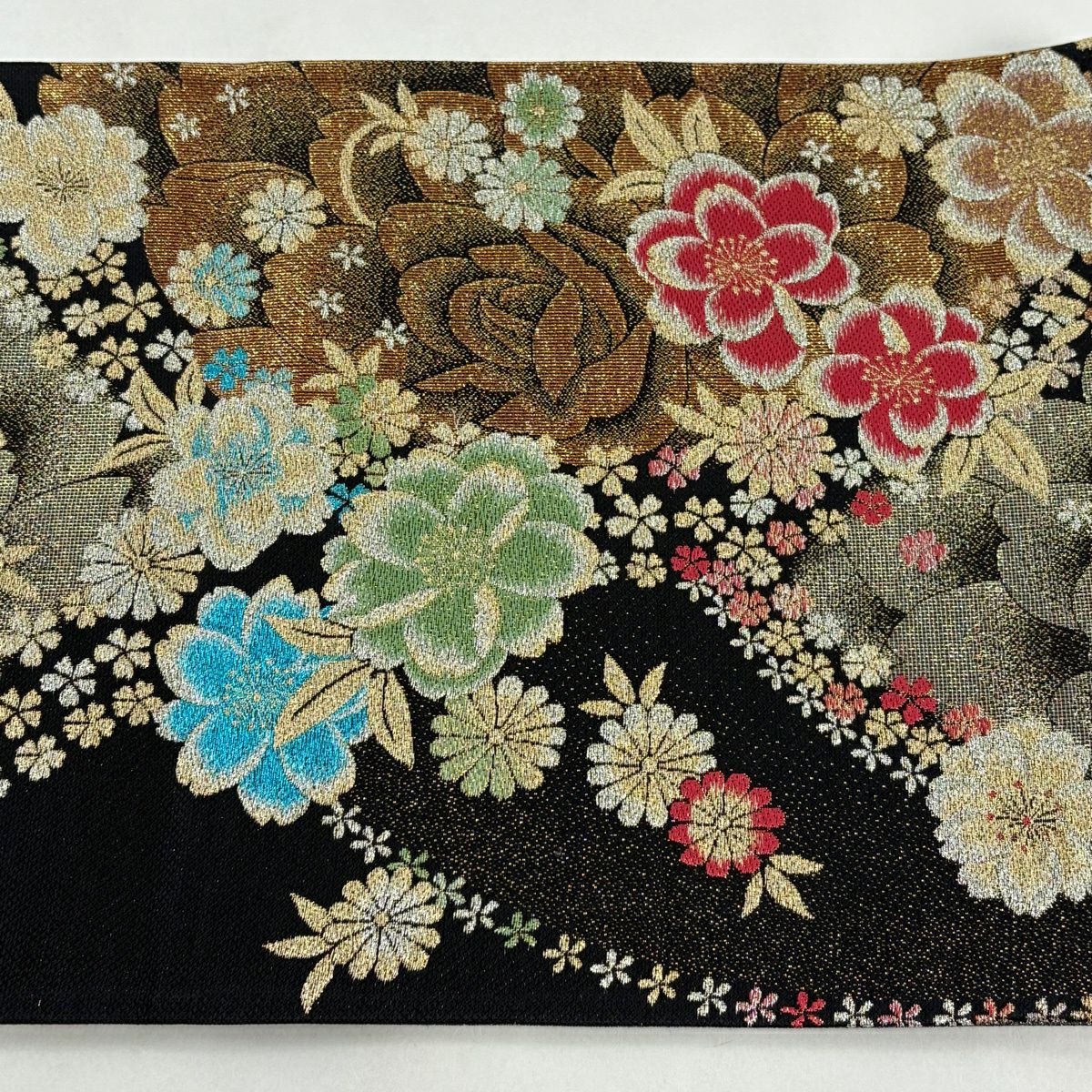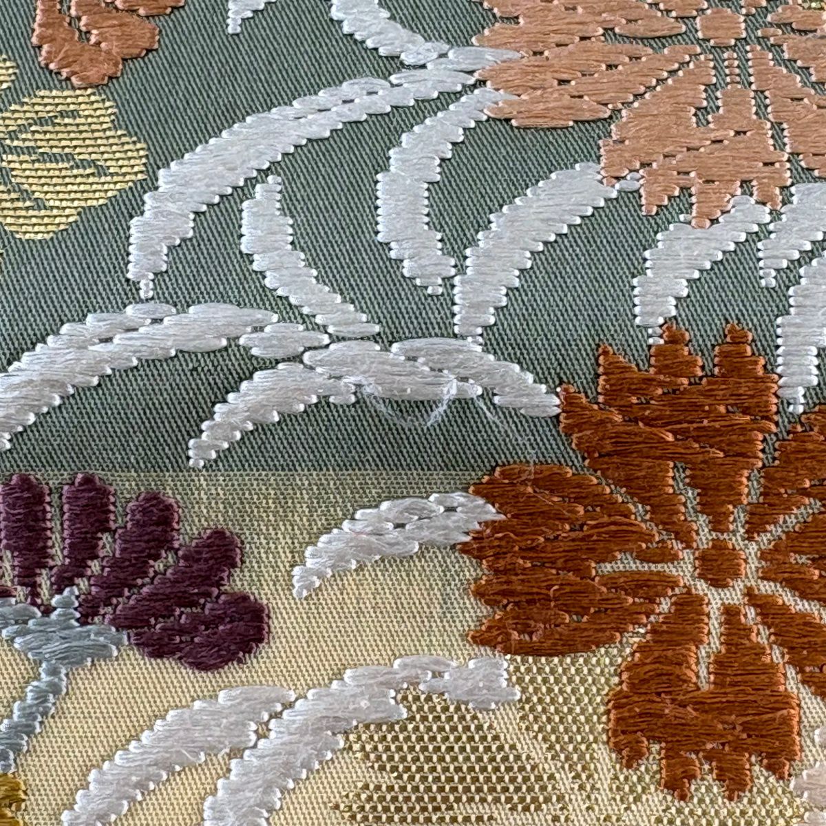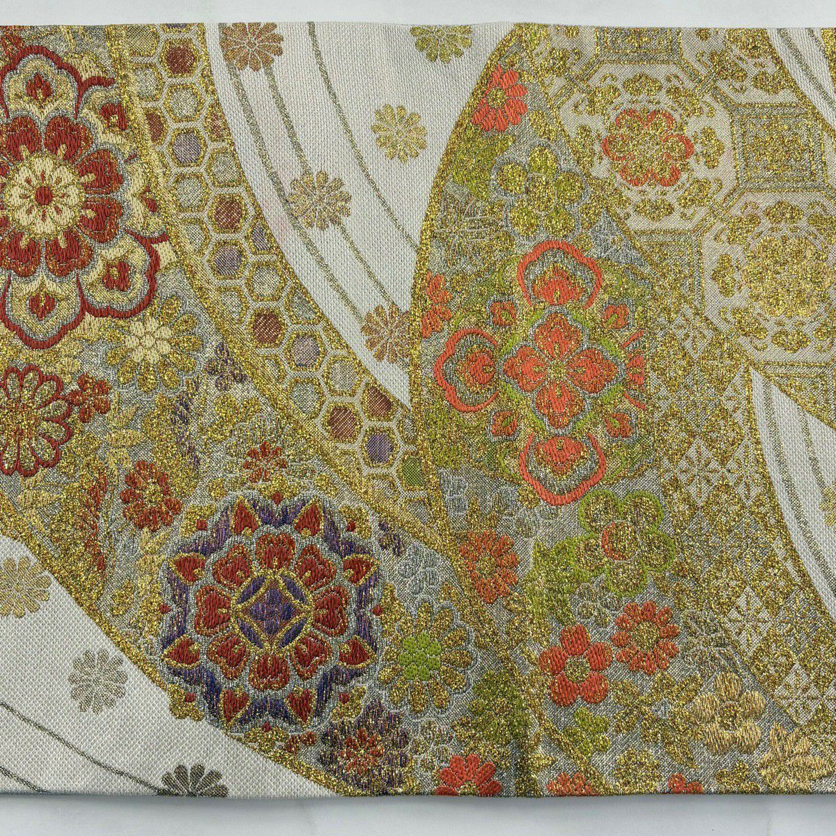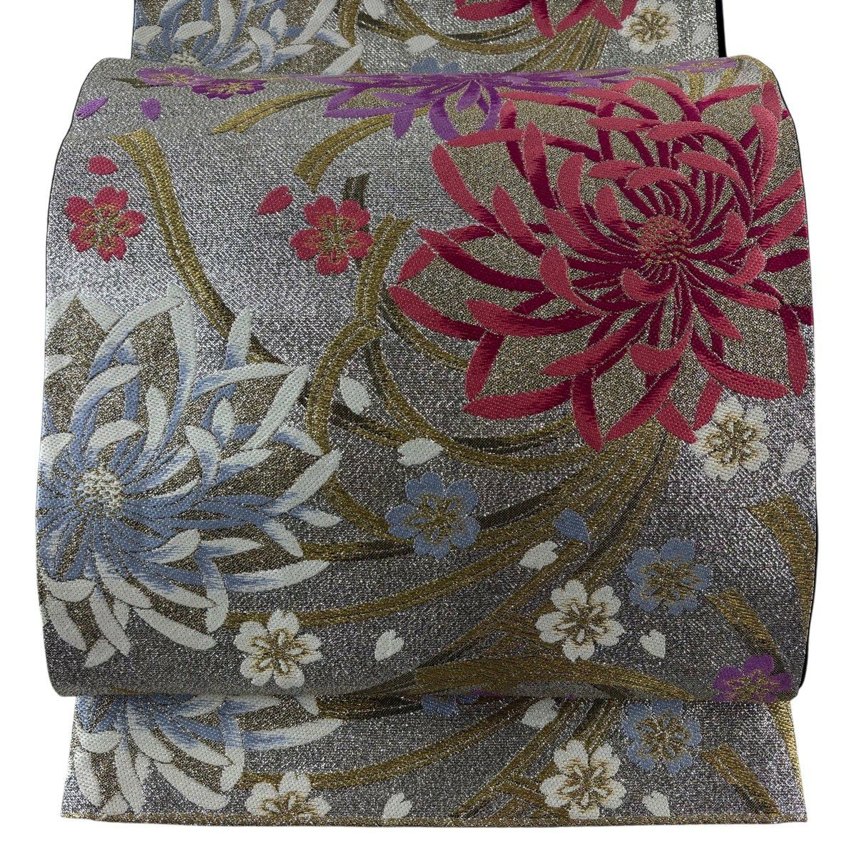 【美品】 袋帯 秀品 振袖向き 乱菊花集い 金糸 箔 銀色 六通 正絹