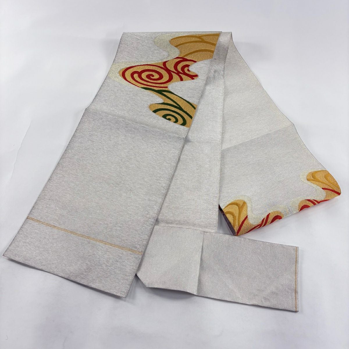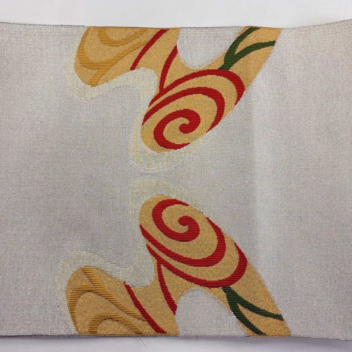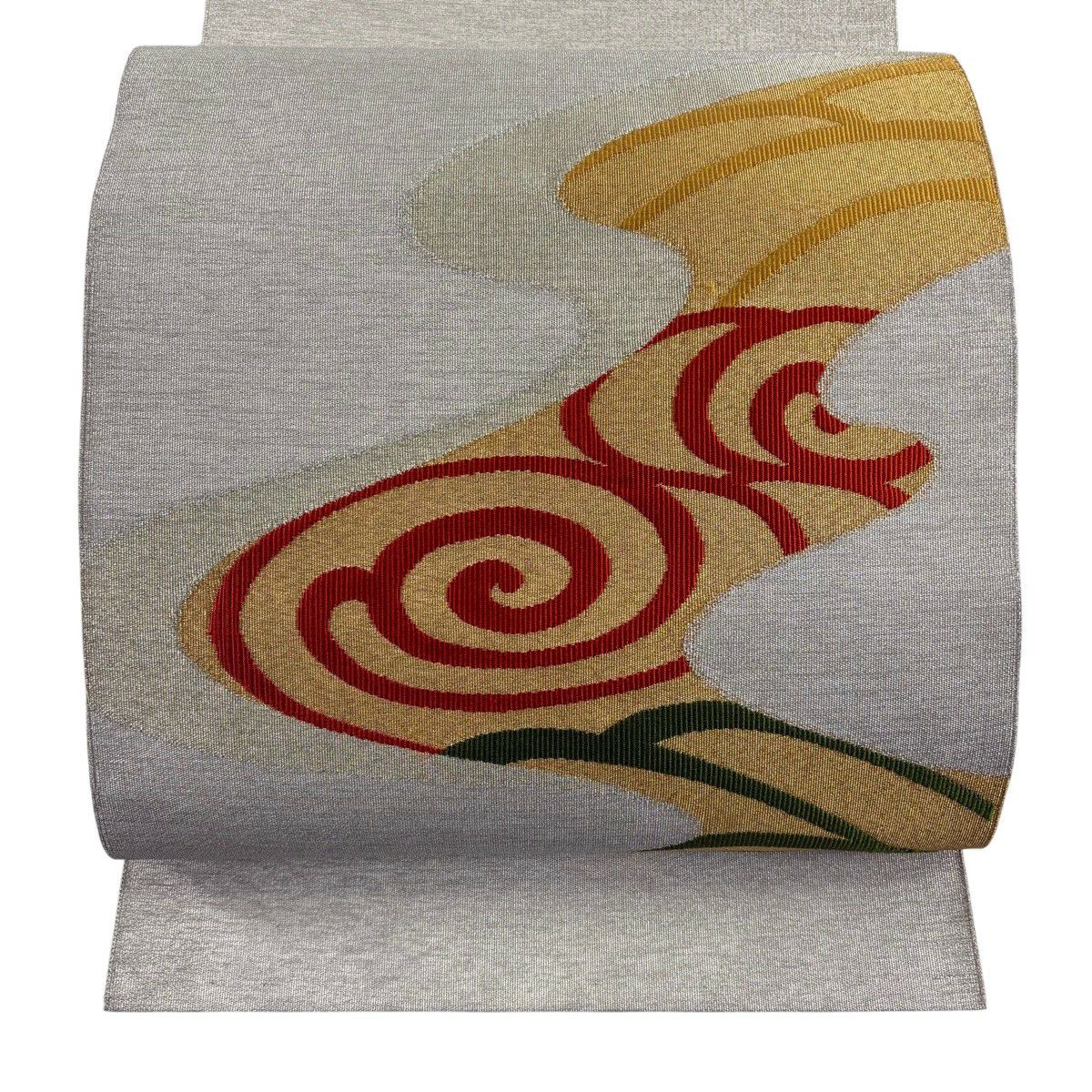 【美品】 名古屋帯 秀品 八寸名古屋帯 松葉仕立て 渦巻き 流水 灰白 正絹