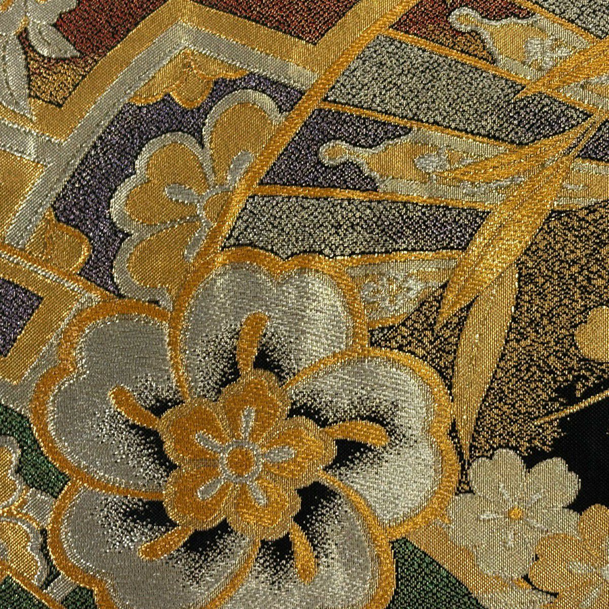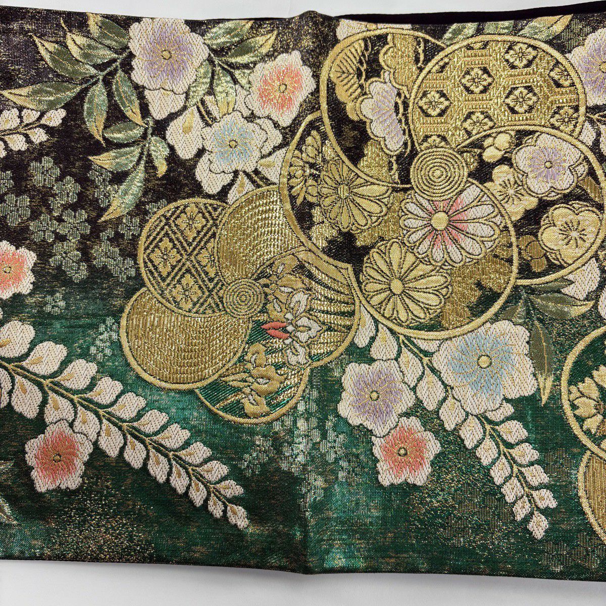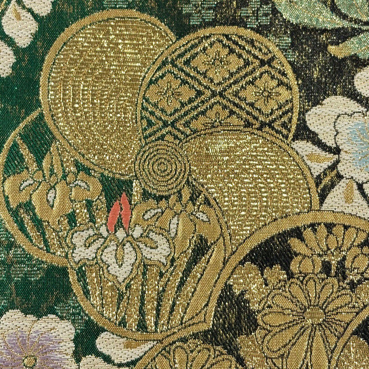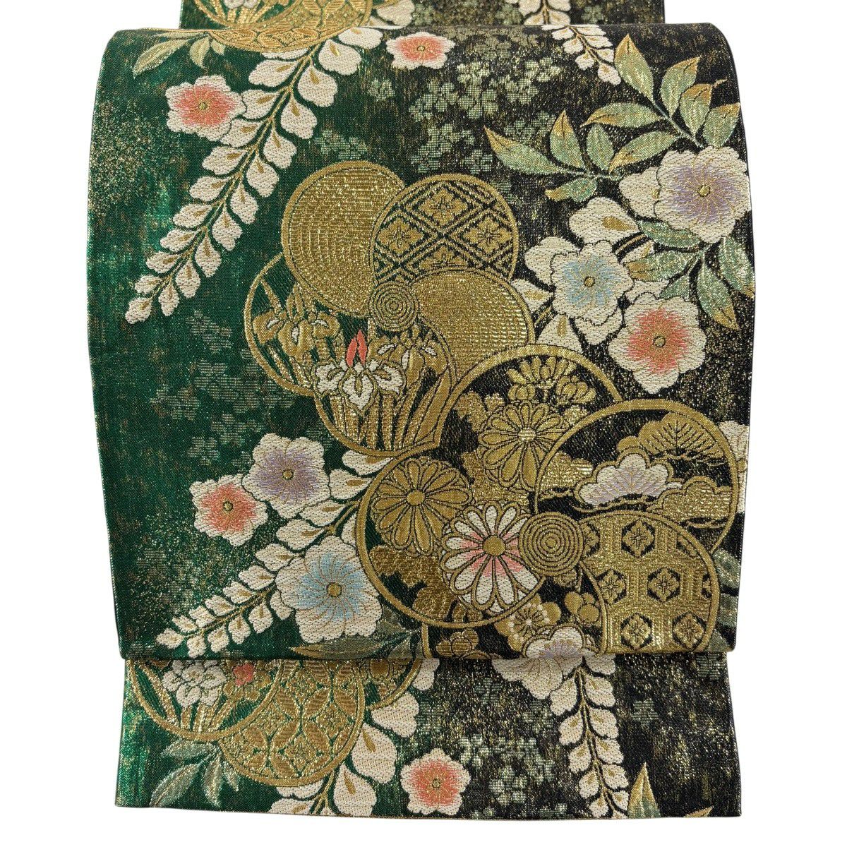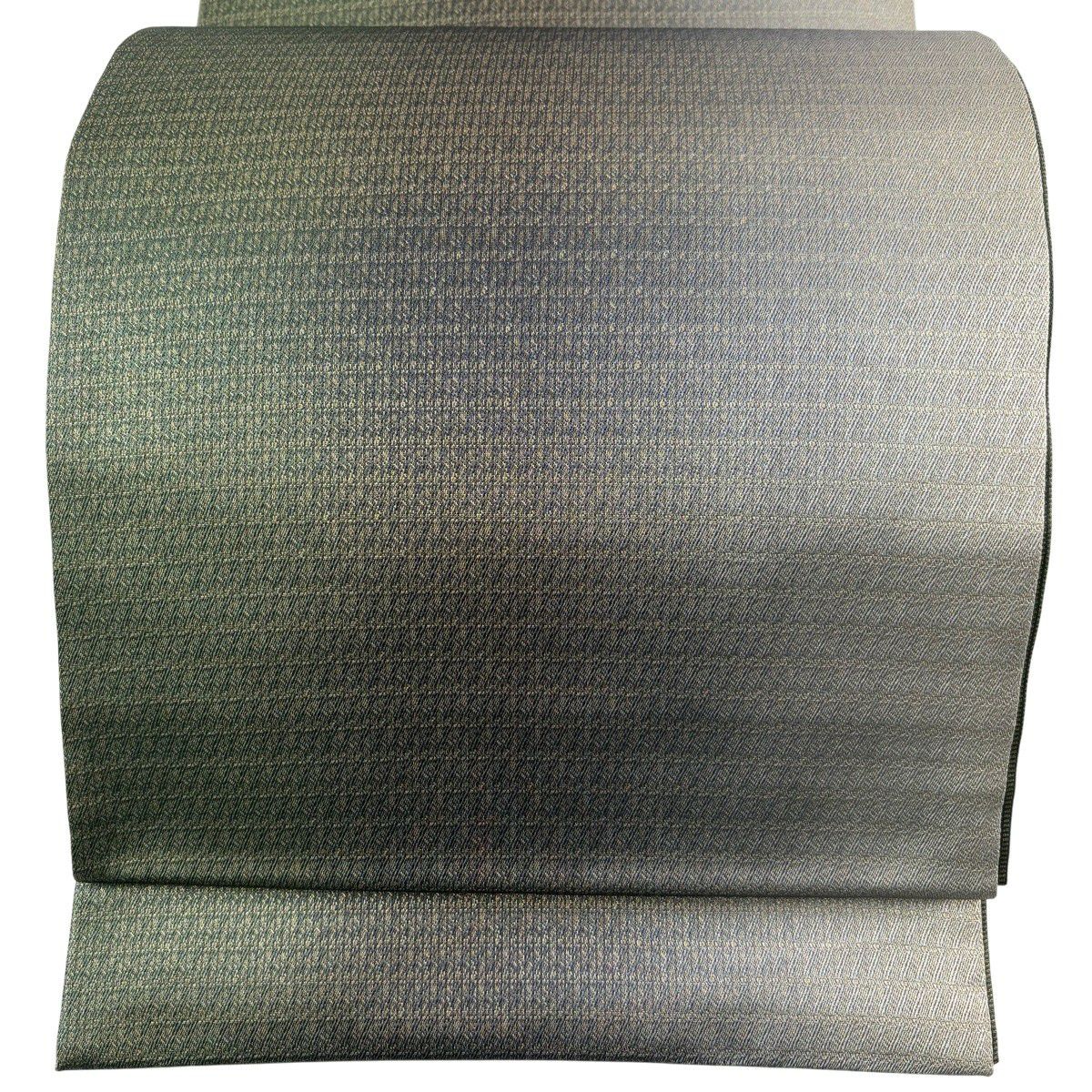 【美品】 袋帯 秀品 証紙あり 幾何学 金糸 ぼかし 深緑 全通 正絹