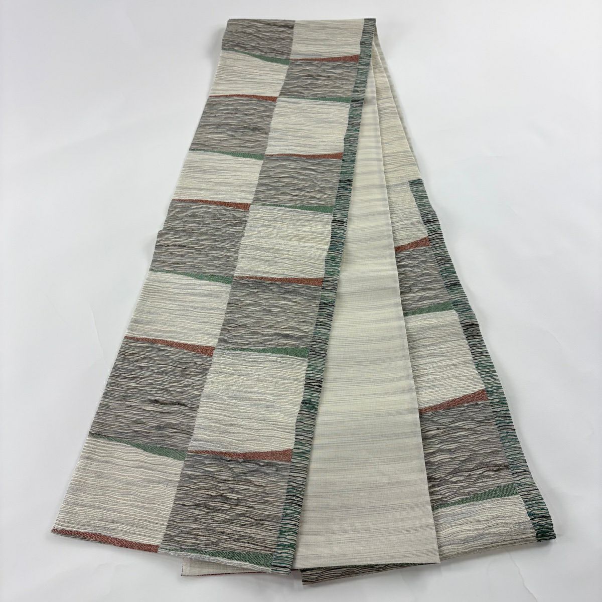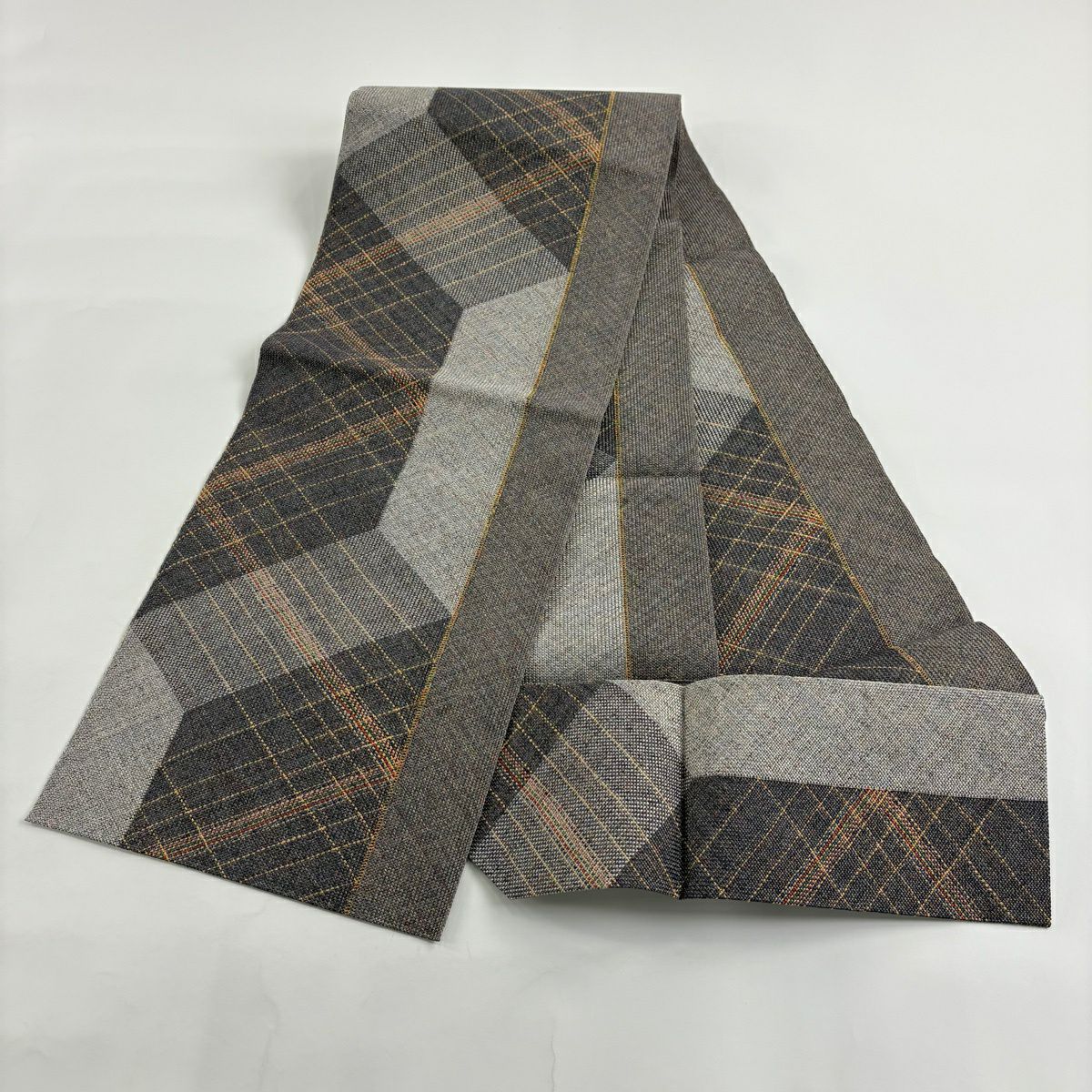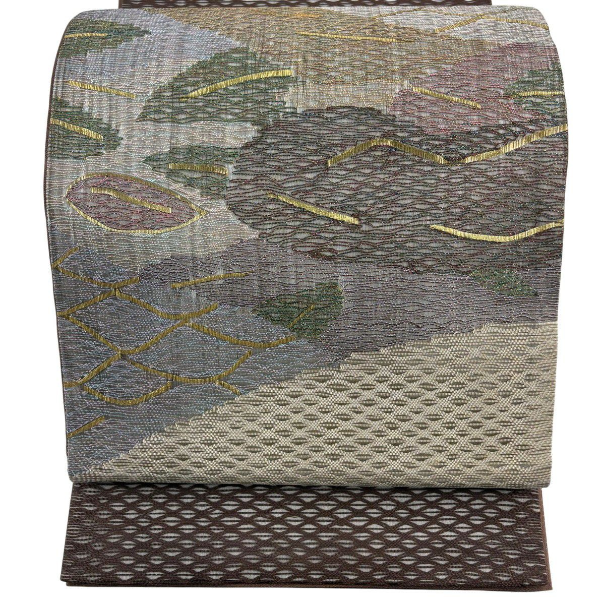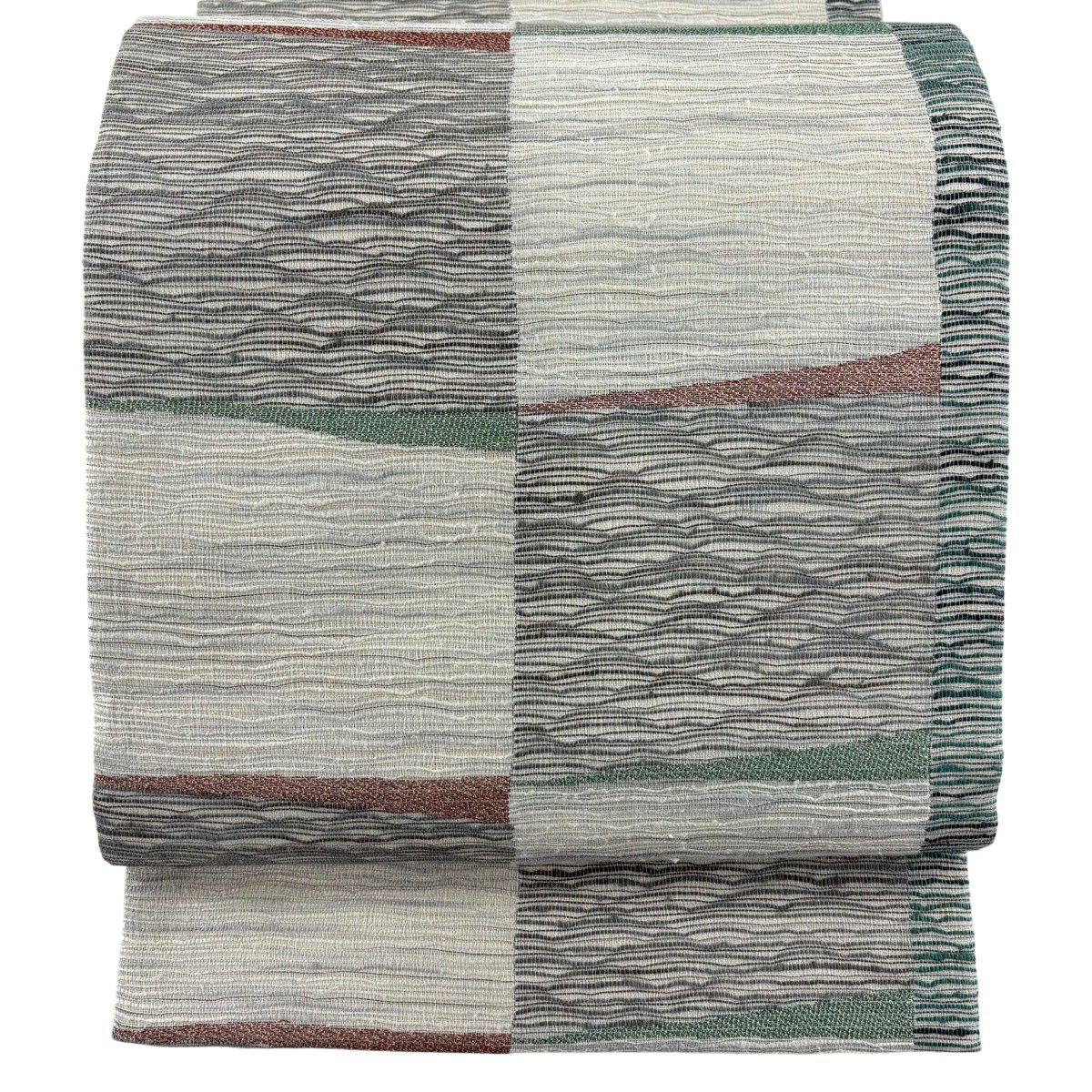【美品】 袋帯 秀品 変わり市松 よろけ縞 銀糸 箔 灰色 六通 正絹