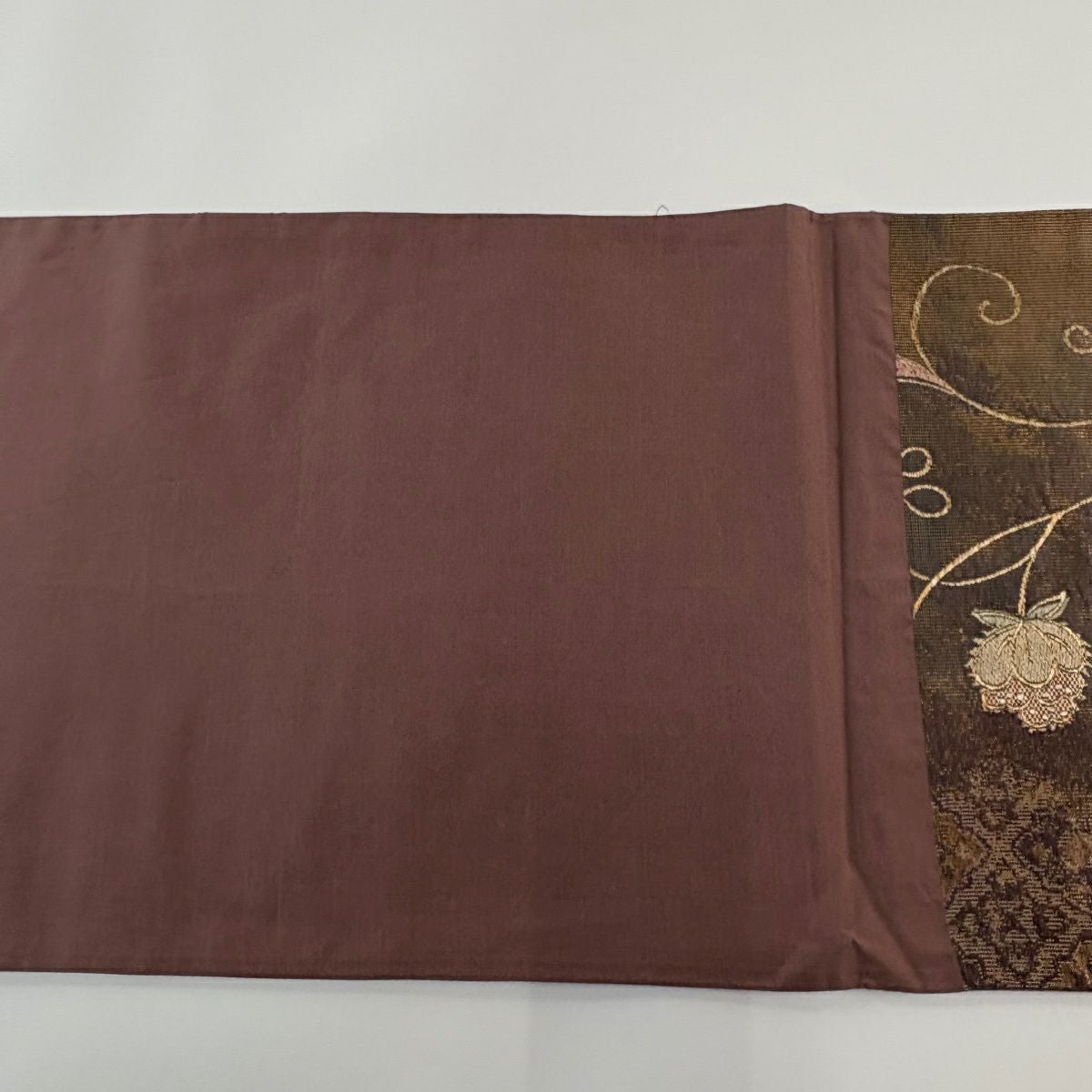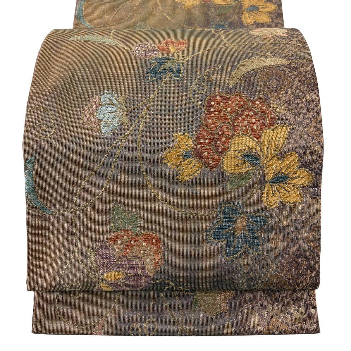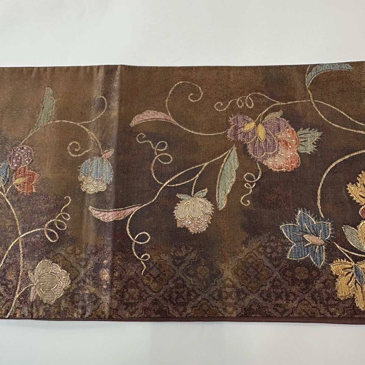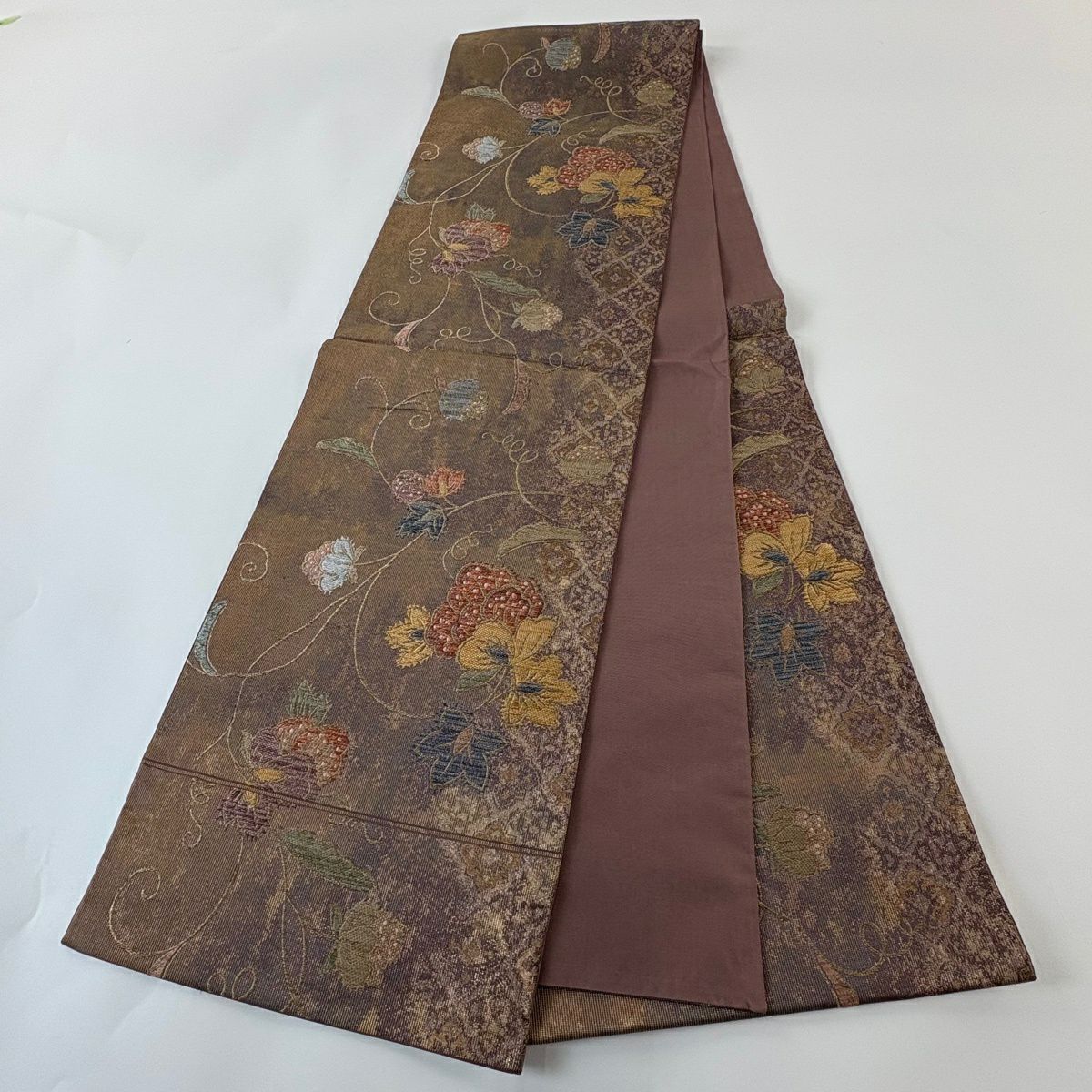 【美品】 袋帯 秀品 関西仕立て 花唐草 金銀糸 箔 茶色 六通 正絹
