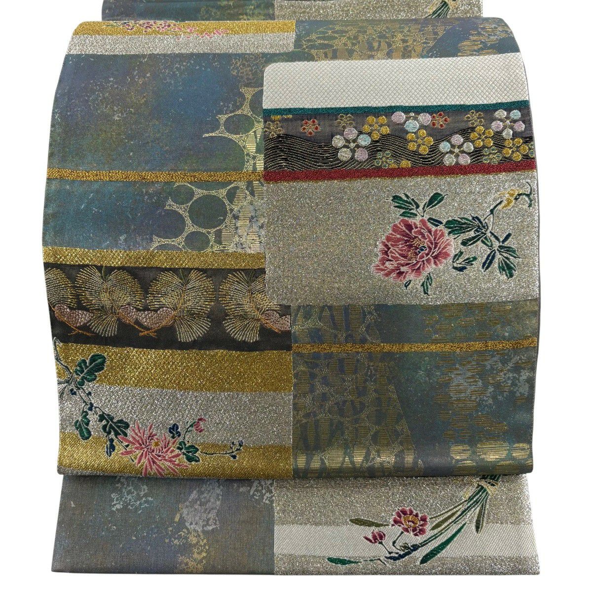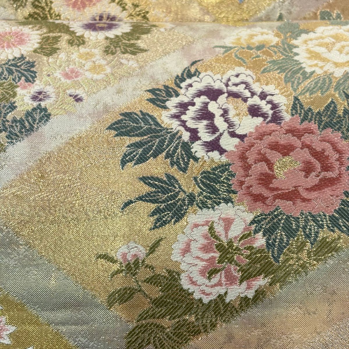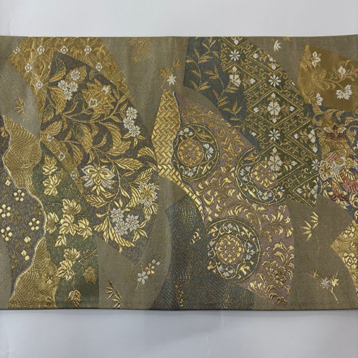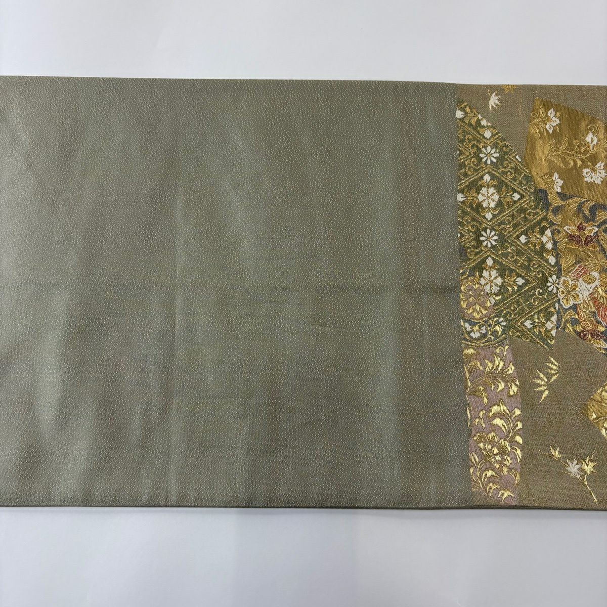 【美品】 袋帯 秀品 関西仕立て 花鳥 菱 金糸 箔 鶯色 六通 正絹