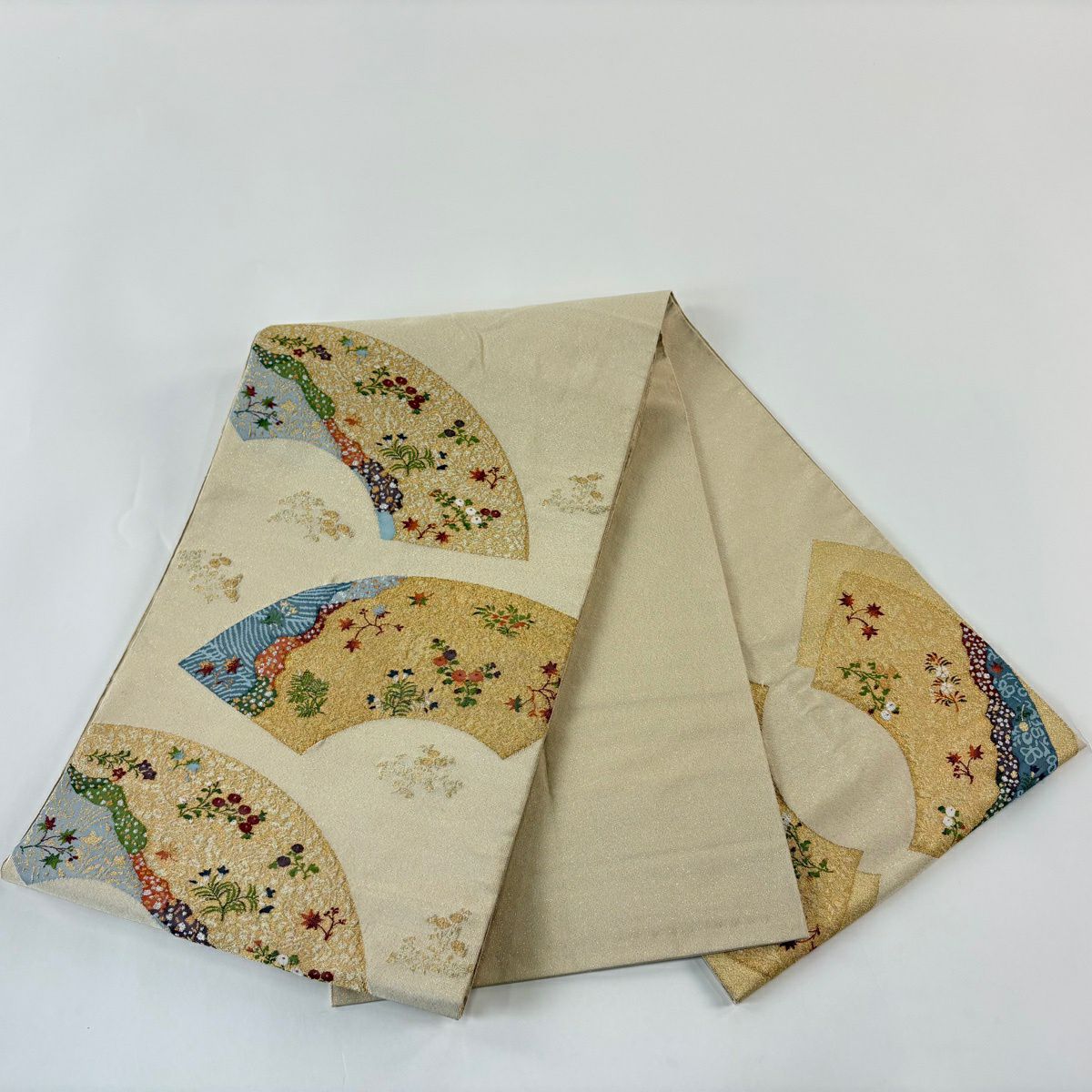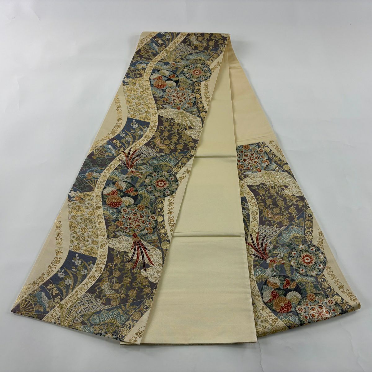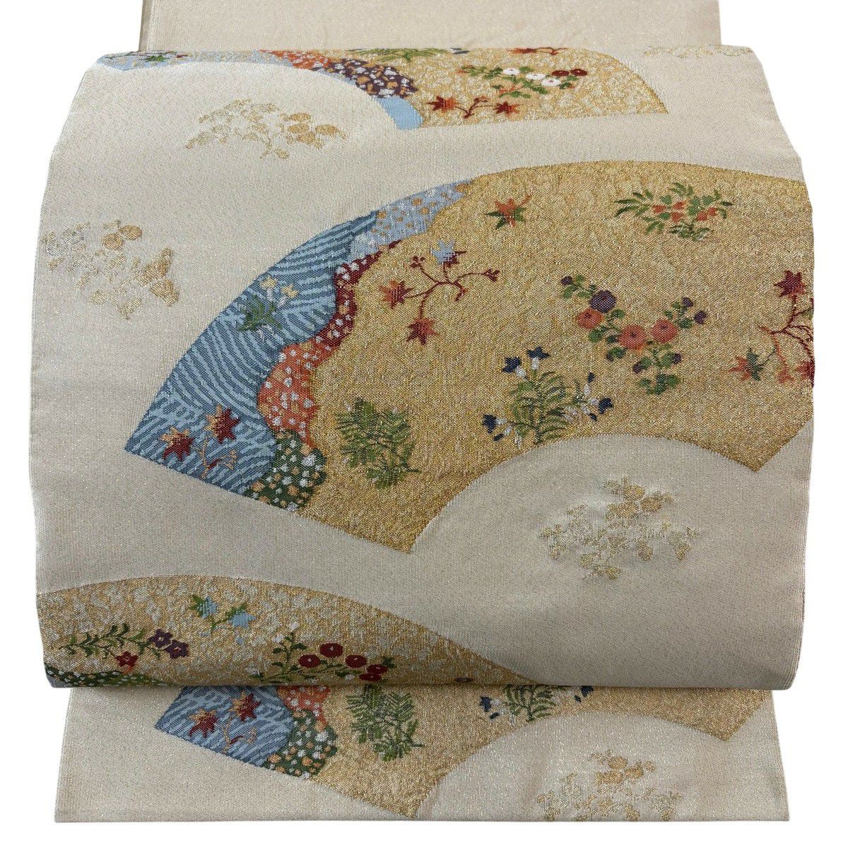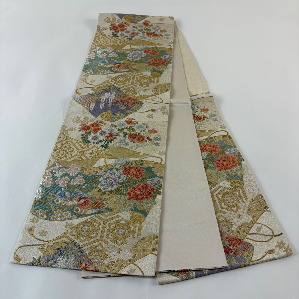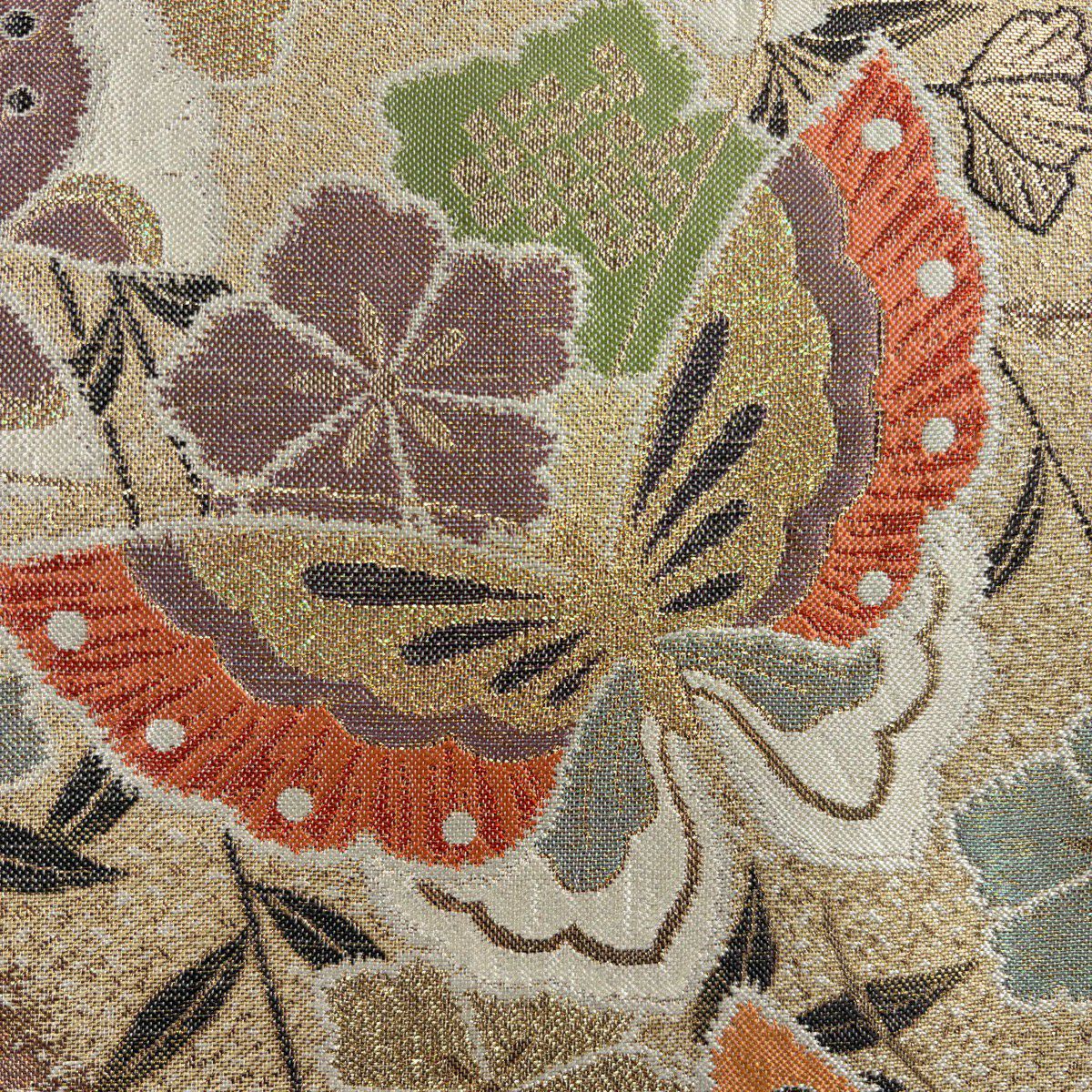 名古屋帯 秀品 松葉仕立て 八寸名古屋帯 扇面 草花 金銀糸 クリーム 正絹