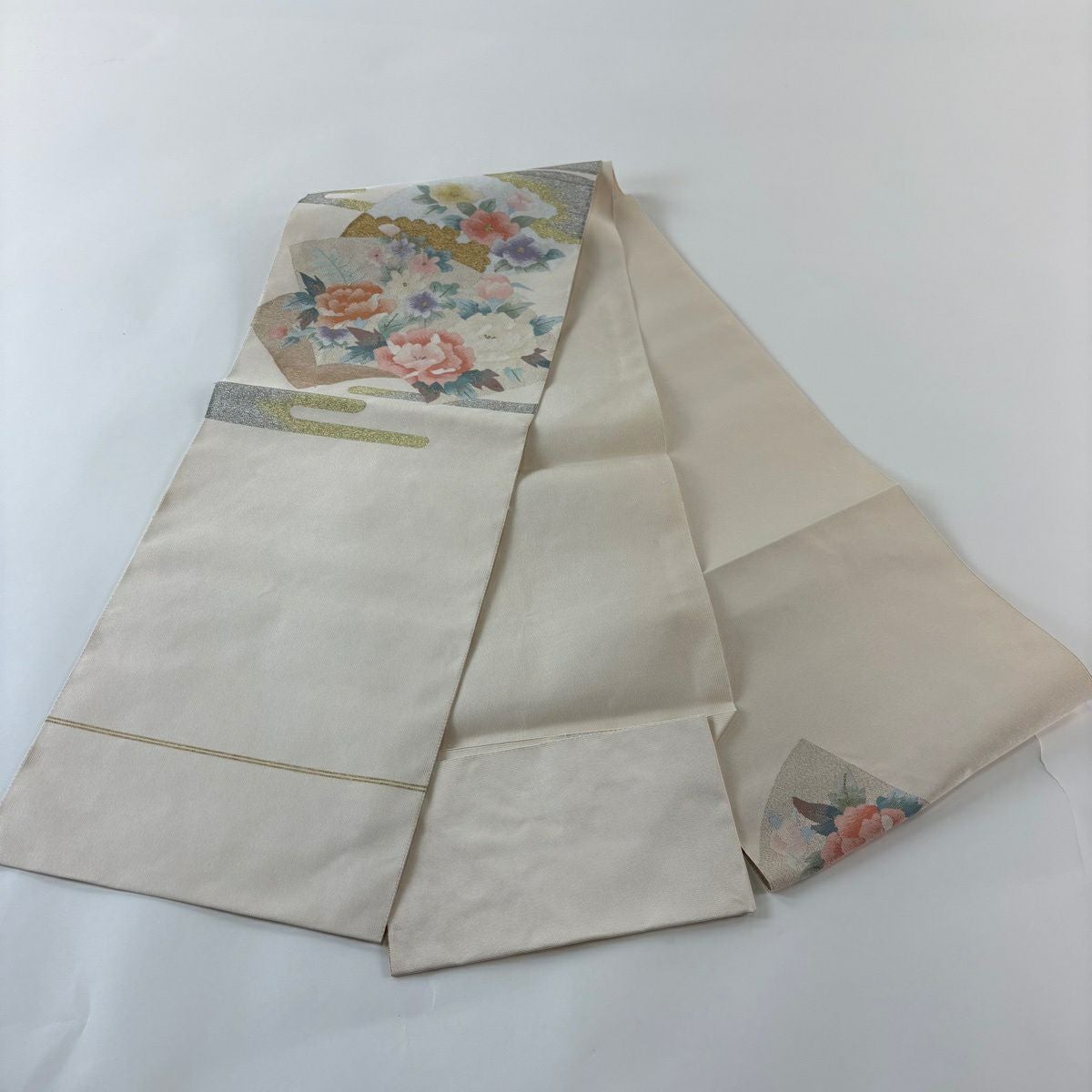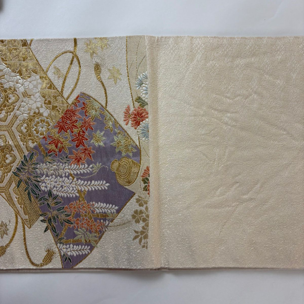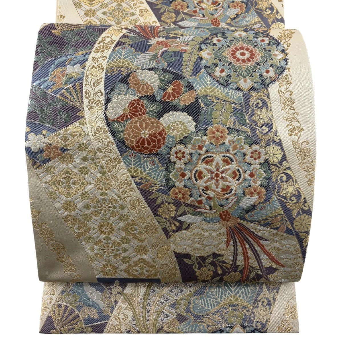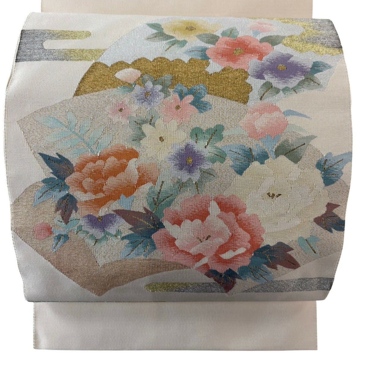 名古屋帯 秀品 松葉仕立て 八寸名古屋帯 扇面 草花 金銀糸 クリーム 正絹