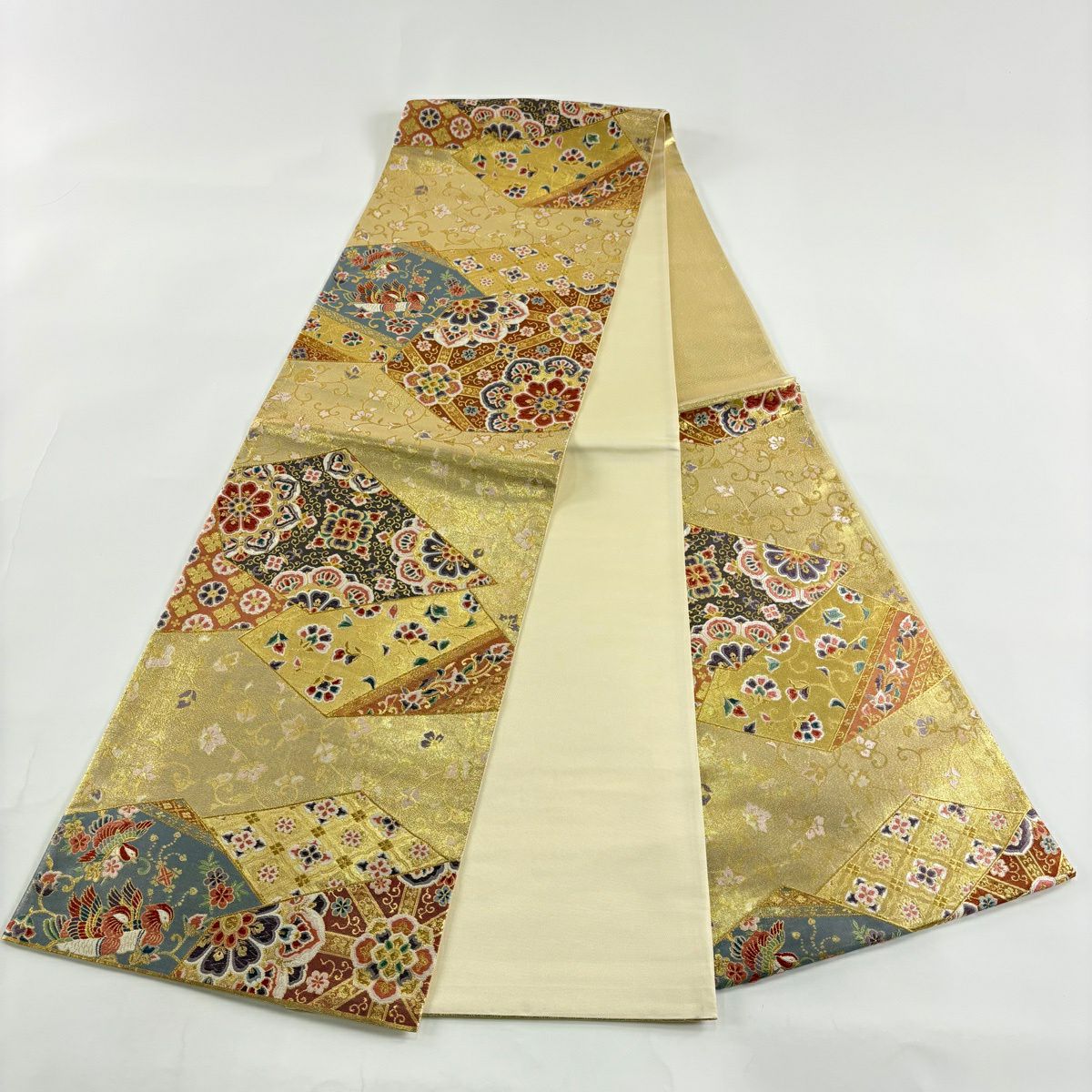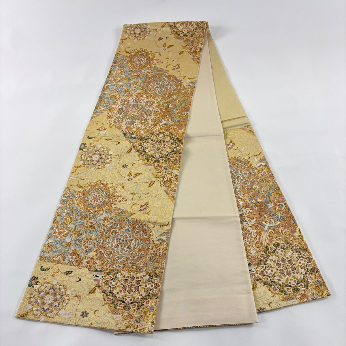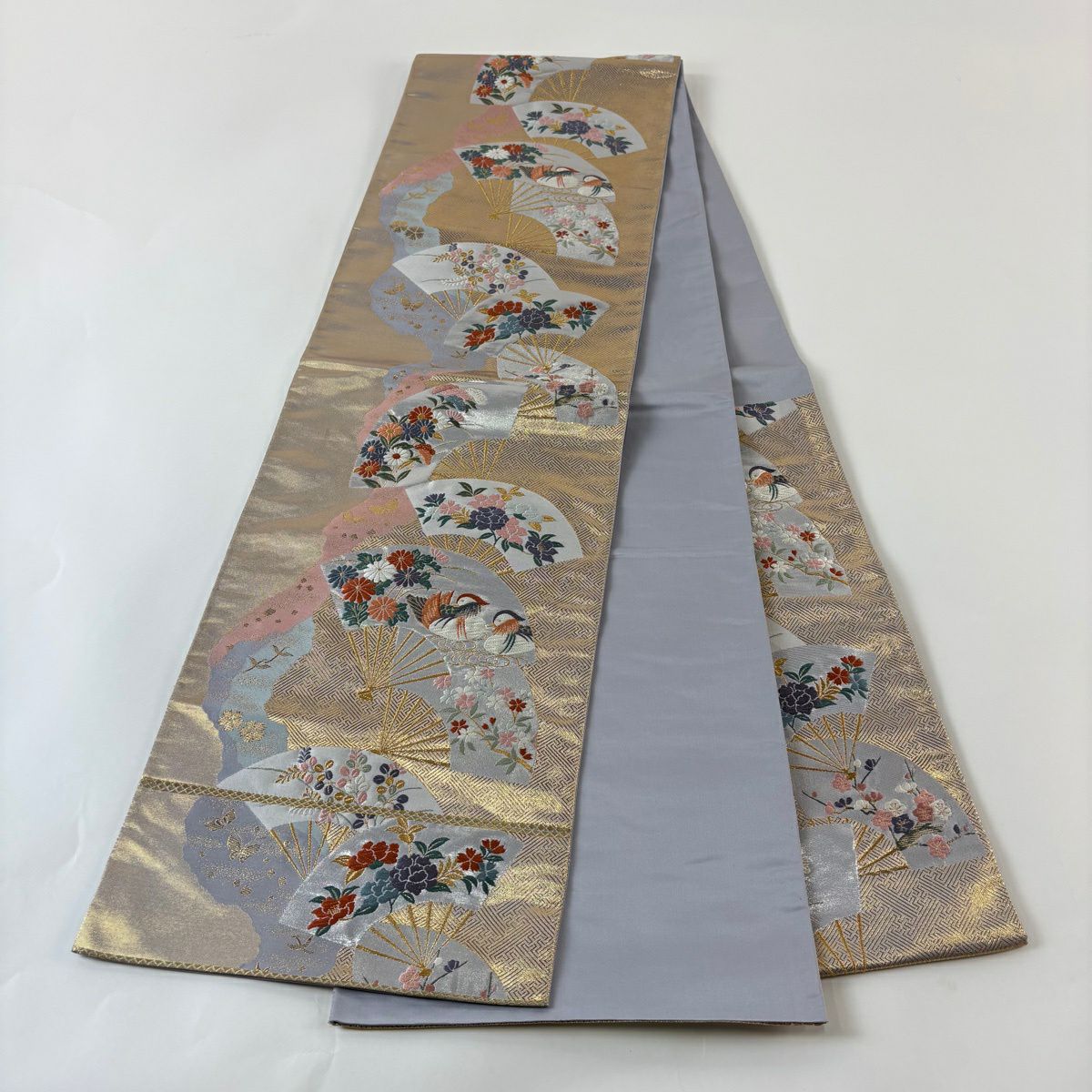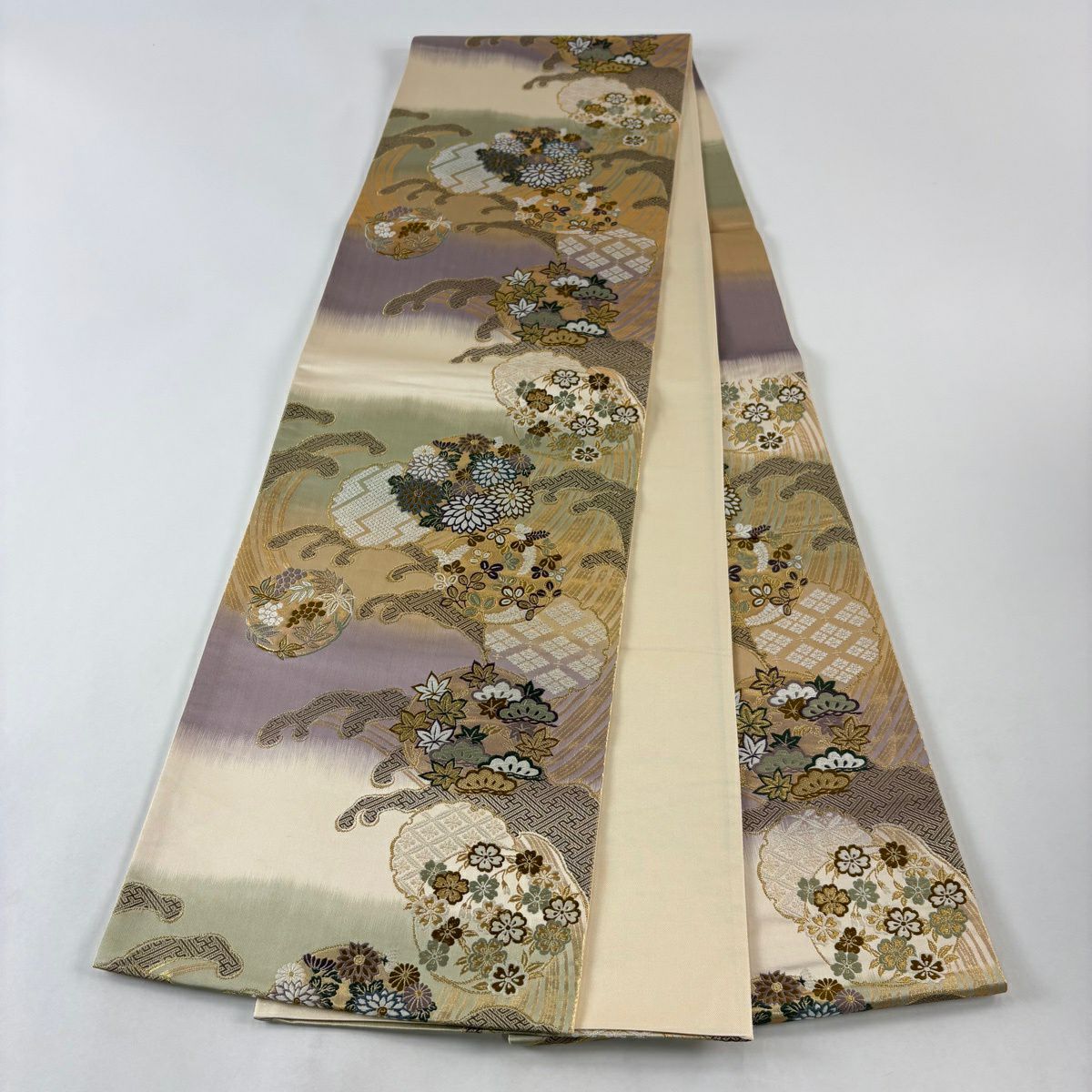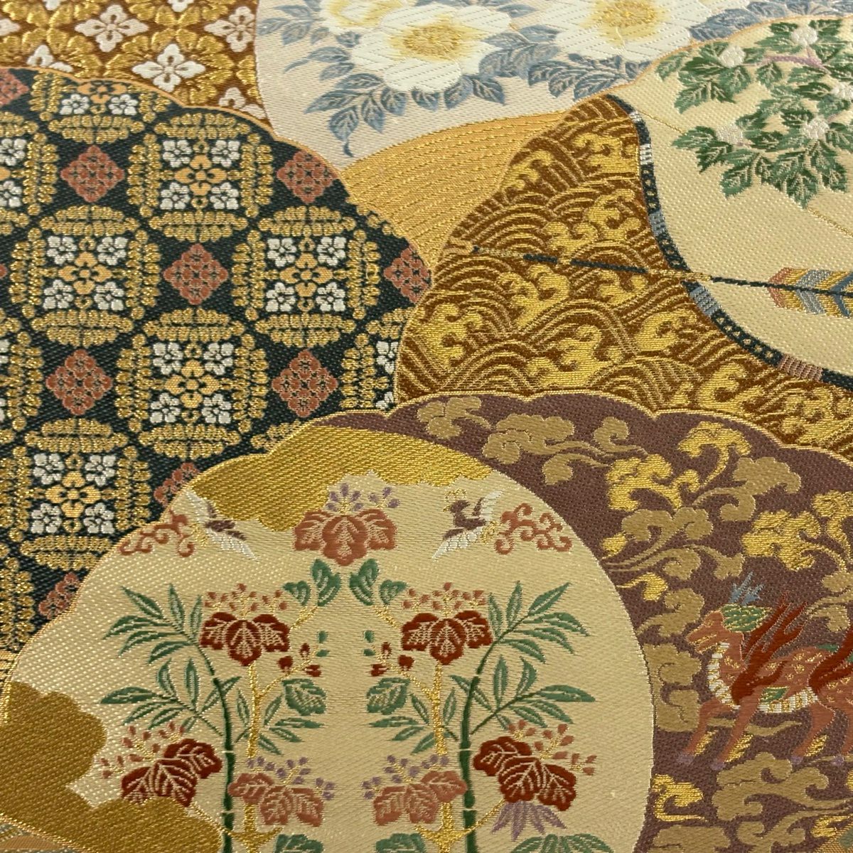 名古屋帯 秀品 松葉仕立て 八寸名古屋帯 扇面 草花 金銀糸 クリーム 正絹