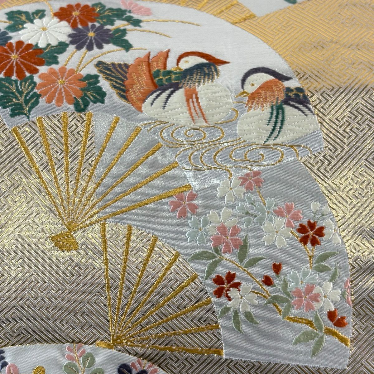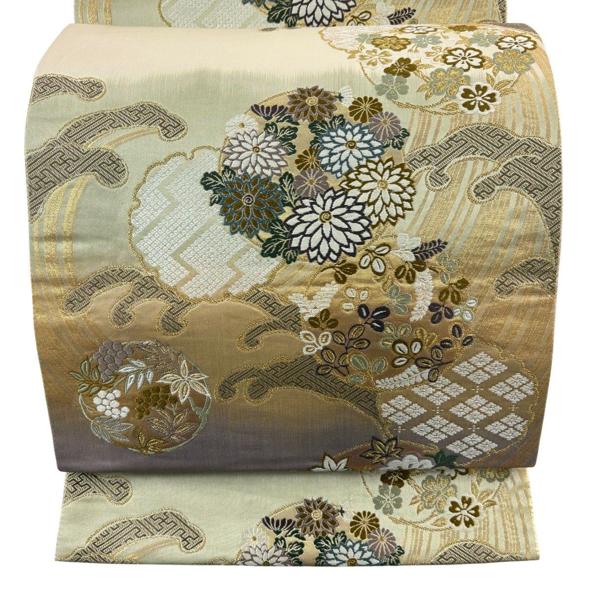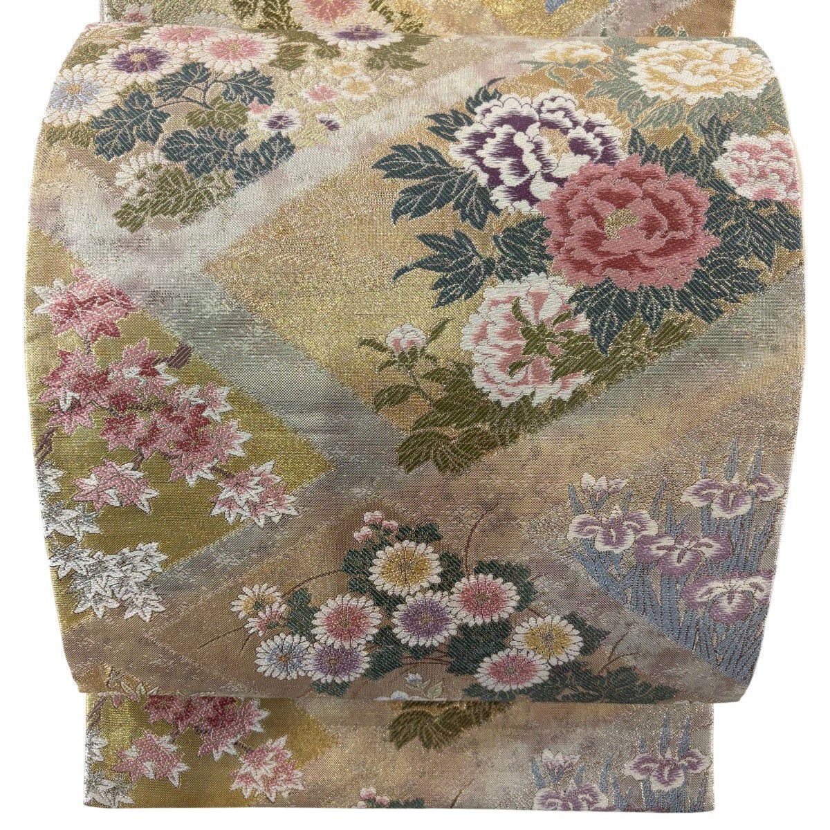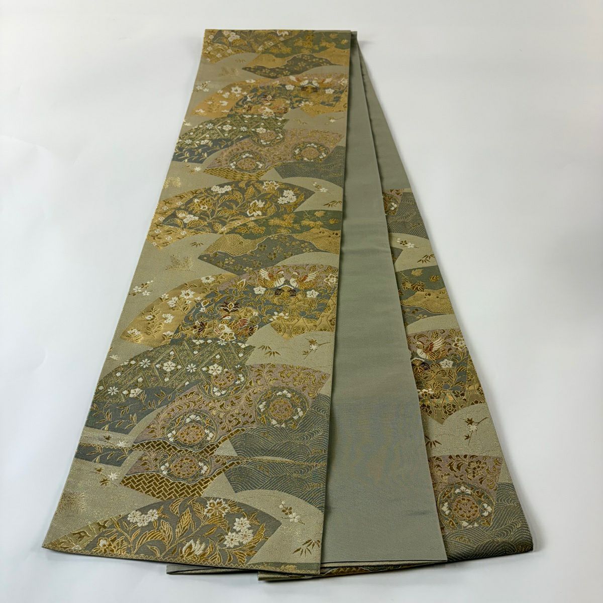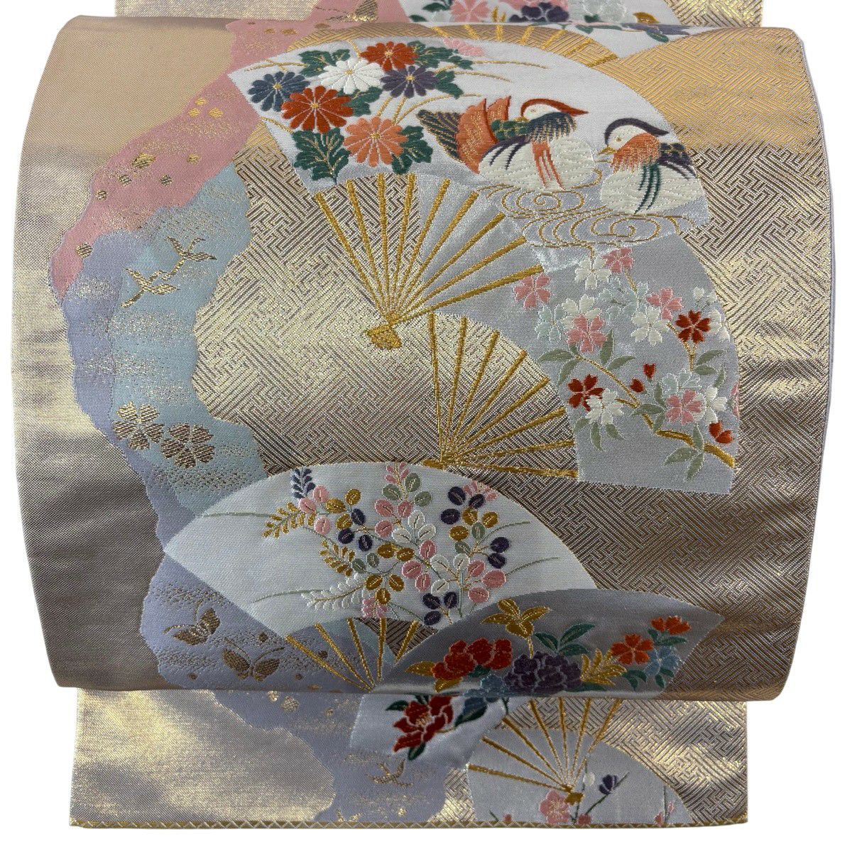 名古屋帯 秀品 松葉仕立て 八寸名古屋帯 扇面 草花 金銀糸 クリーム 正絹