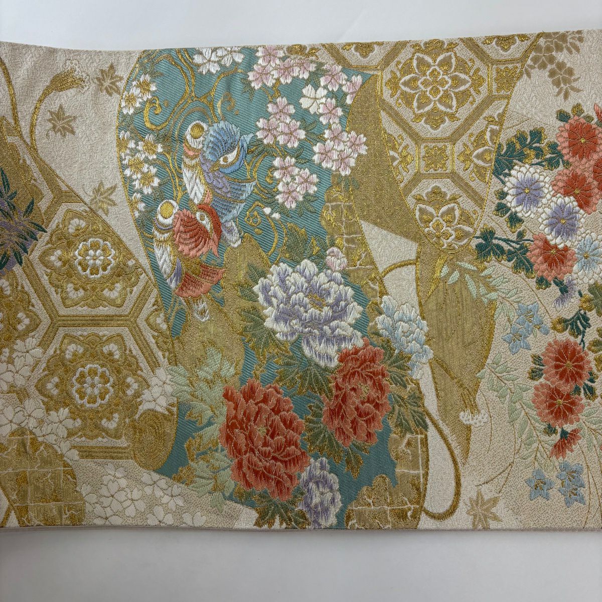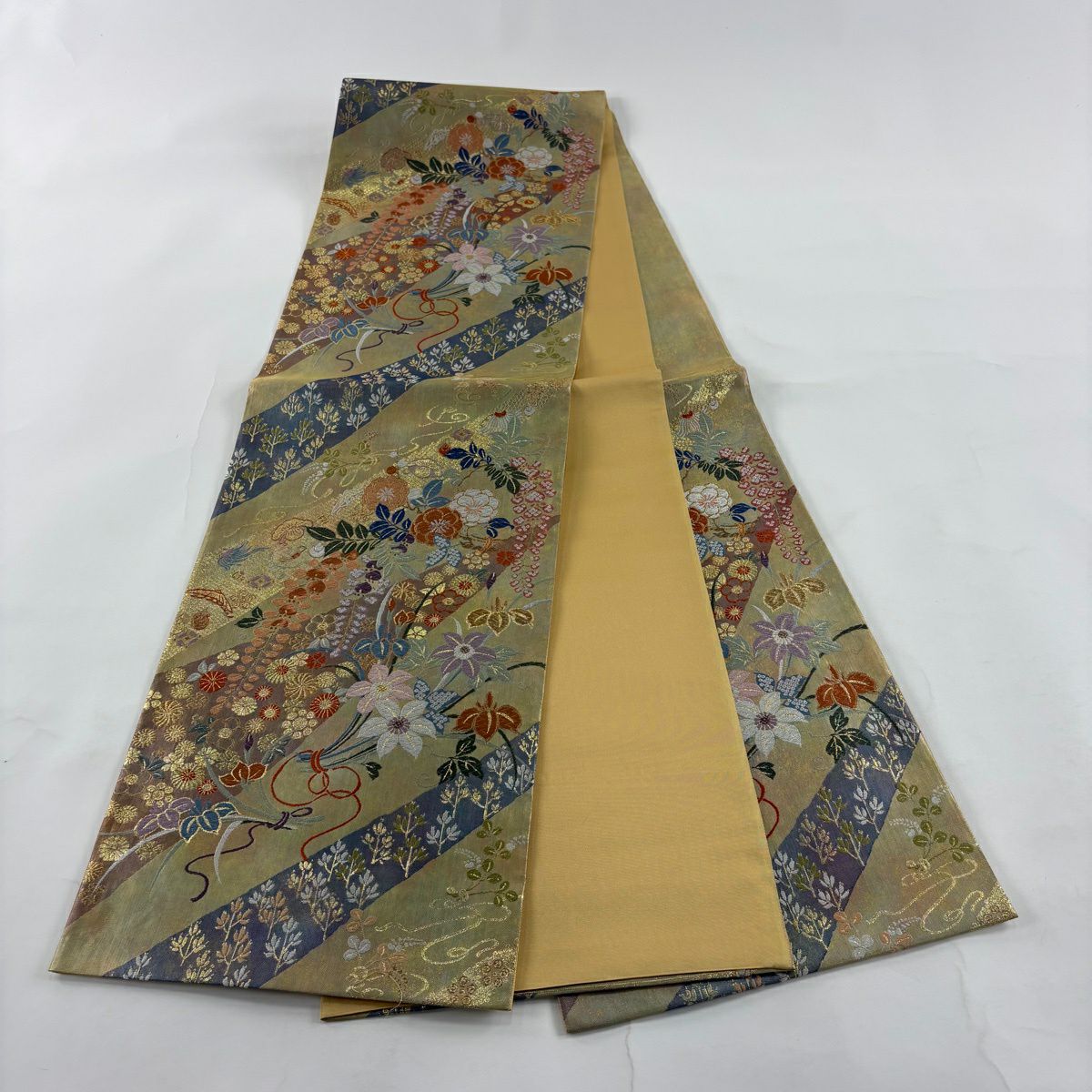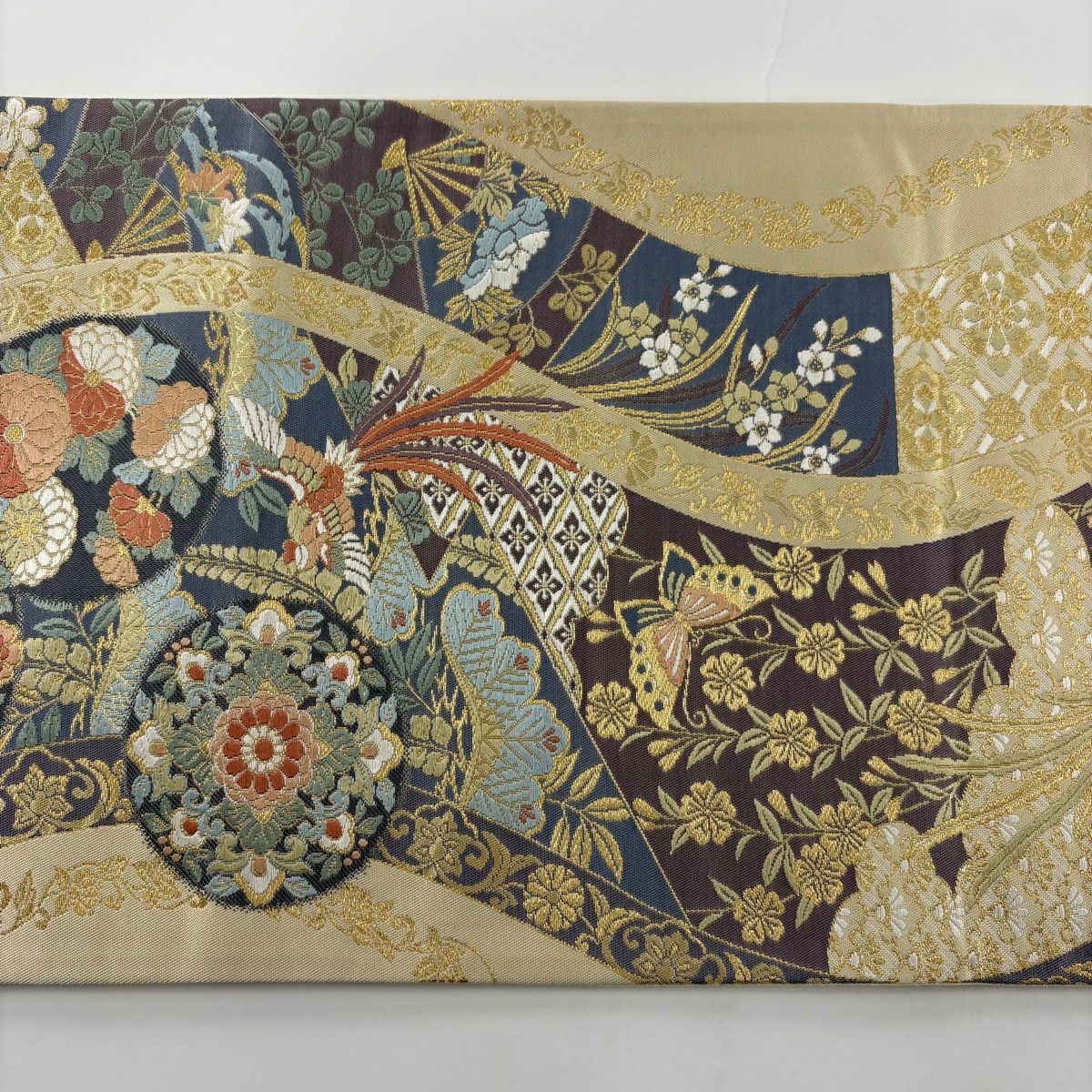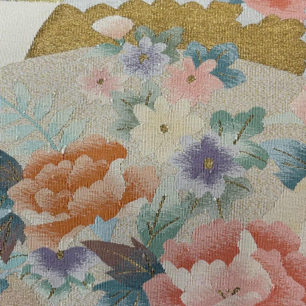 名古屋帯 秀品 松葉仕立て 八寸名古屋帯 扇面 草花 金銀糸 クリーム 正絹