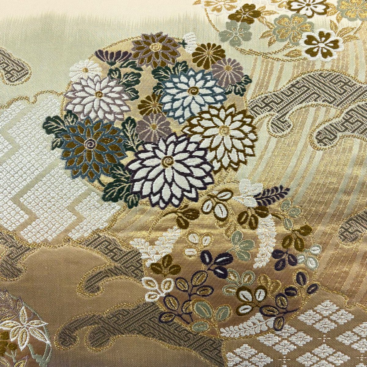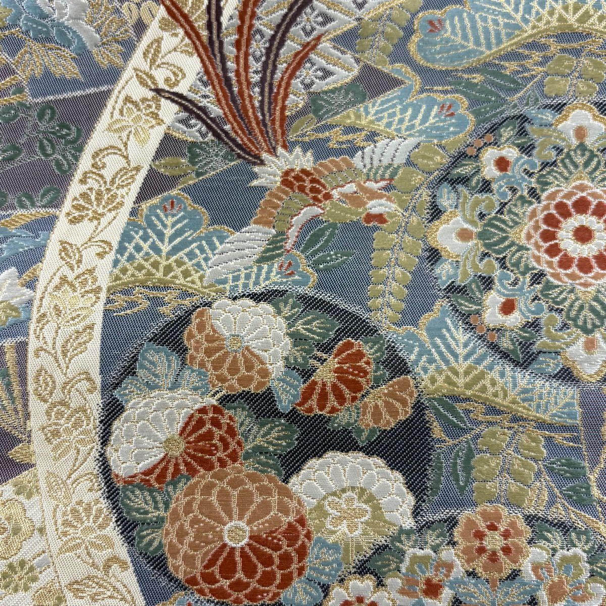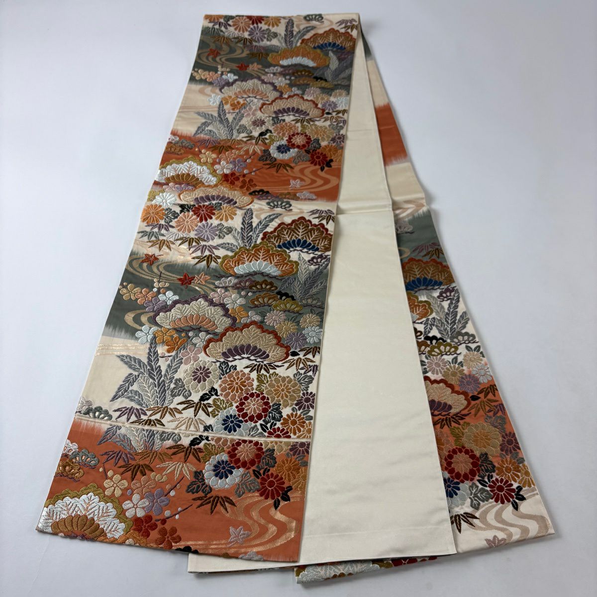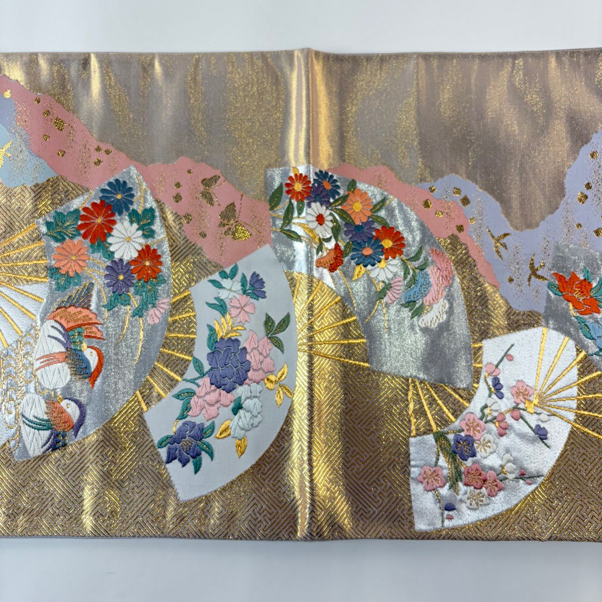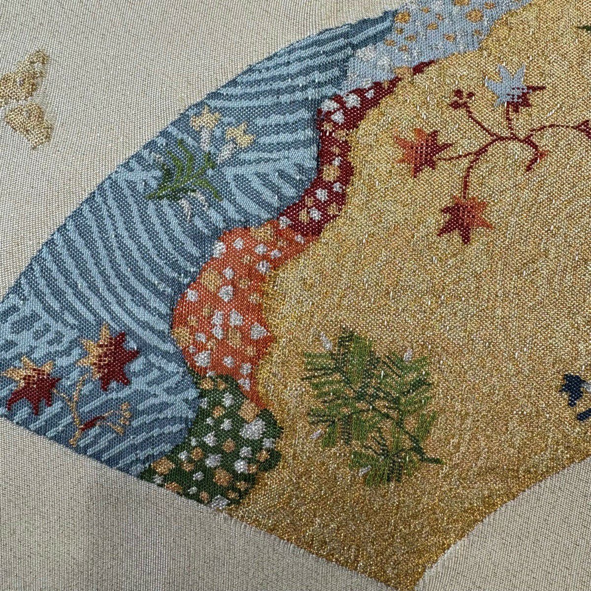名古屋帯 秀品 松葉仕立て 八寸名古屋帯 扇面 草花 金銀糸 クリーム 正絹