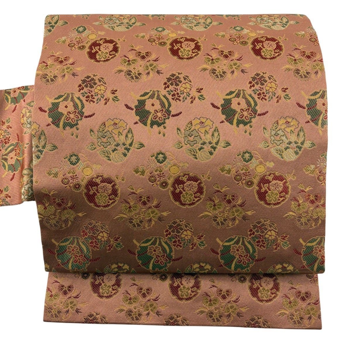 【美品】 名古屋帯 秀品 雪輪 草花 金彩 ピンクベージュ 正絹
