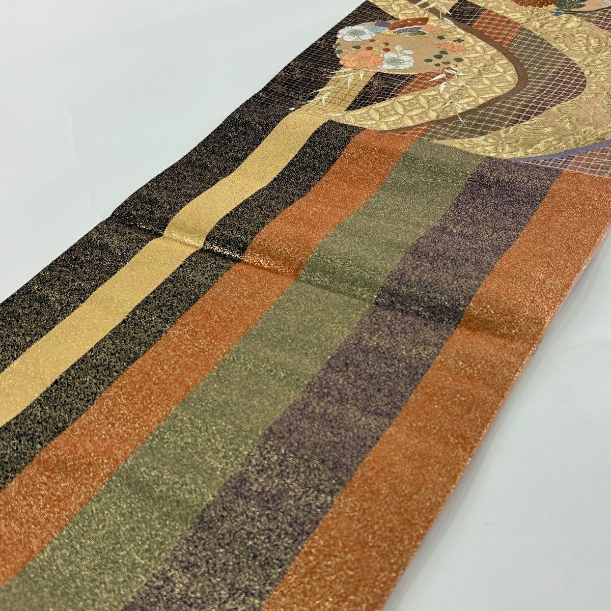 【美品】 袋帯 秀品 関西仕立て 草花 弓矢 金糸 箔 金色 六通 正絹