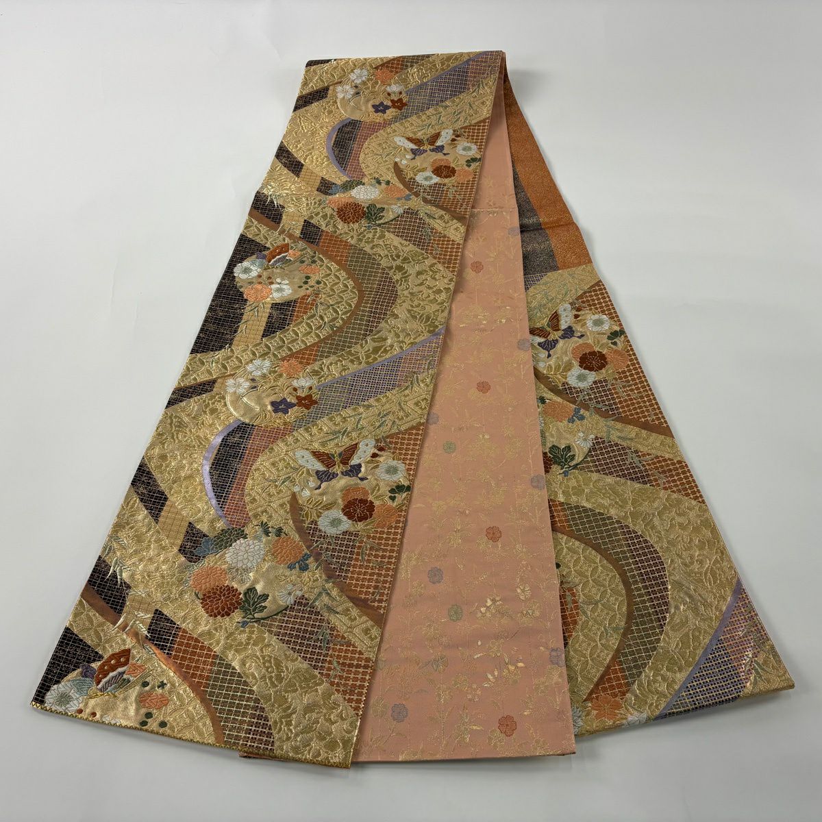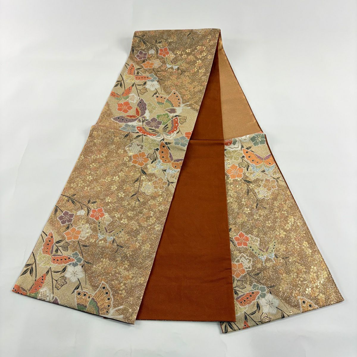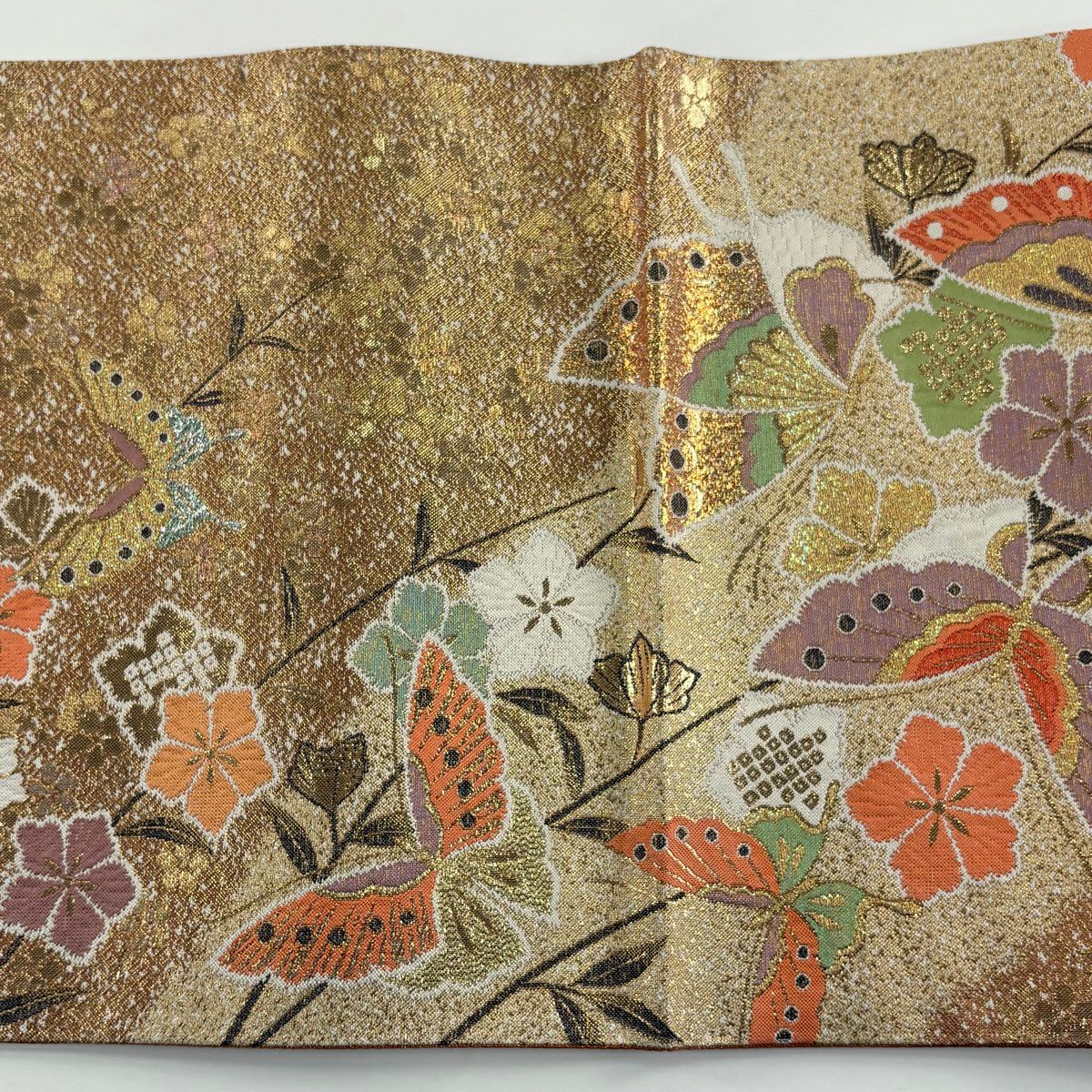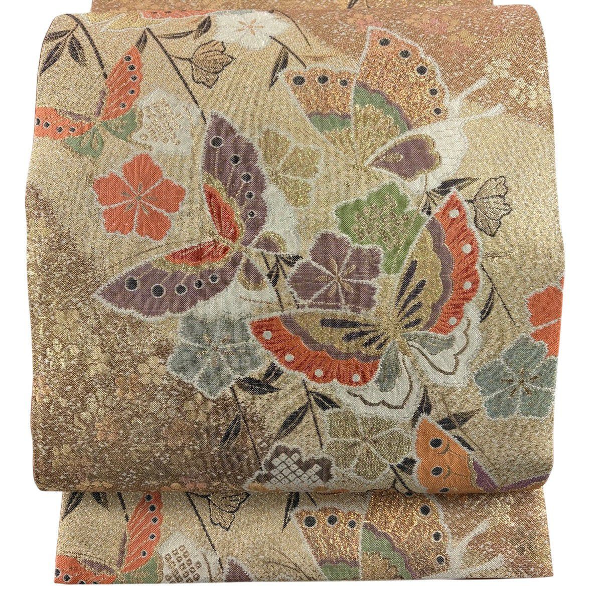 【美品】 袋帯 秀品 蝶 草花 金糸 箔 薄オレンジ お太鼓柄 正絹