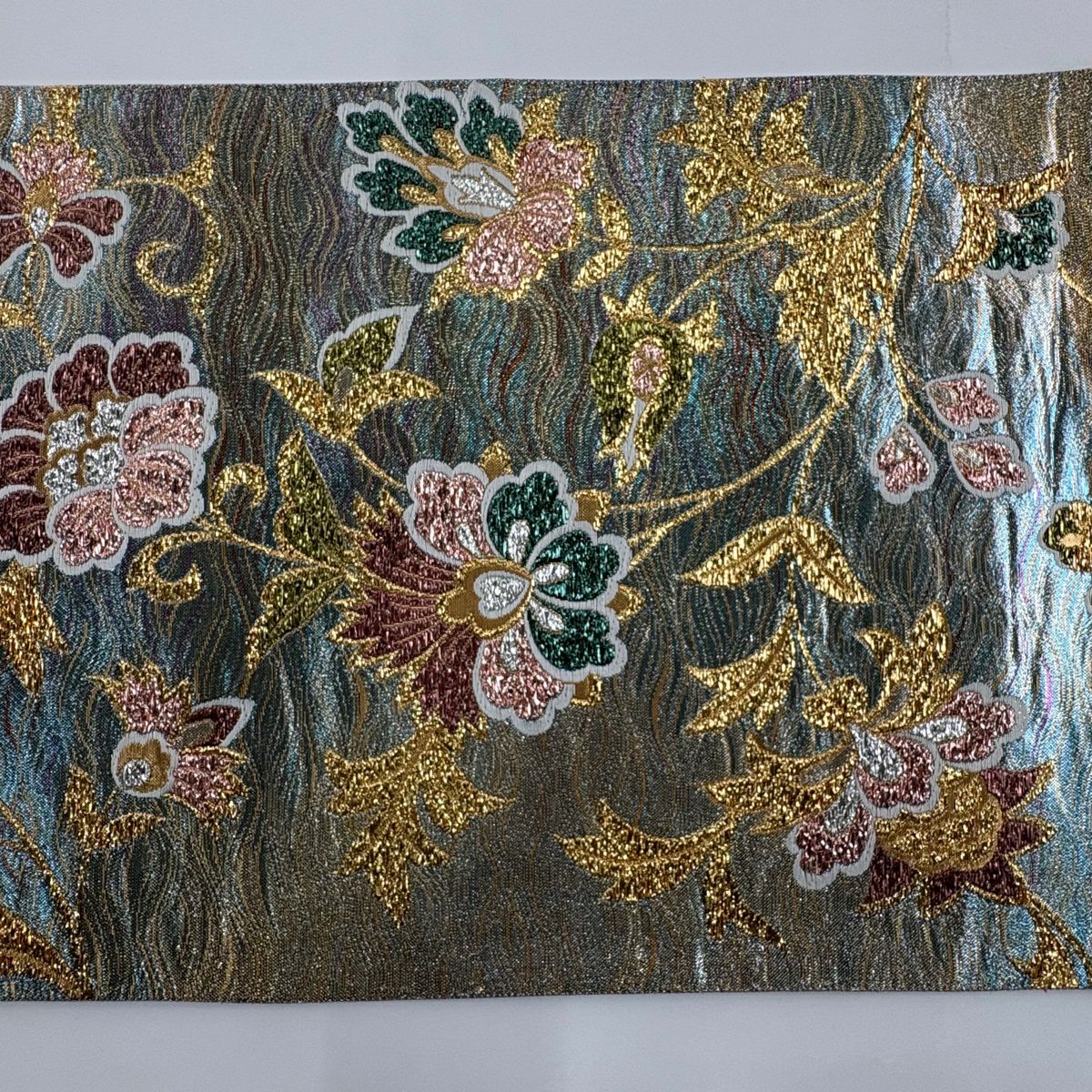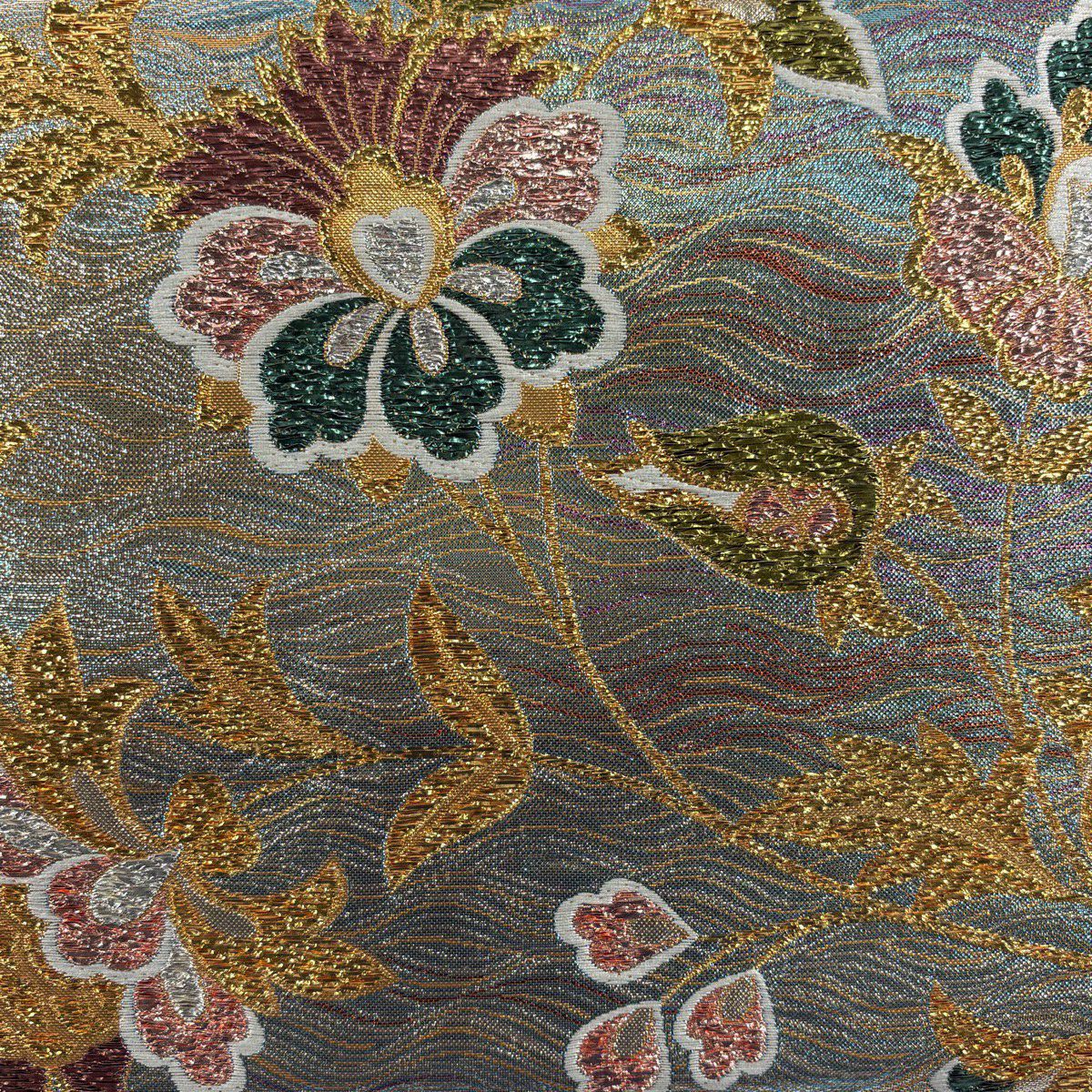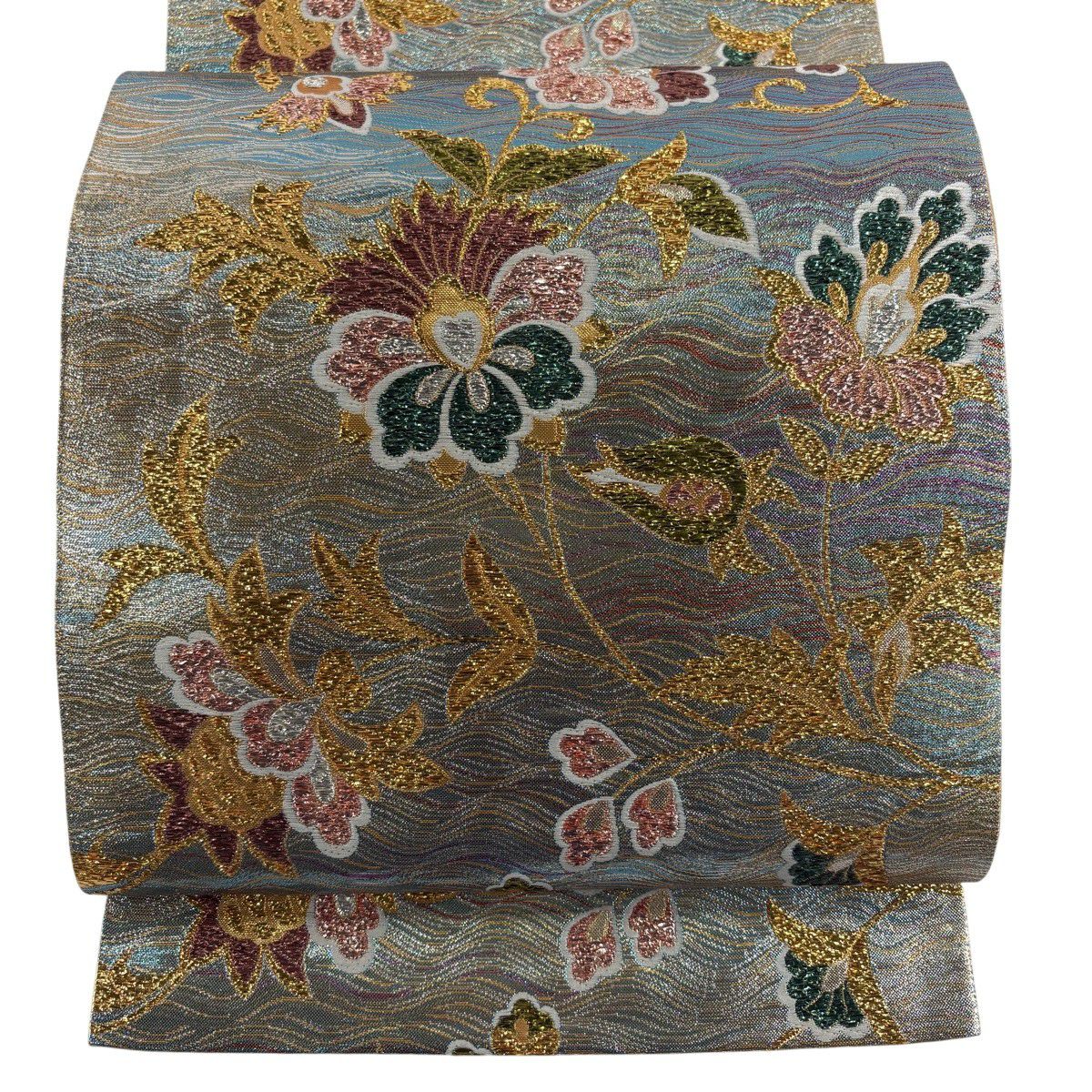 【美品】 袋帯 秀品 振袖向き 花唐草 よろけ縞 箔 水色 六通 正絹
