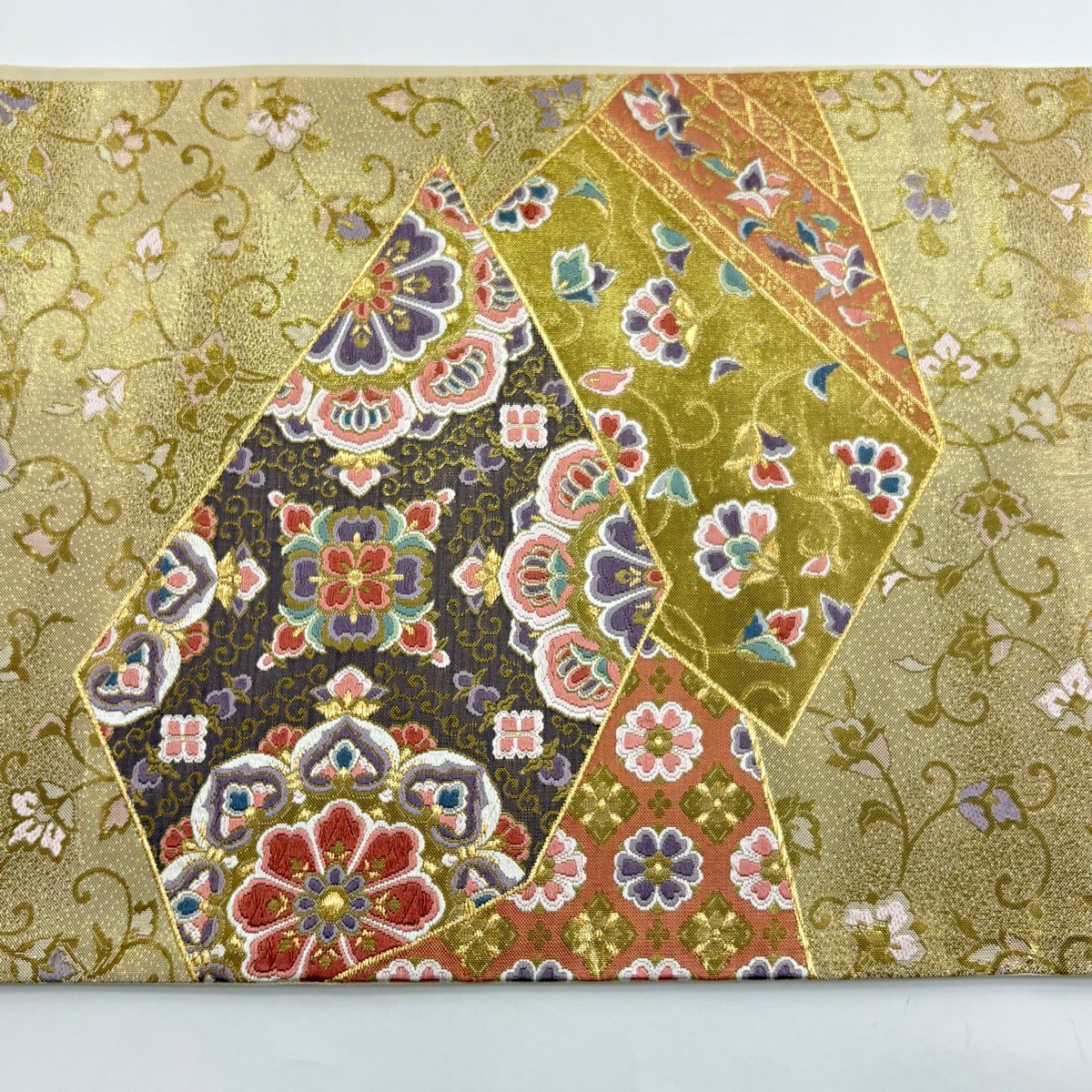 【美品】 袋帯 秀品 裂取宝華文 華文 花唐草 金糸 箔 金色 六通 正絹