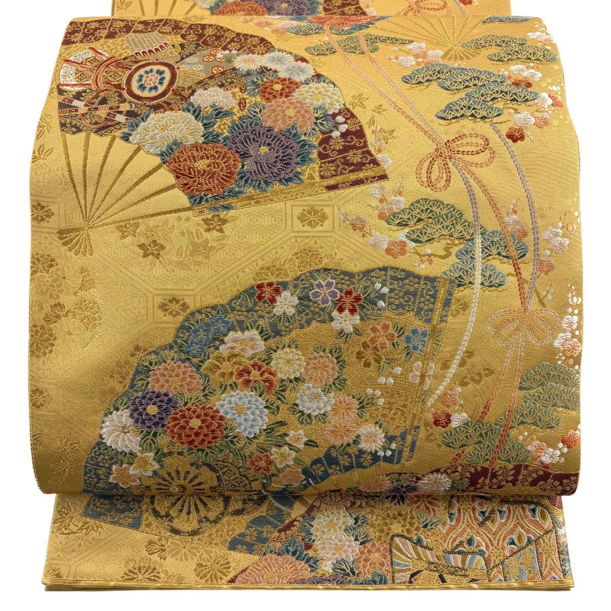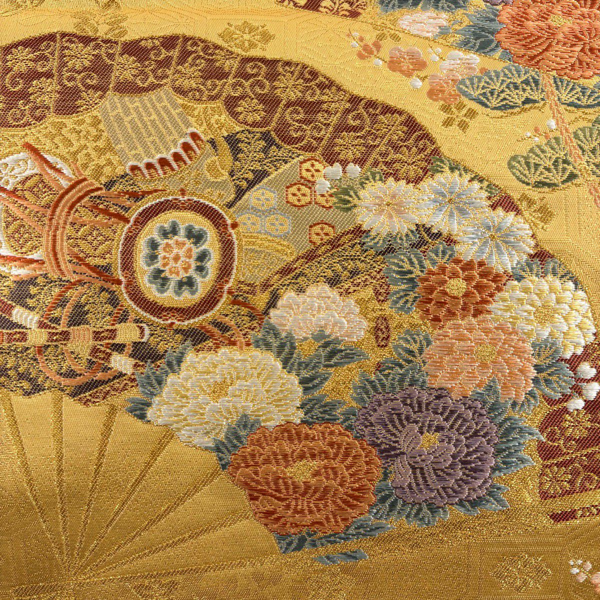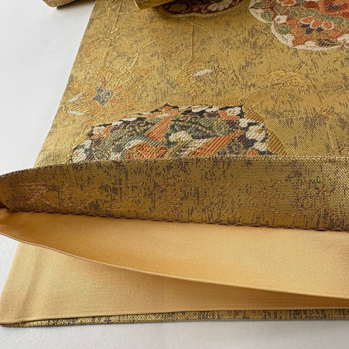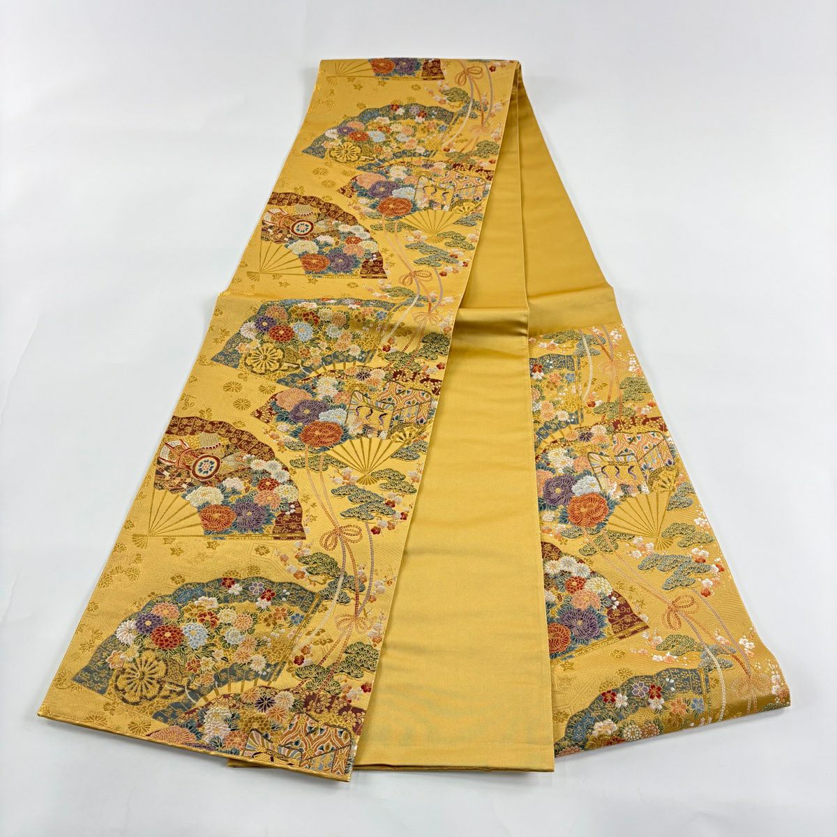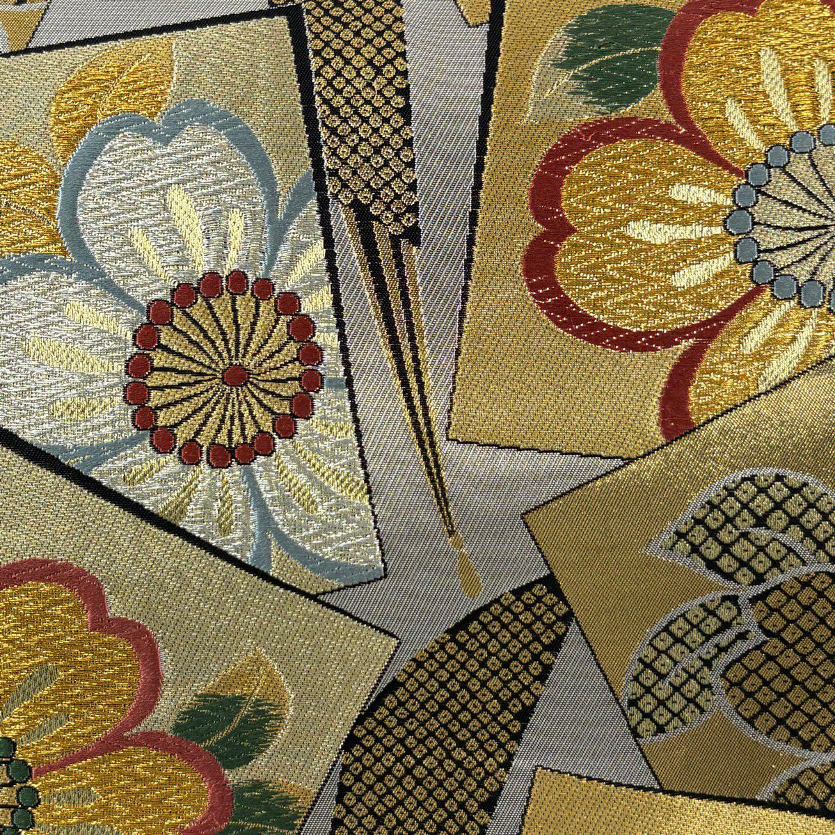【美品】 袋帯 秀品 扇面散し文 扇 草花 金糸 箔 山吹色 六通 正絹
