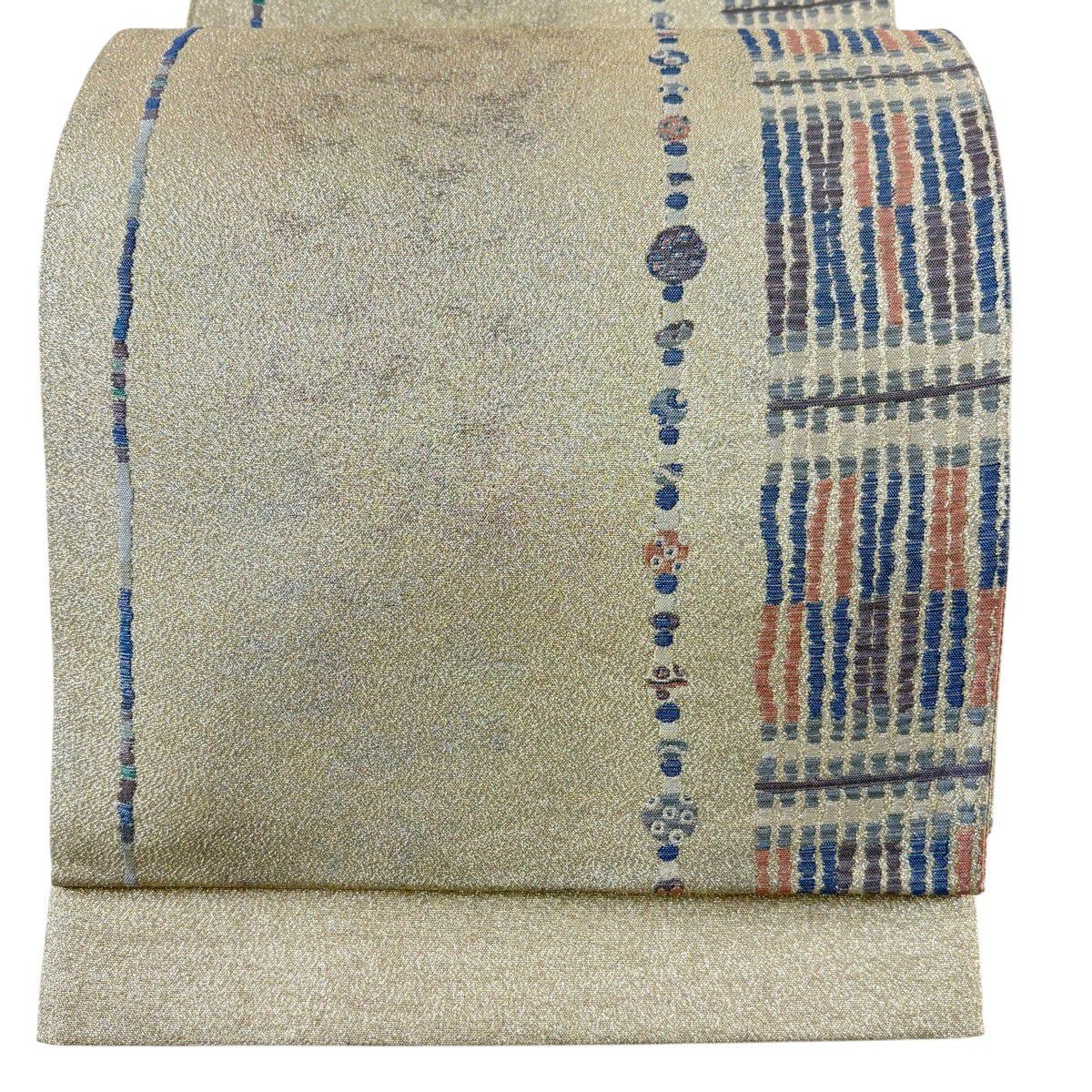 【美品】 袋帯 秀品 紬地 幾何学 金糸 ベージュ お太鼓柄 正絹