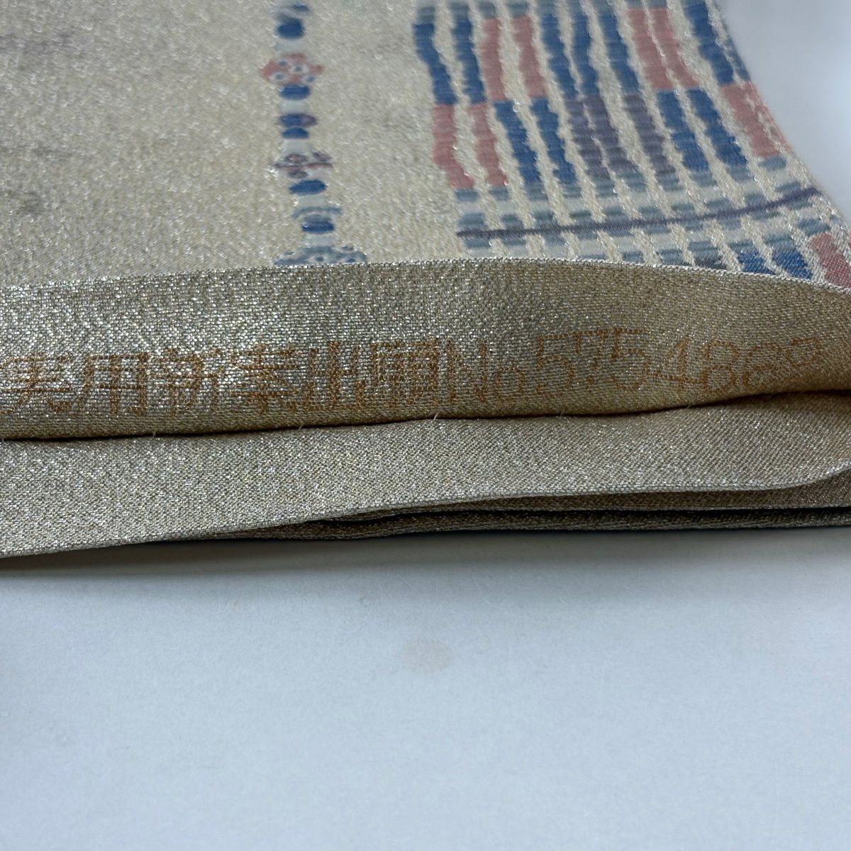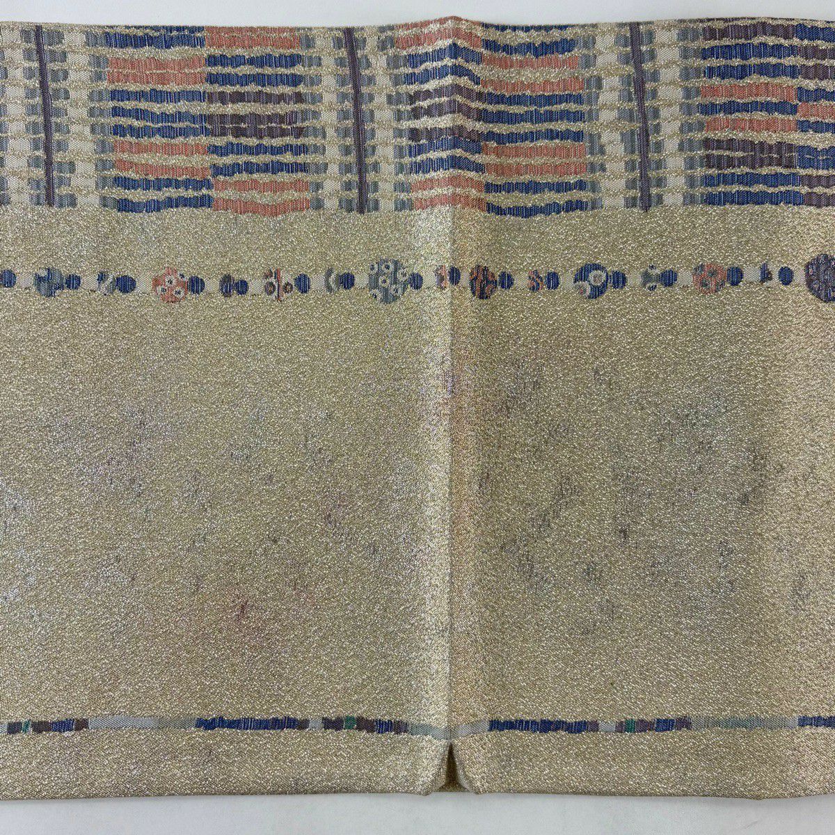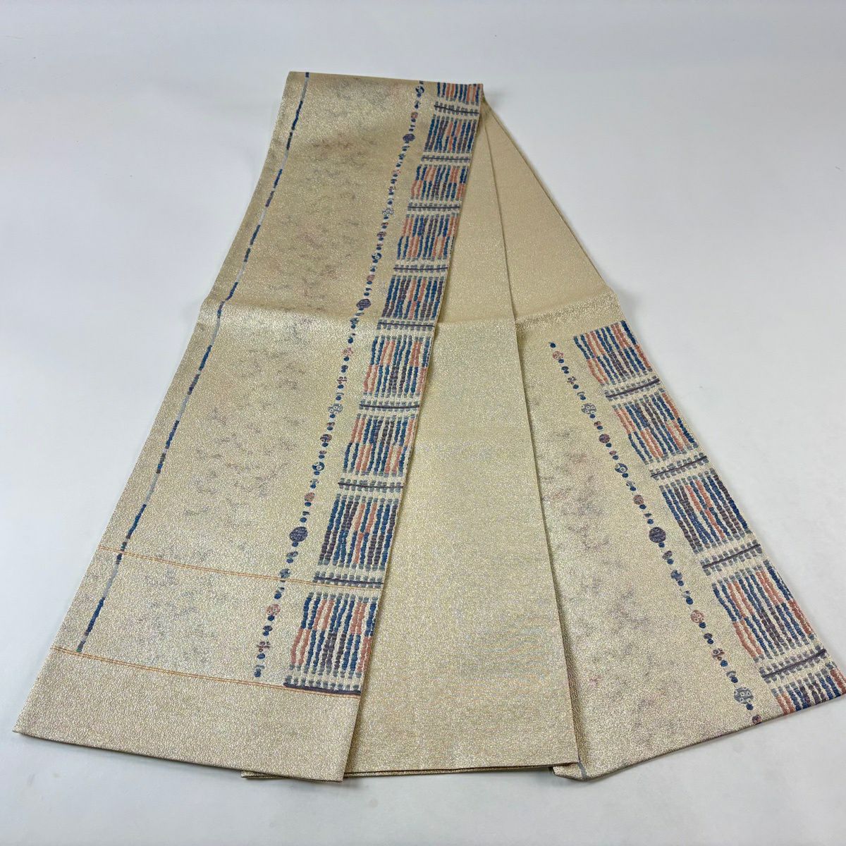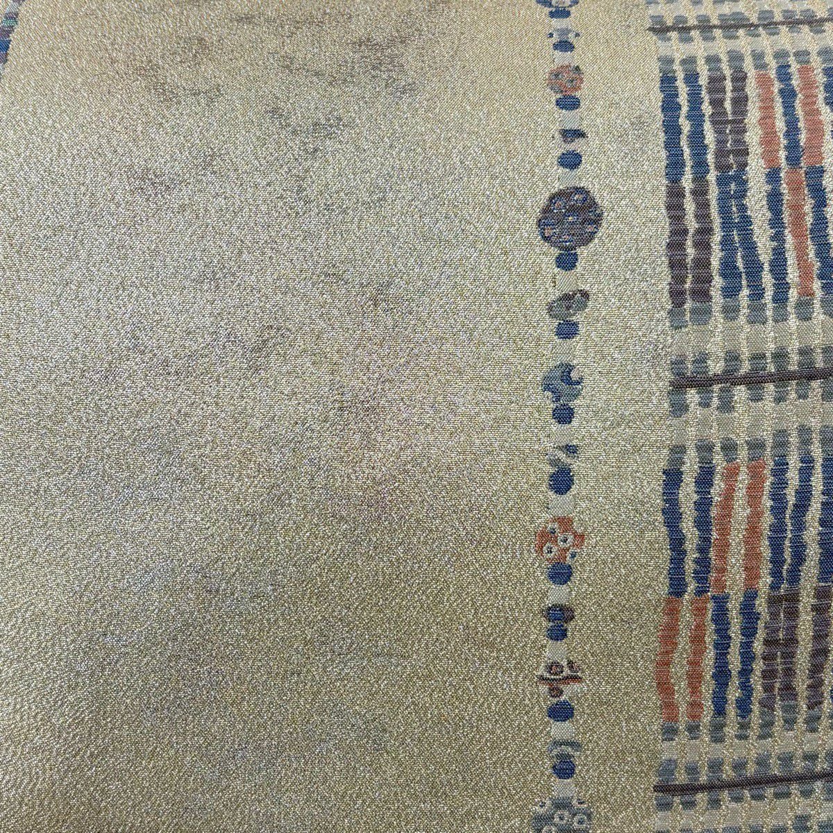 【美品】 袋帯 秀品 関西仕立て 幾何学 箔 ベージュ 六通 正絹