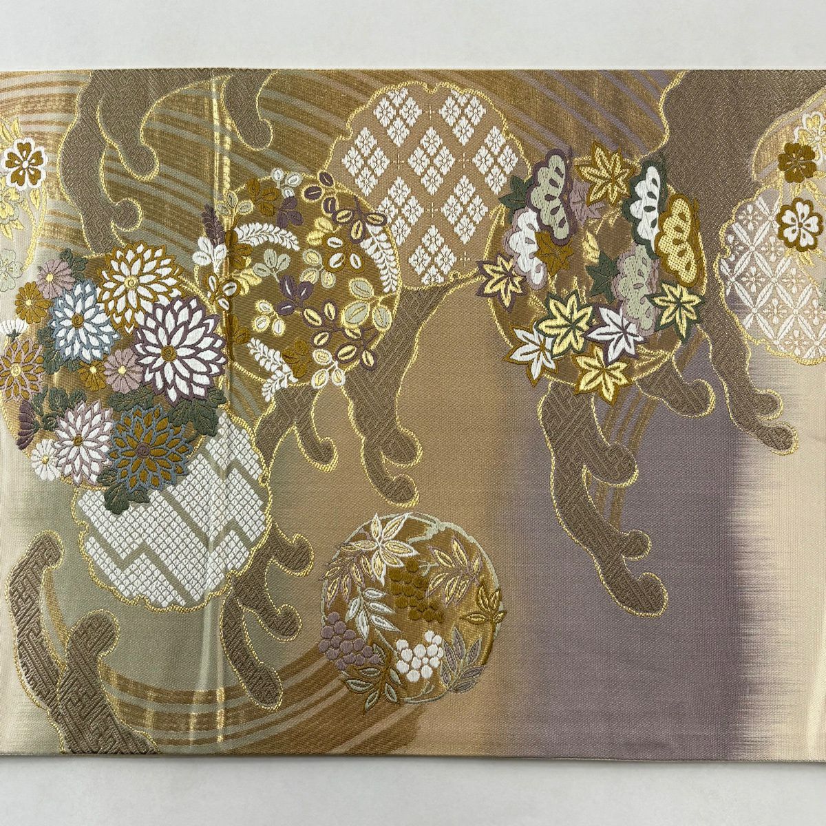 【美品】 袋帯 秀品 華文 尾長鳥 金糸 箔 ベージュ 六通 正絹