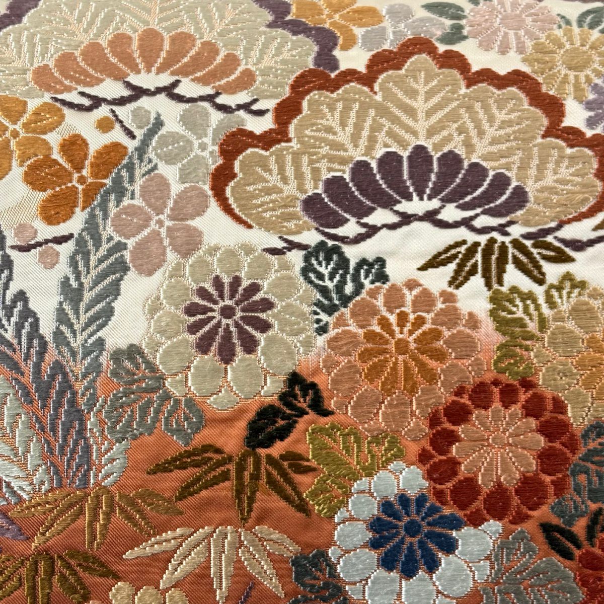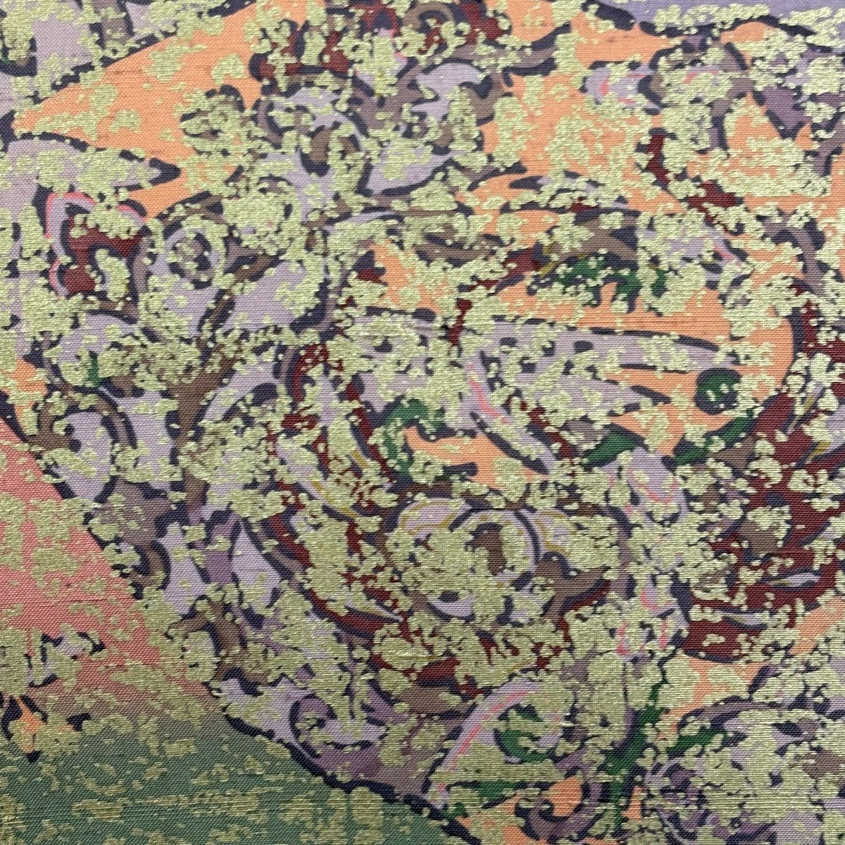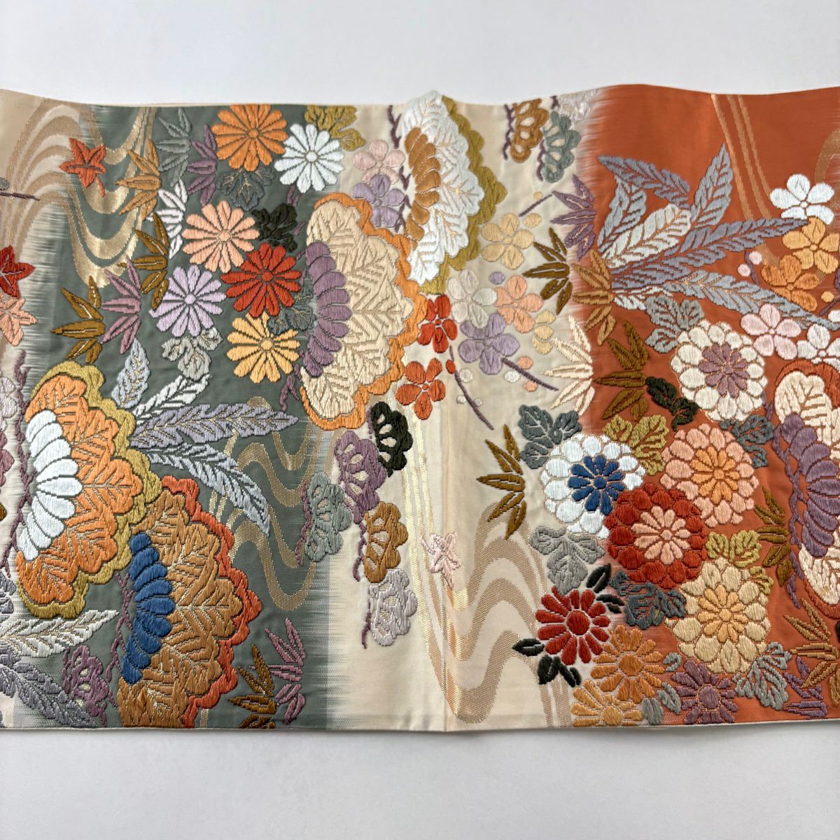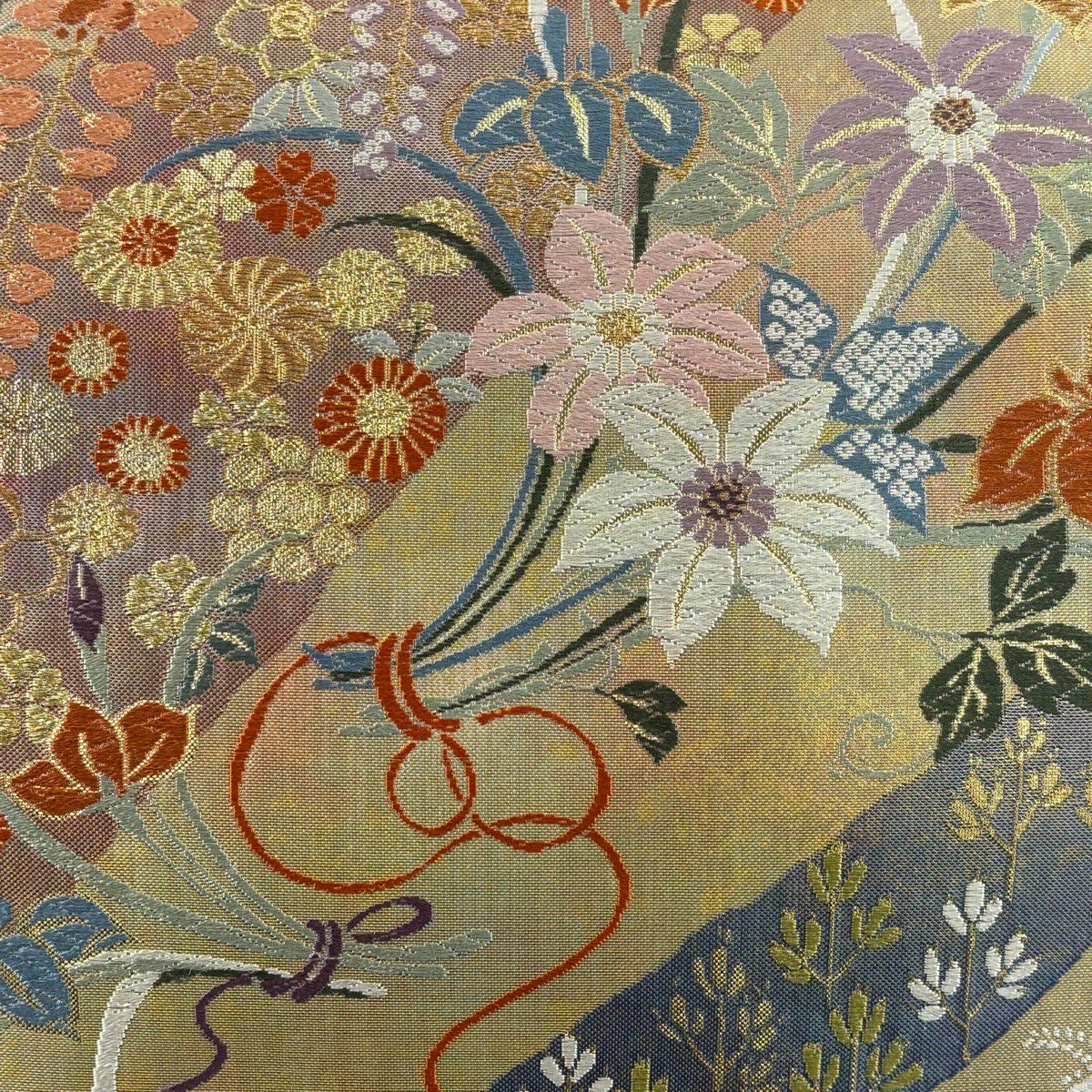 【美品】 袋帯 秀品 落款あり 草花 金糸 箔 オレンジ 六通 正絹