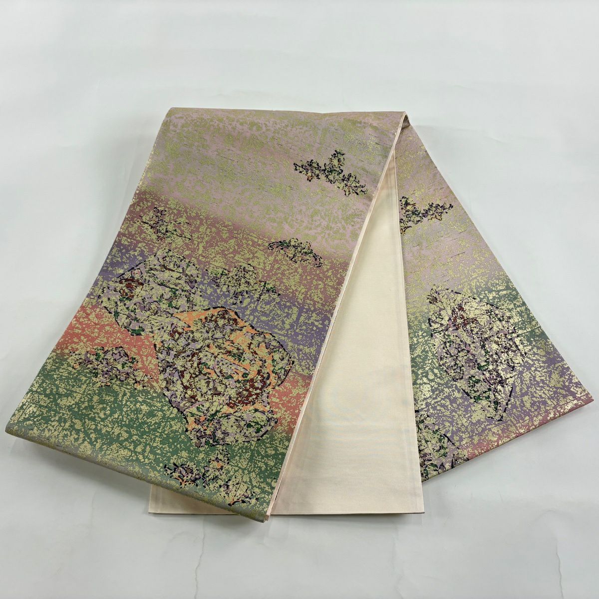 【美品】 袋帯 秀品 関西仕立て 北出杉 箔 ベージュ 六通 正絹