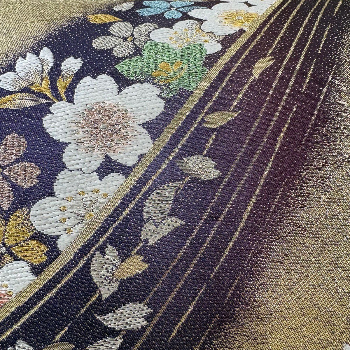 【美品】 袋帯 秀品 振袖向き ねじ梅 草花 金糸 箔 黒 六通 正絹