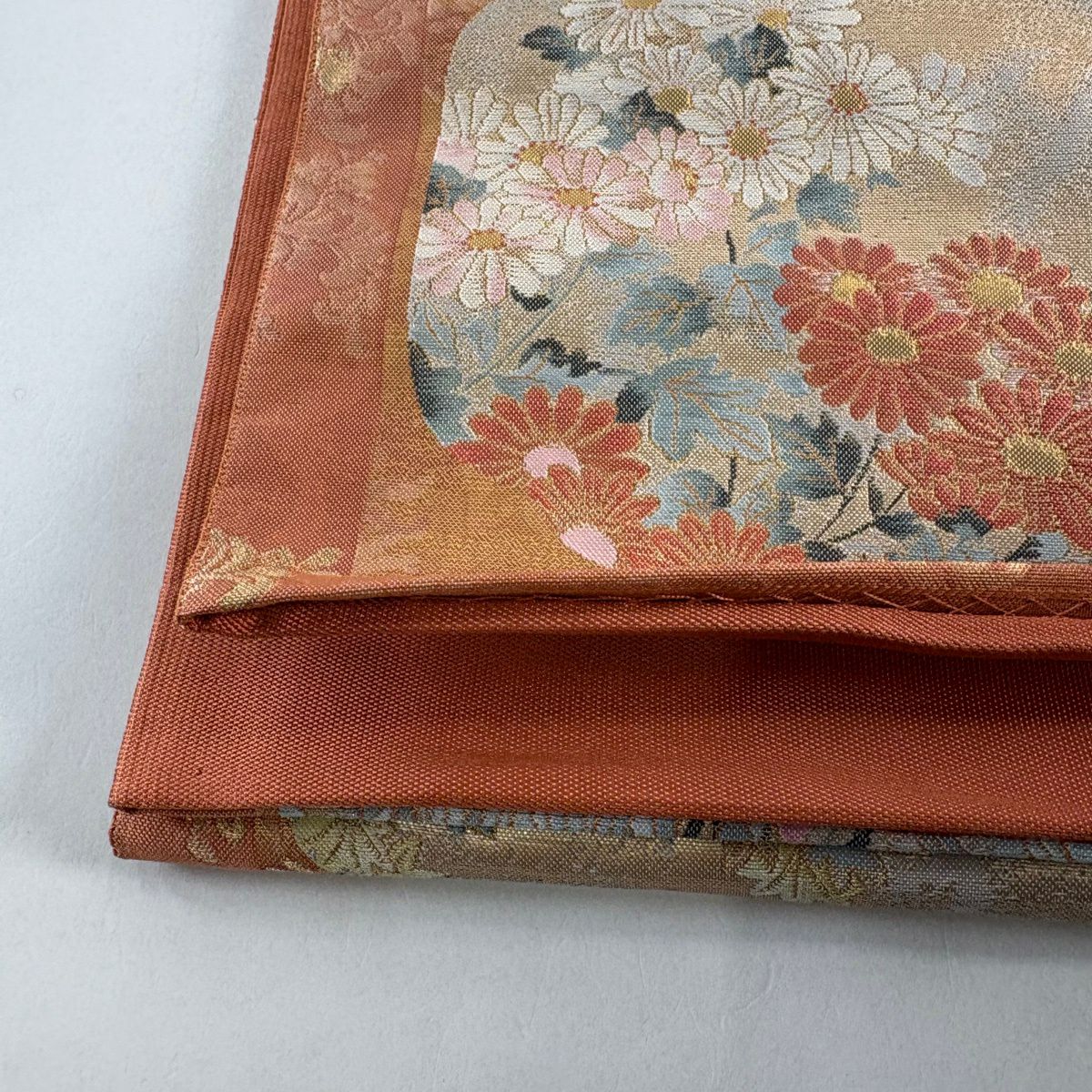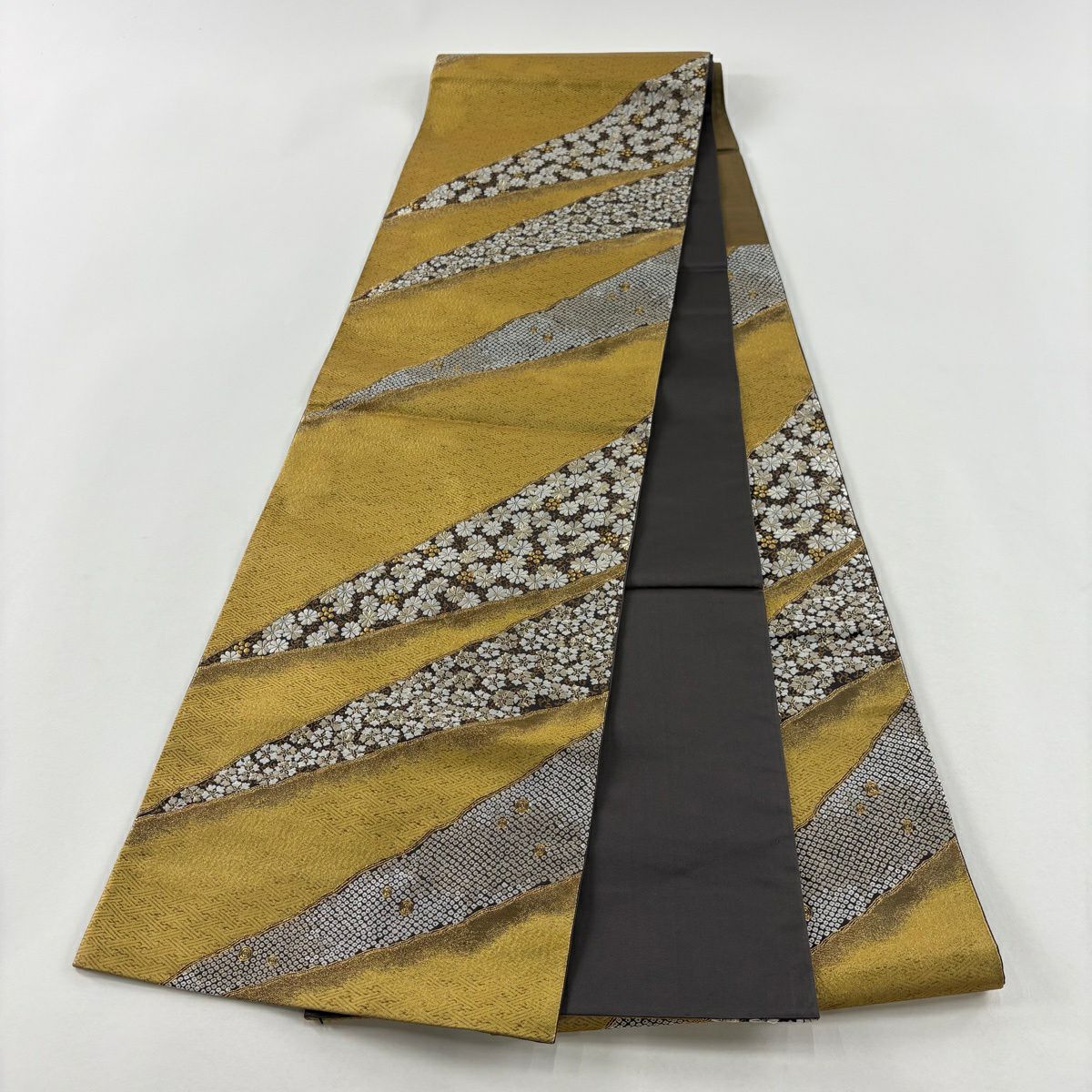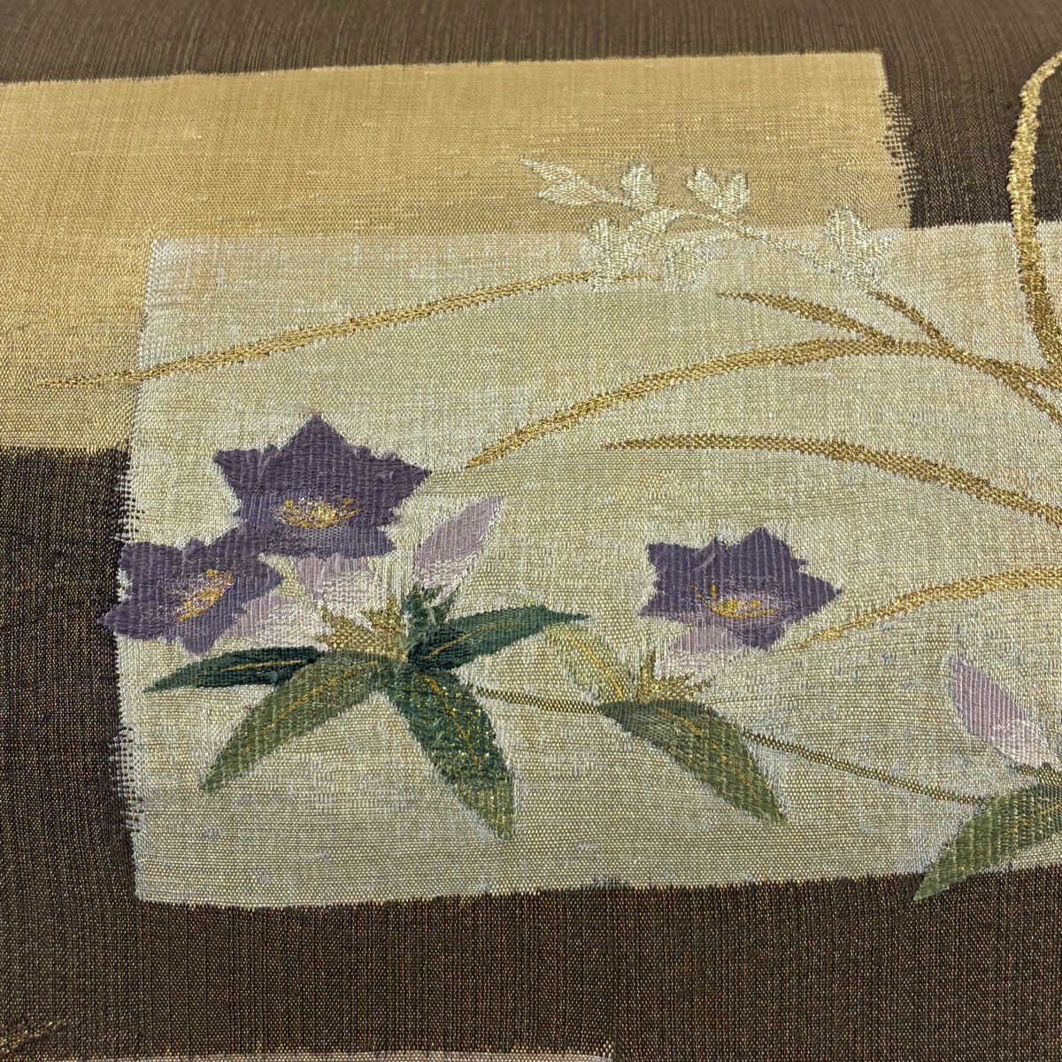【美品】 袋帯 秀品 関西仕立て 草花 金糸 箔 灰茶 お太鼓柄 正絹