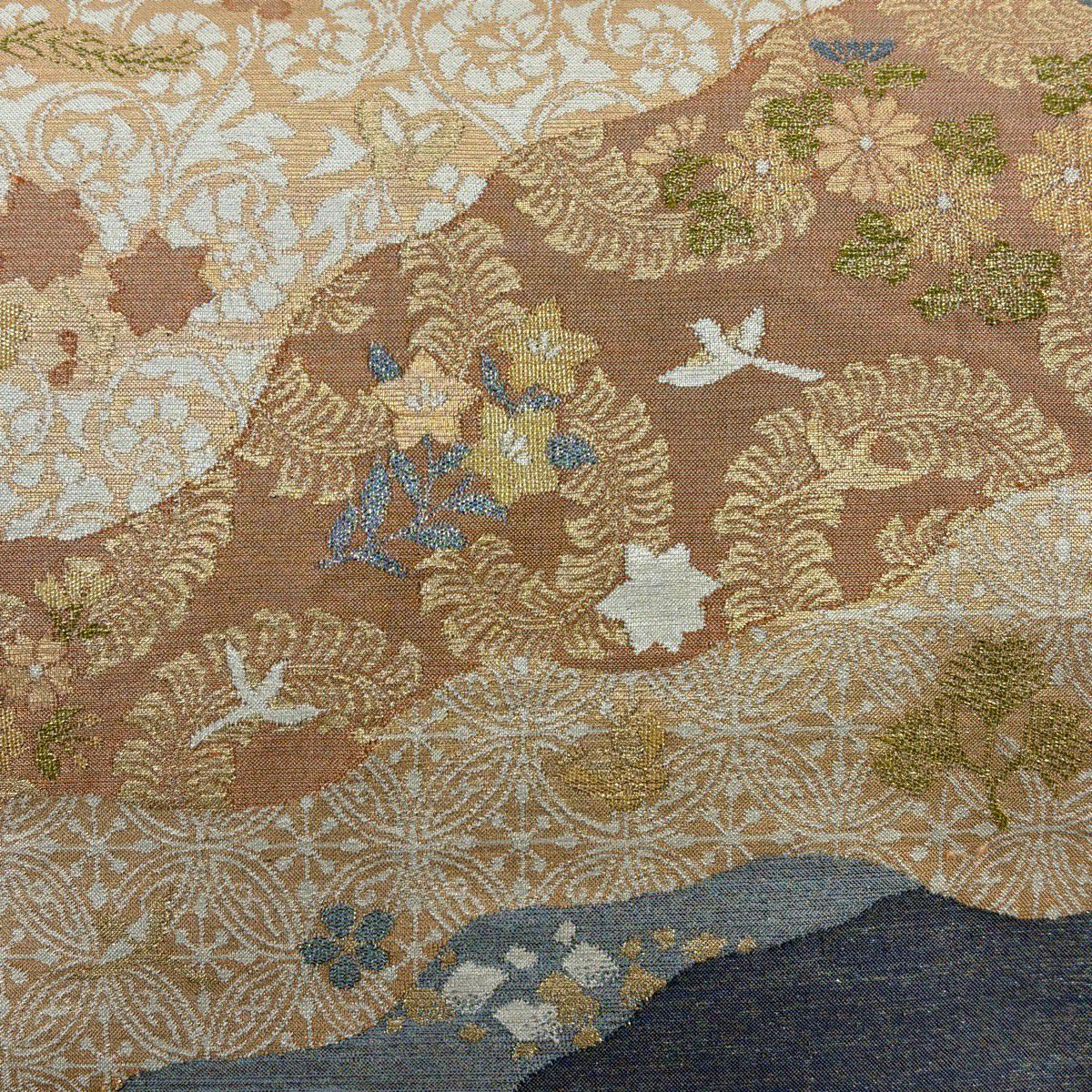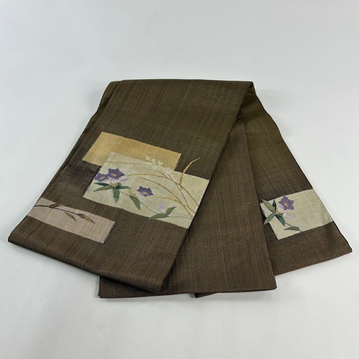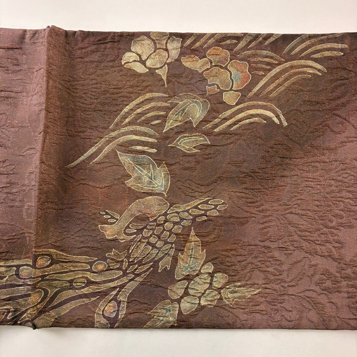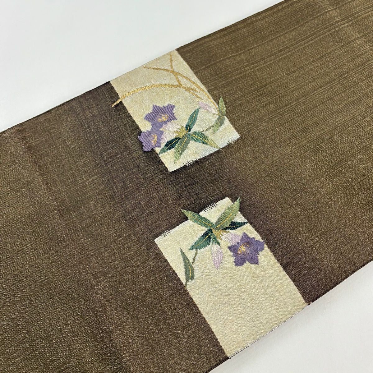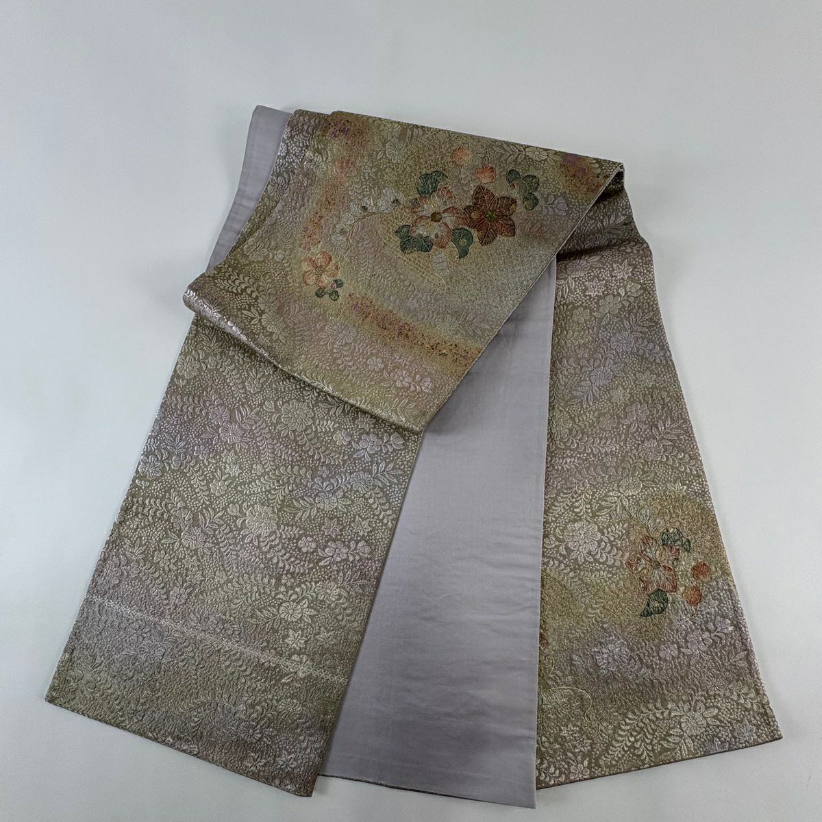 【美品】 袋帯 秀品 証紙あり ぼかし柄 草花 箔 薄茶色 全通 正絹