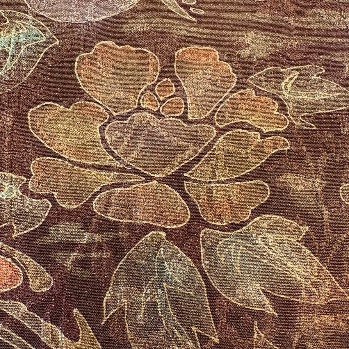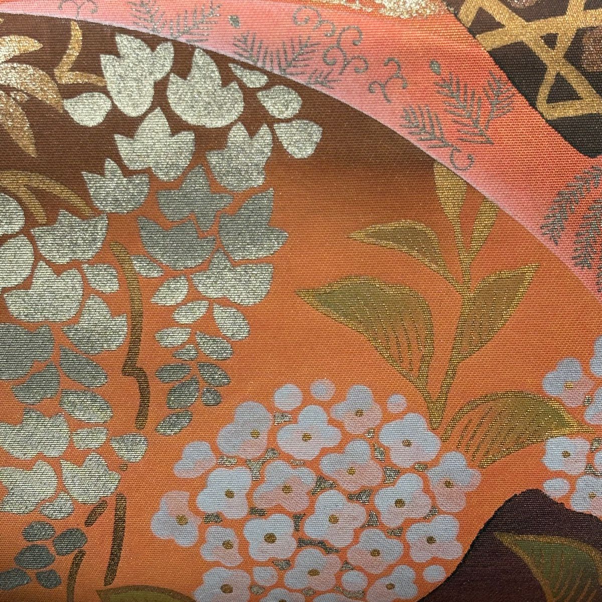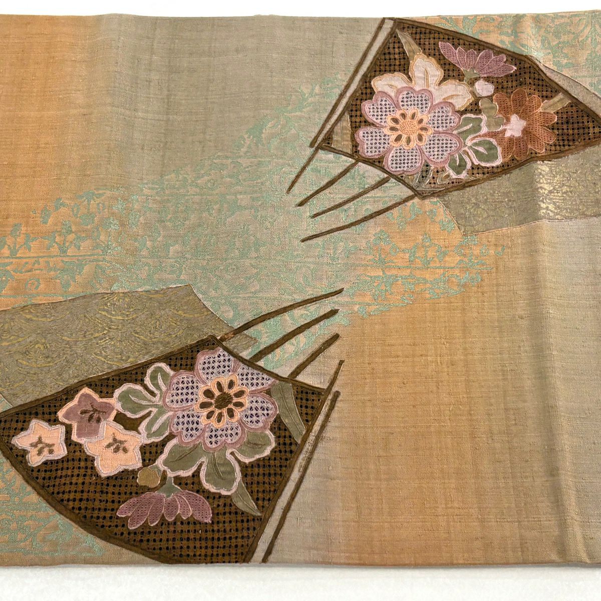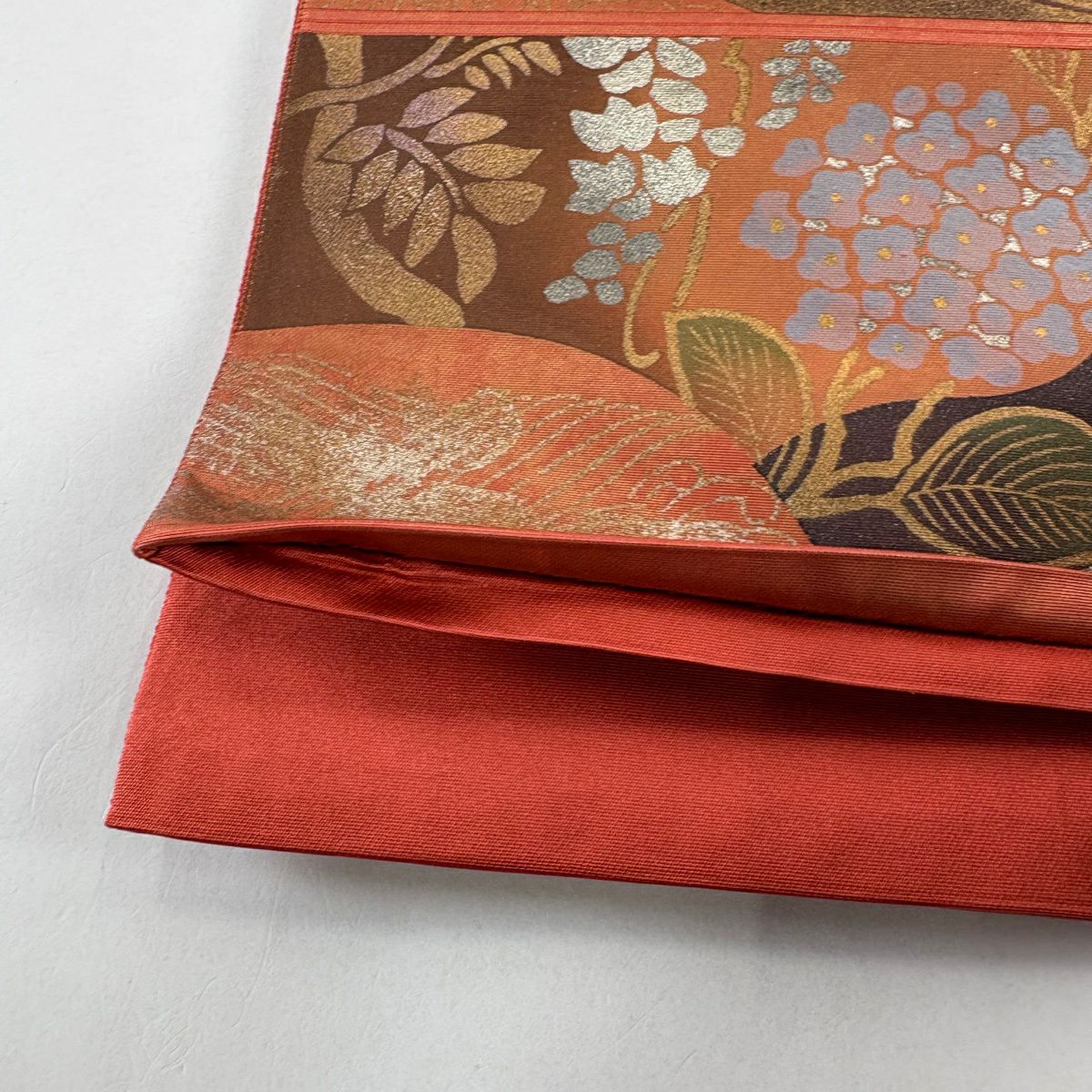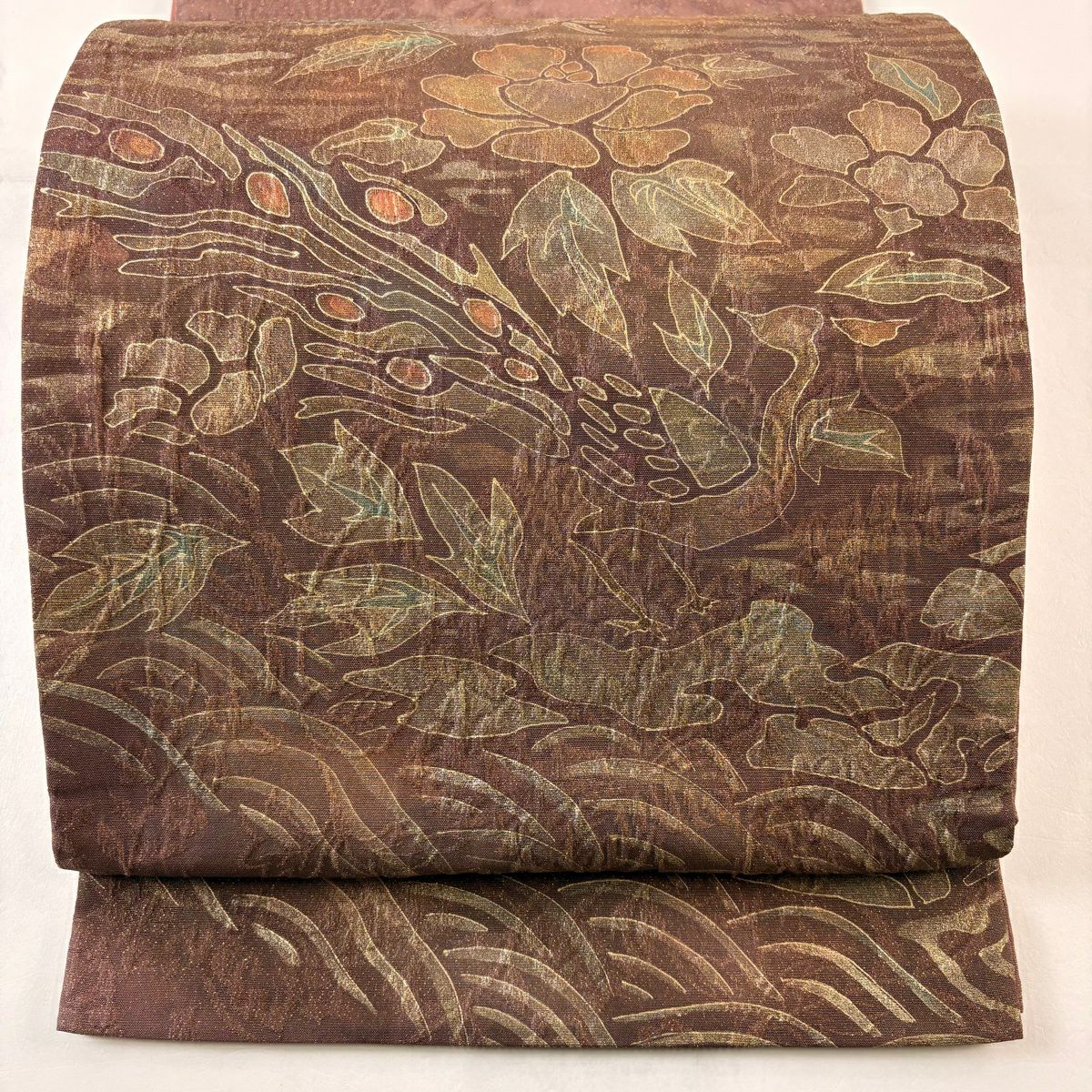 【美品】 袋帯 秀品 証紙あり ぼかし柄 草花 箔 薄茶色 全通 正絹