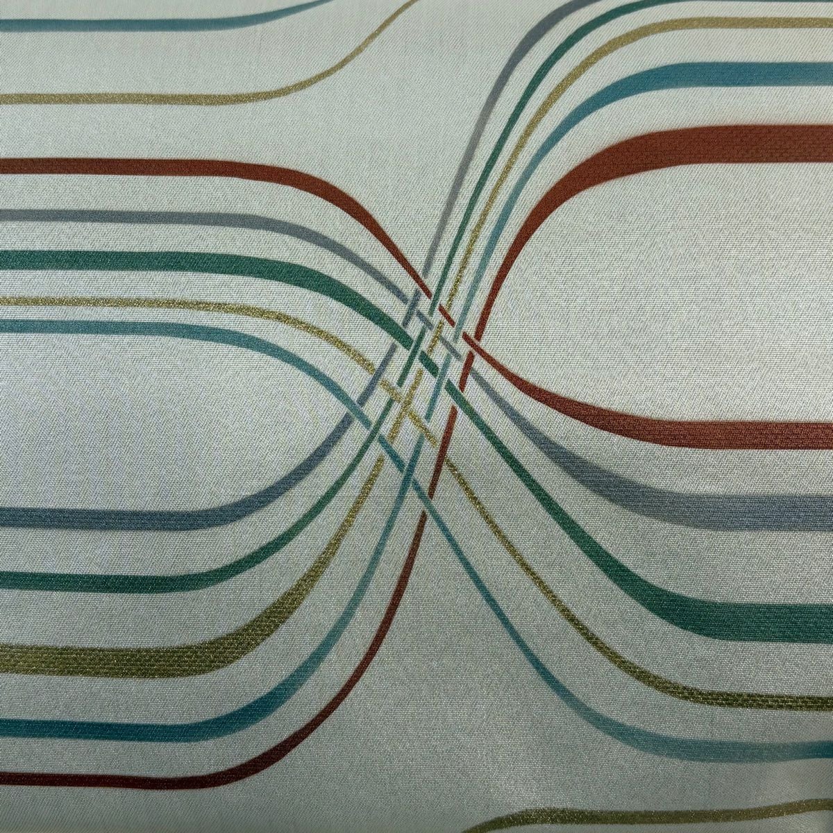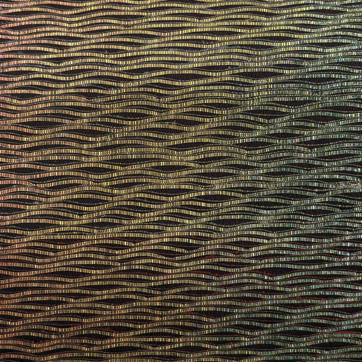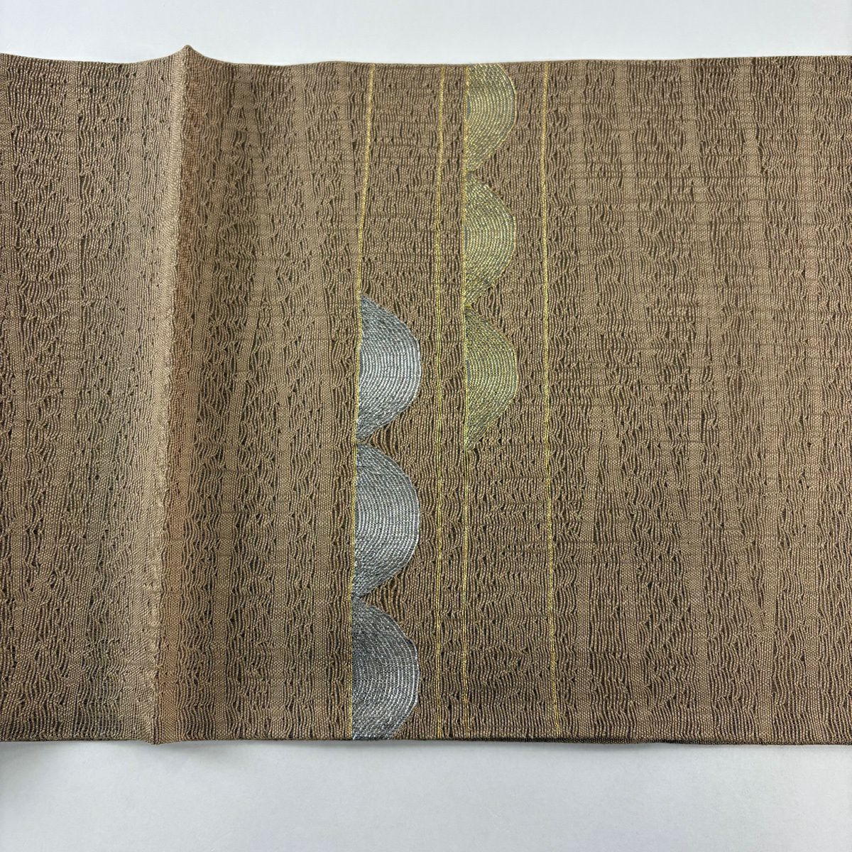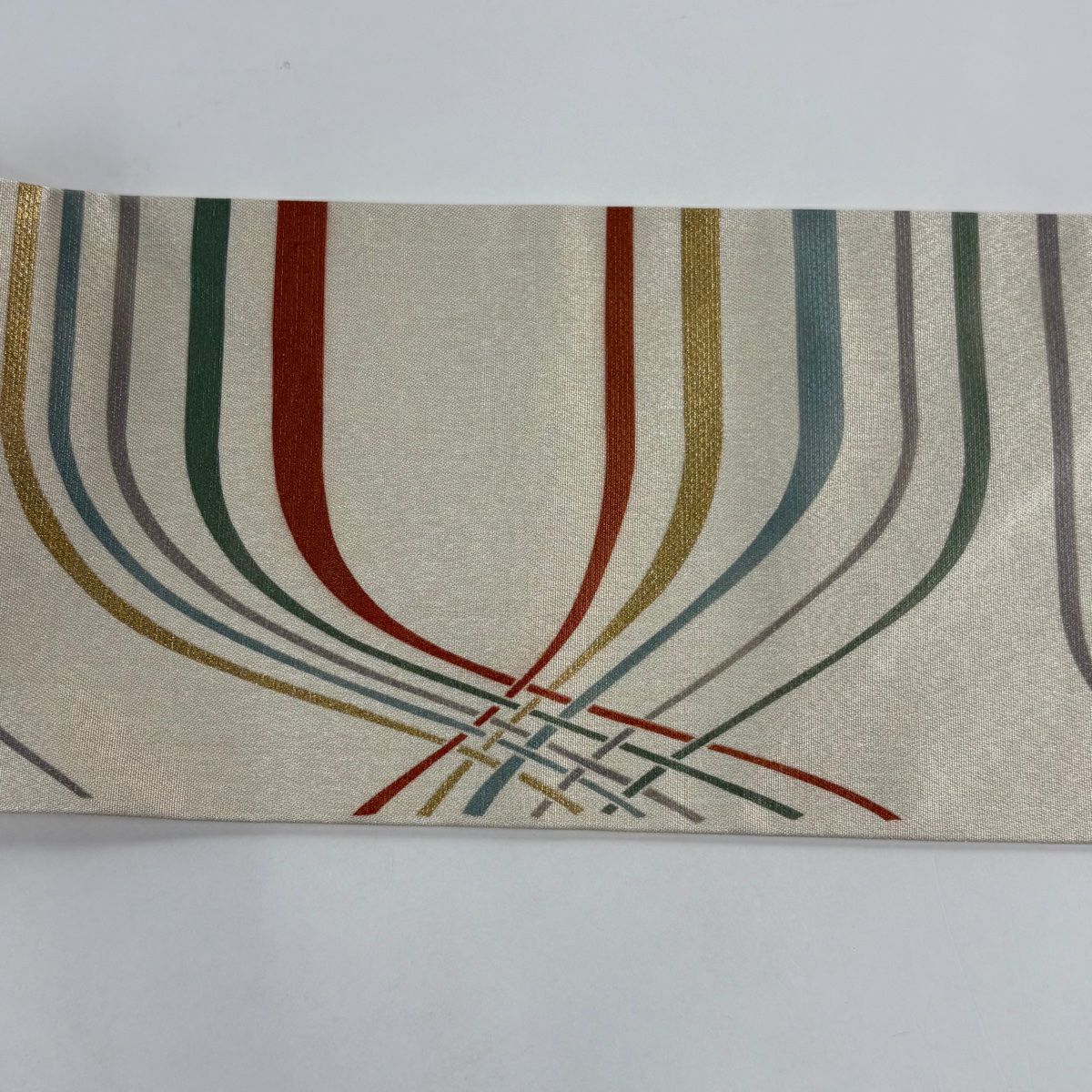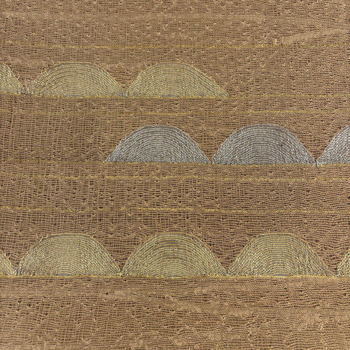 【美品】 名古屋帯 秀品 よろけ縞 幾何学模様 箔 ベージュ 正絹