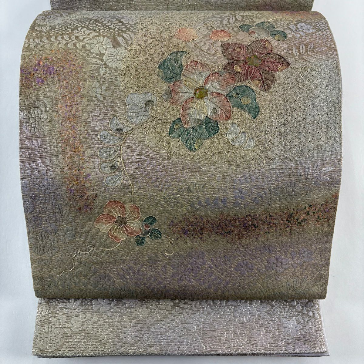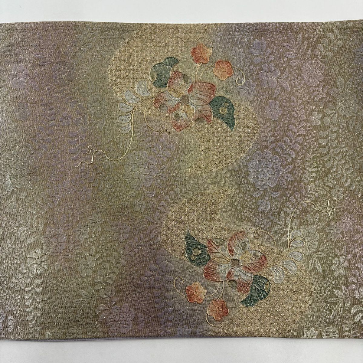 【美品】 袋帯 秀品 落款あり 萬葉 花唐草 青海波 灰紫 全通 正絹