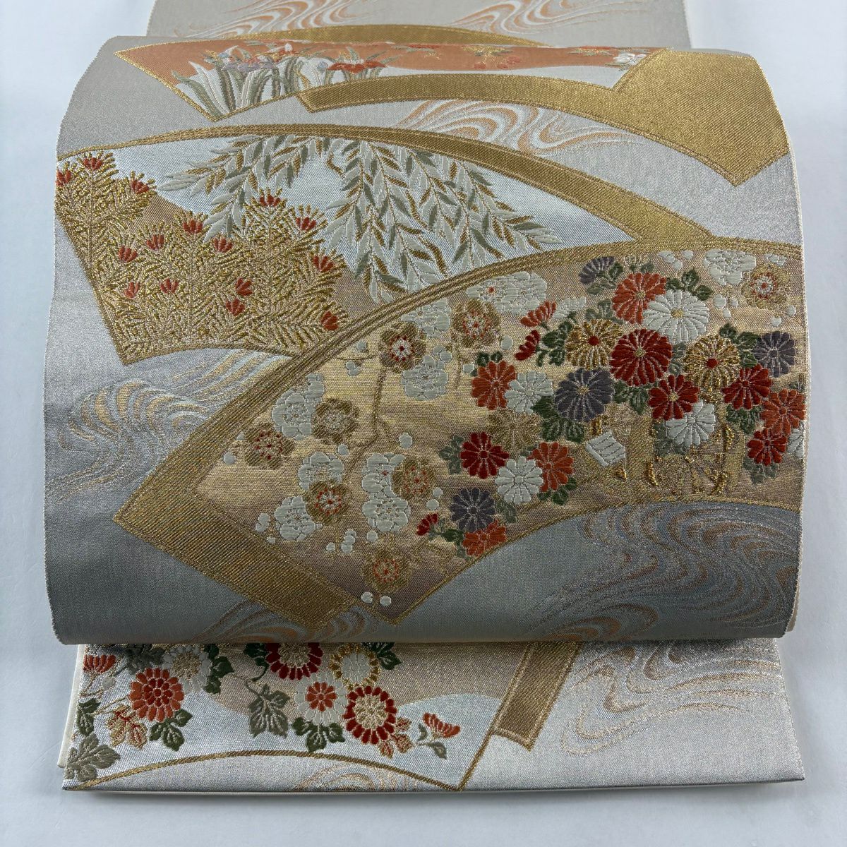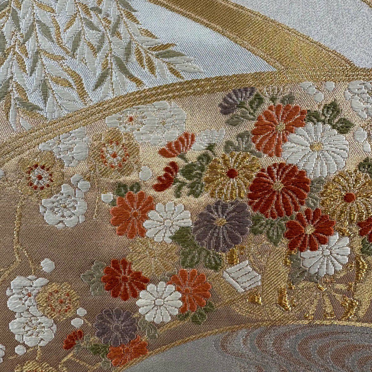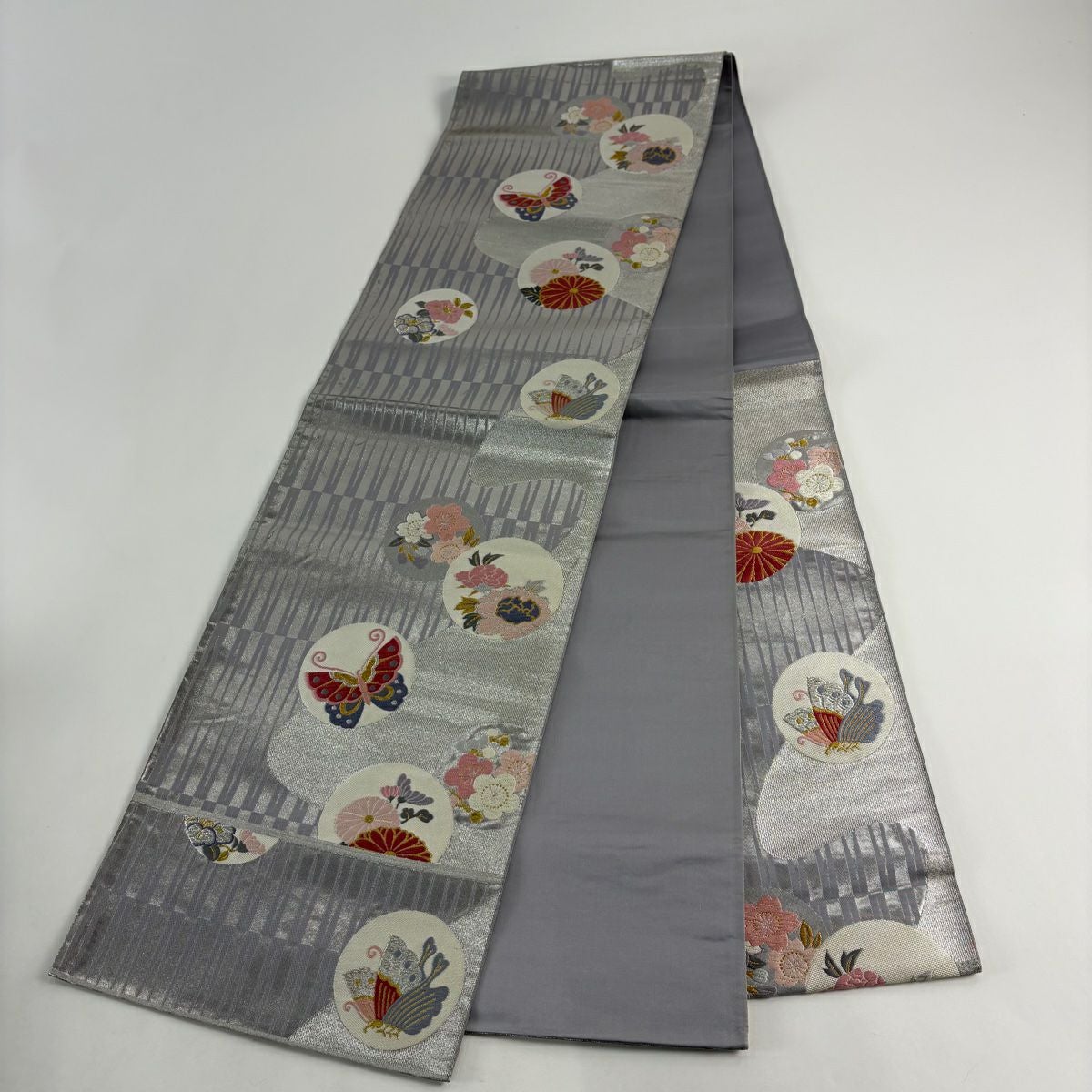 【美品】 袋帯 秀品 関西仕立て 菊 蝶 金銀糸 箔 銀色 六通 正絹
