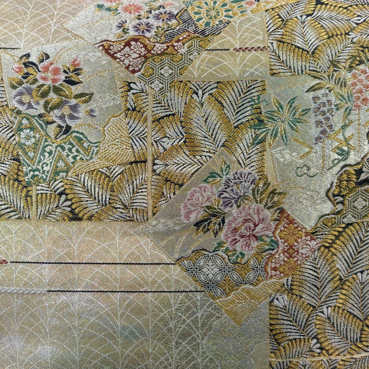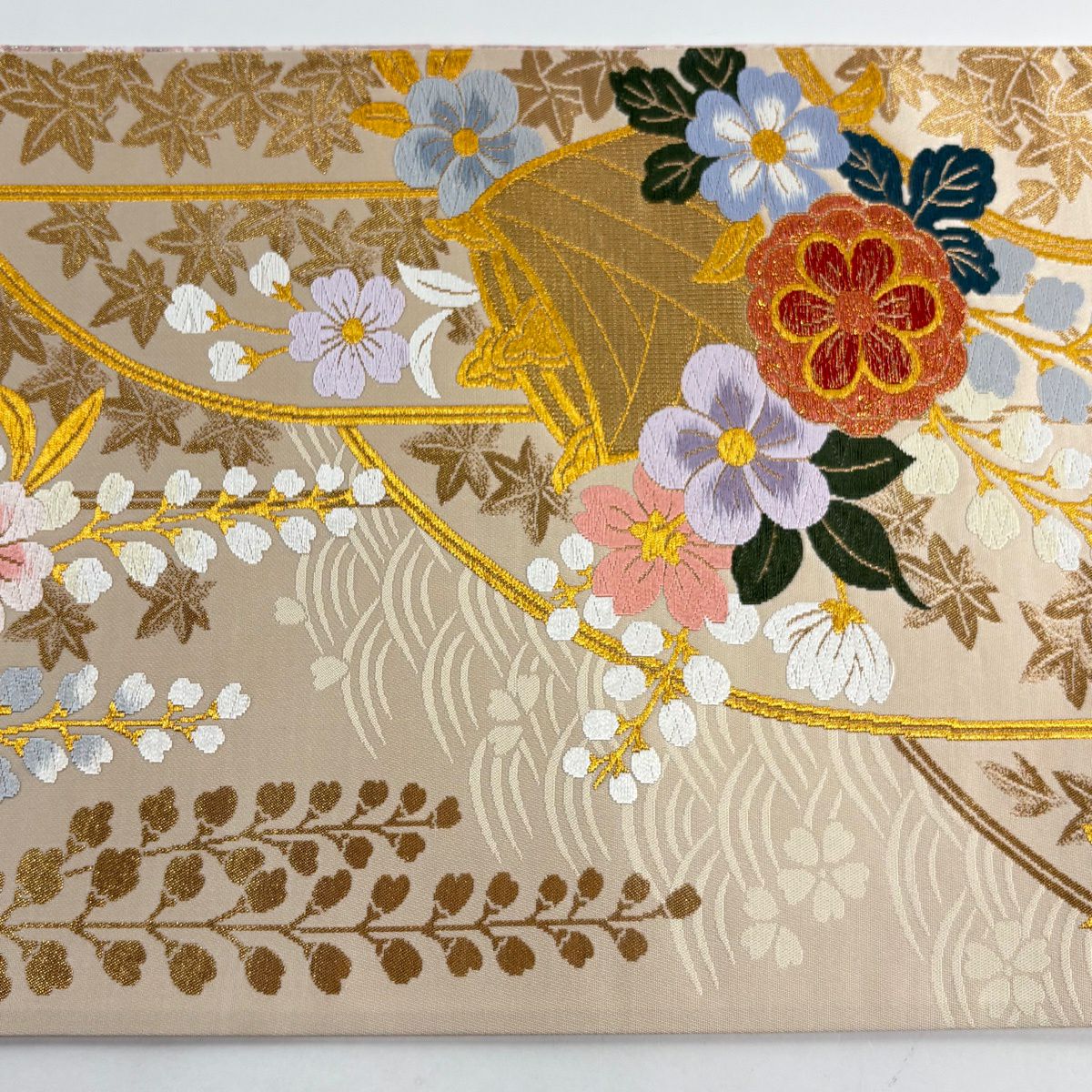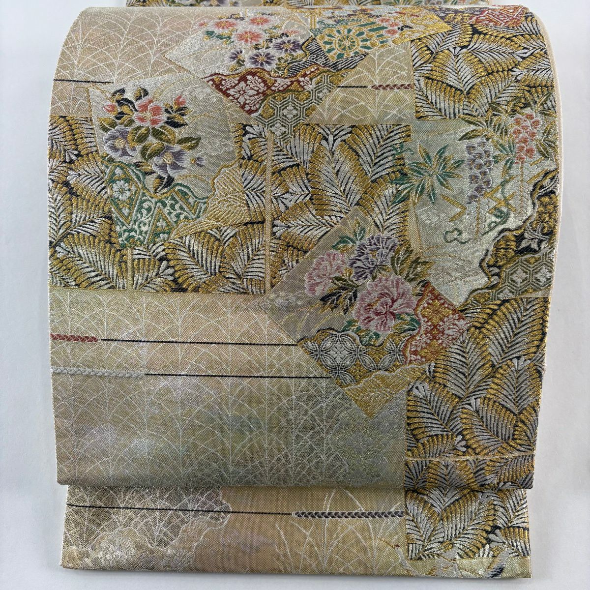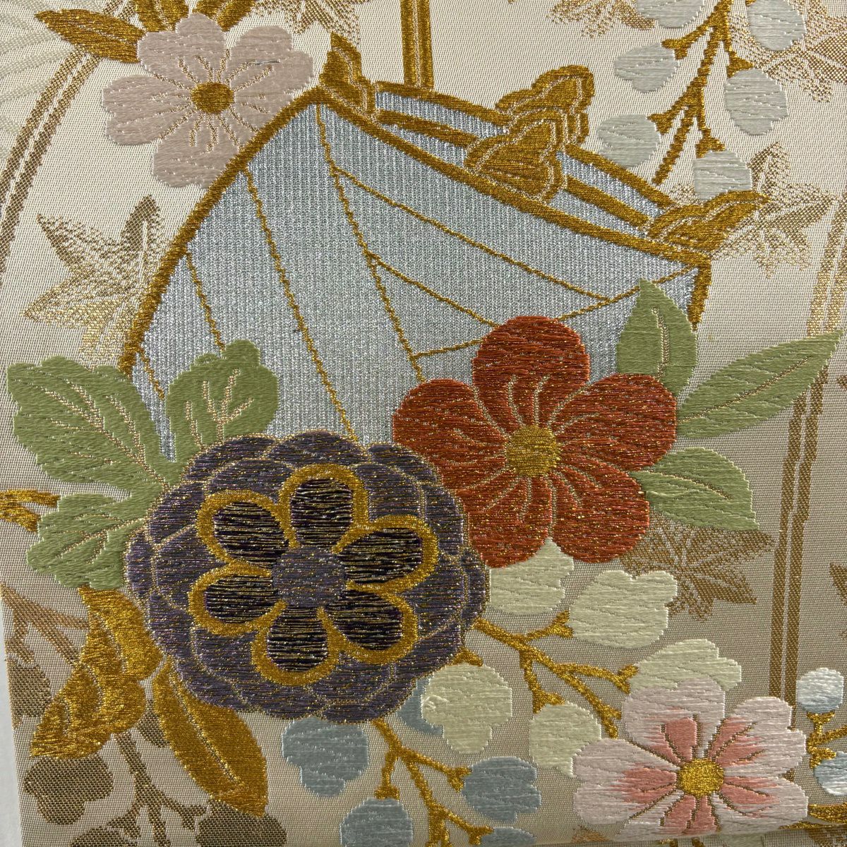 【美品】 袋帯 秀品 糸巻き 草花 金糸 箔 ベージュ 六通 正絹