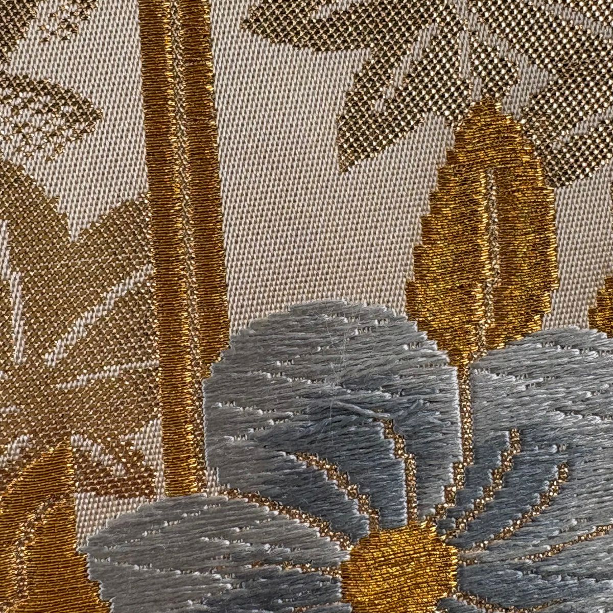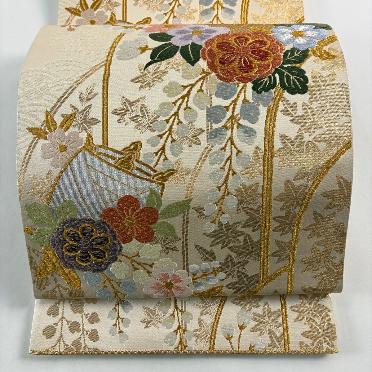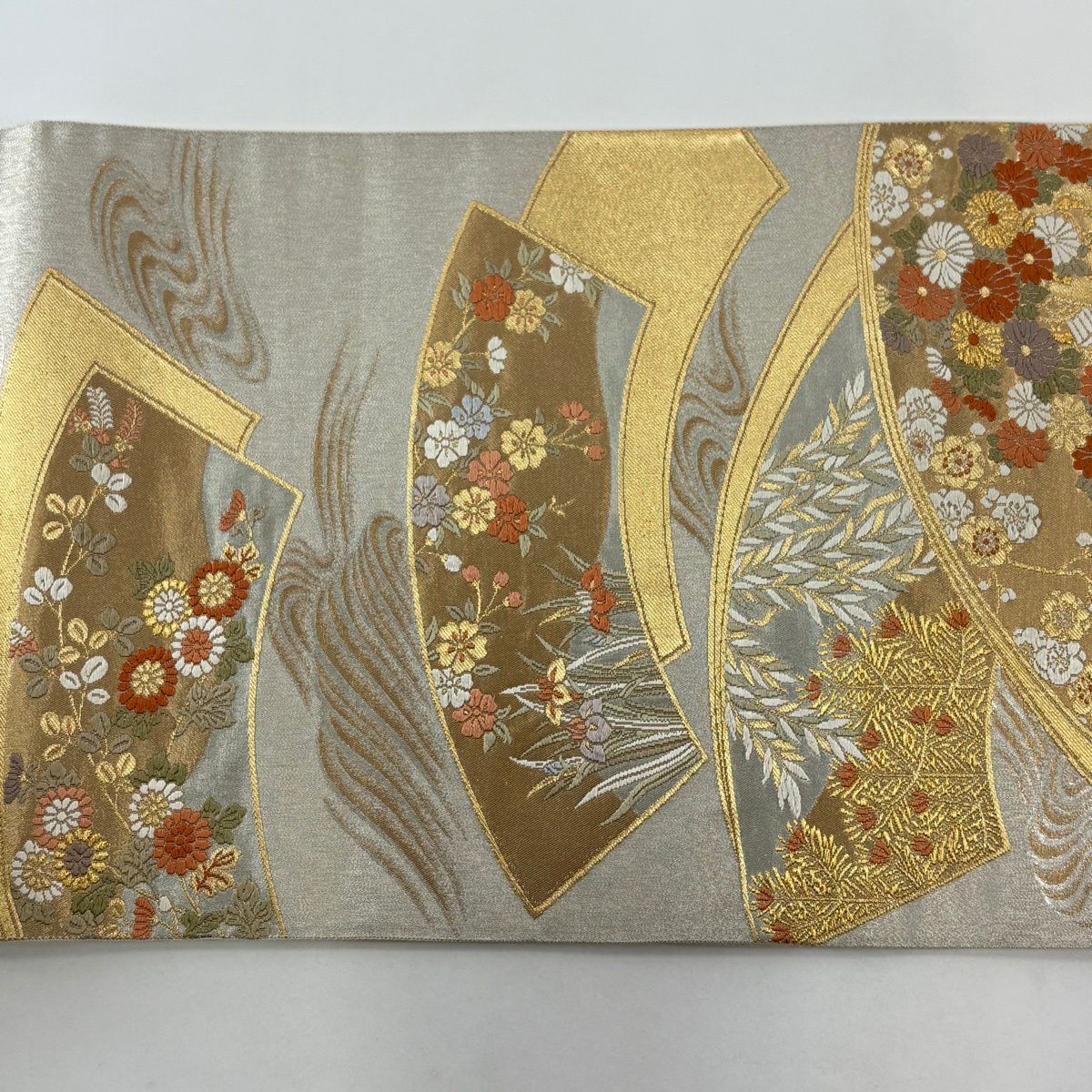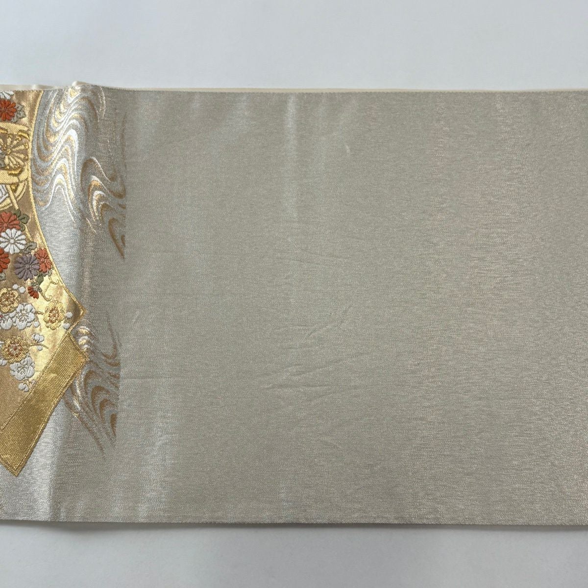 【美品】 袋帯 秀品 糸巻き 草花 金糸 箔 ベージュ 六通 正絹