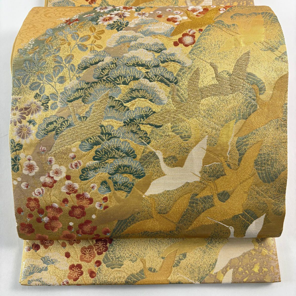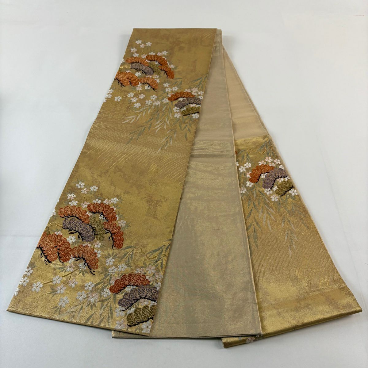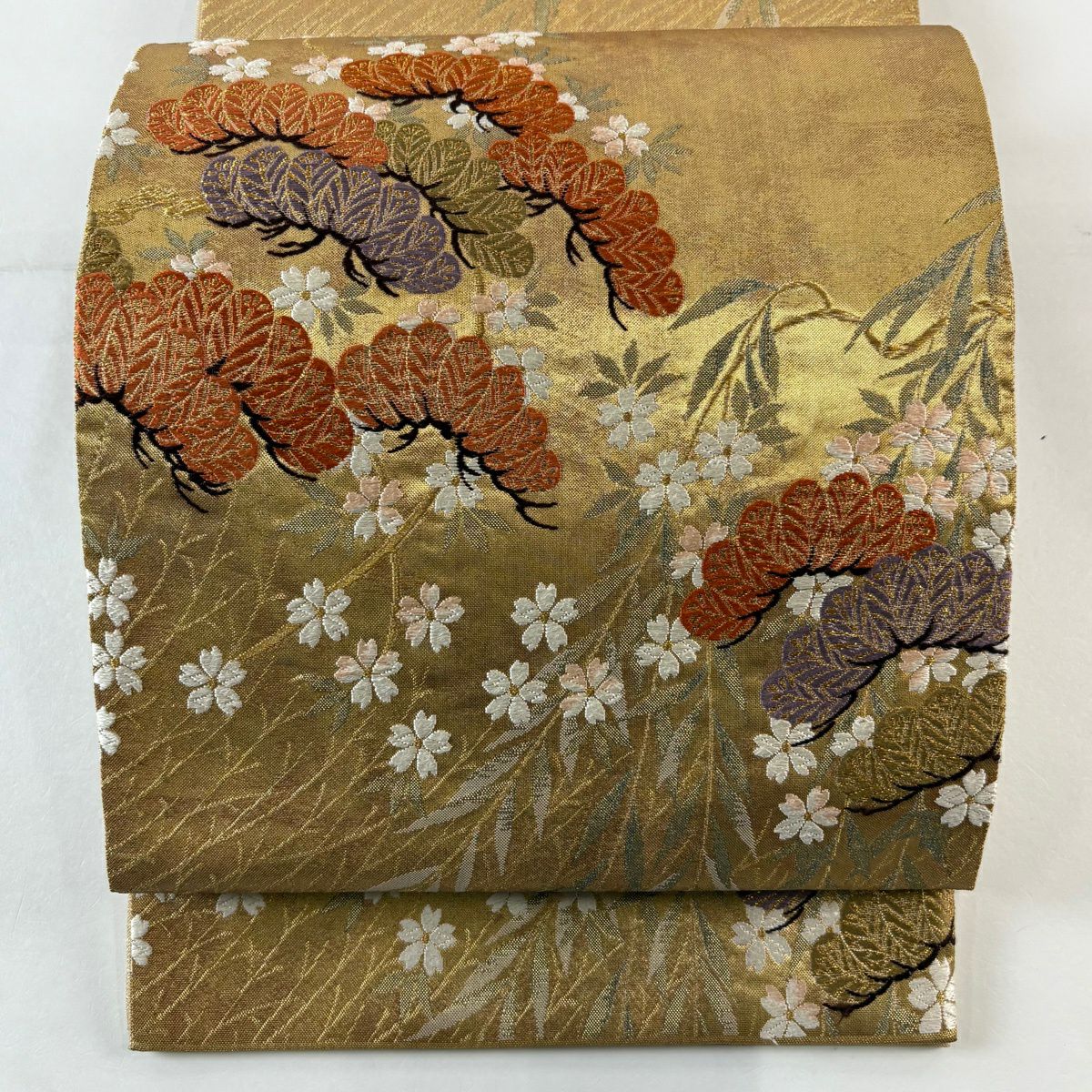 袋帯 秀品 関西仕立て 引箔 佐賀錦彩繍松紋 金糸 箔 金色 六通 正絹