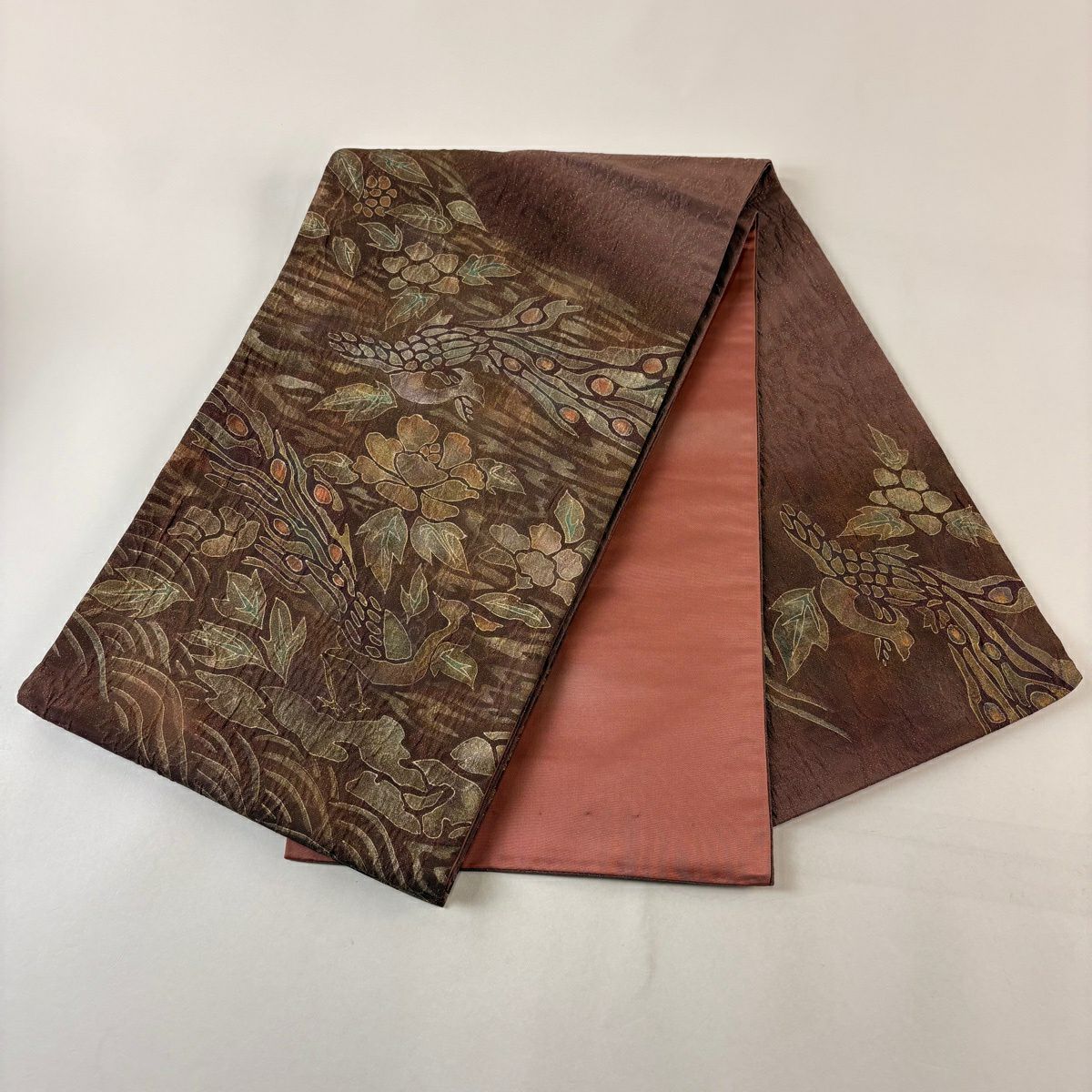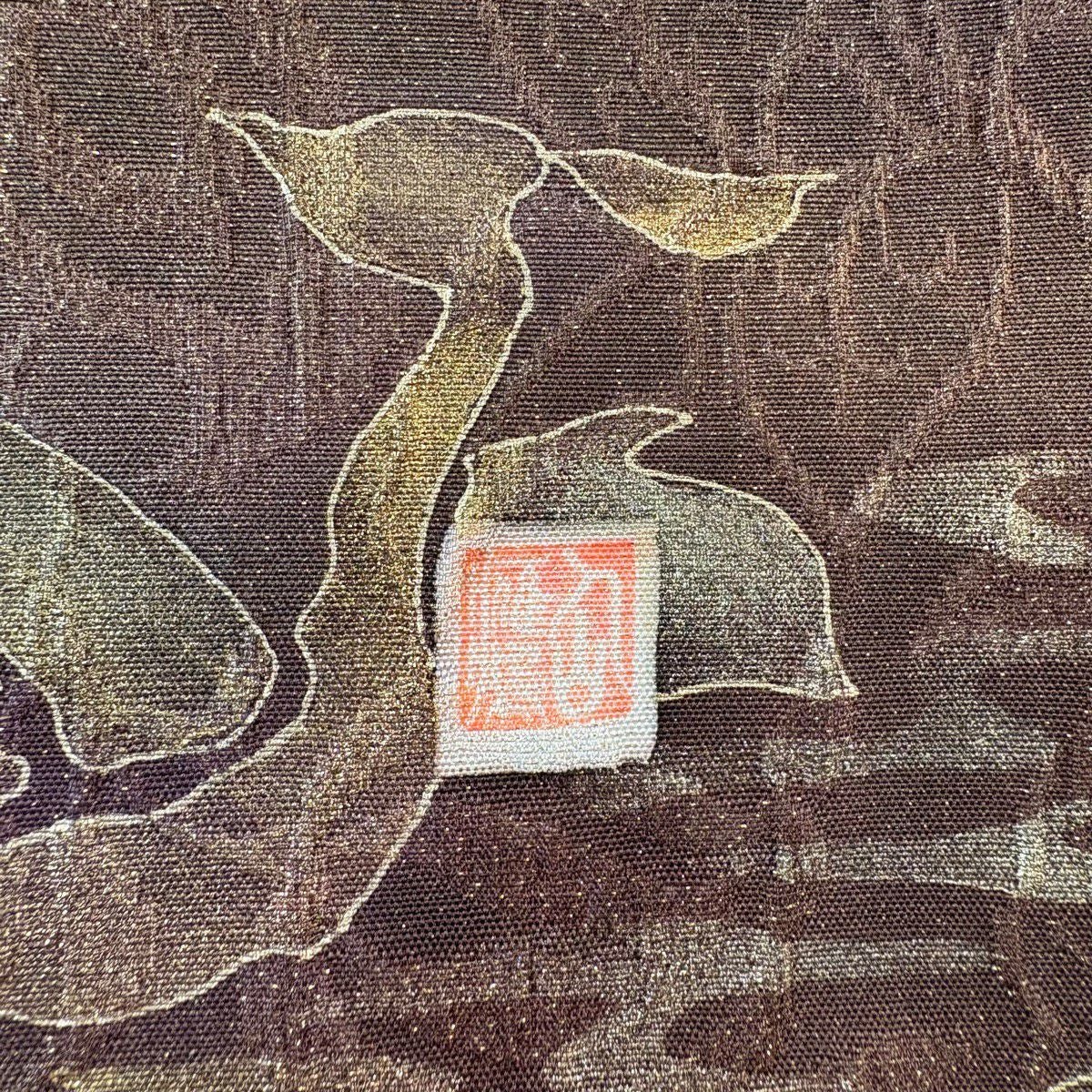 【美品】 袋帯 秀品 落款あり 鳥 草花 金通し 茶紫 お太鼓柄 正絹
