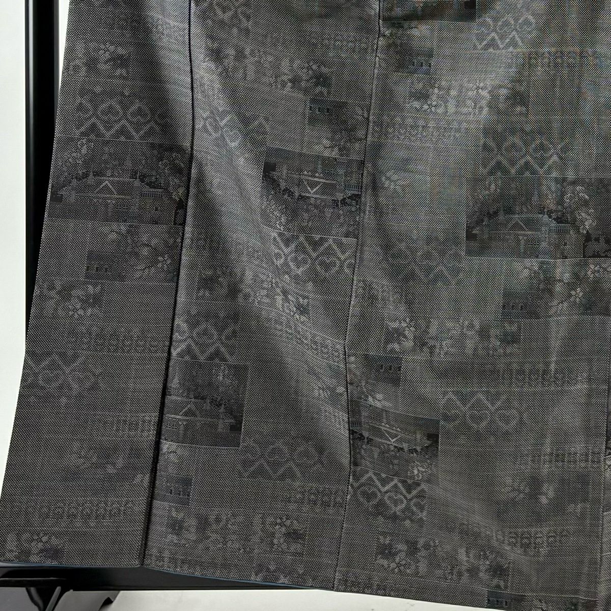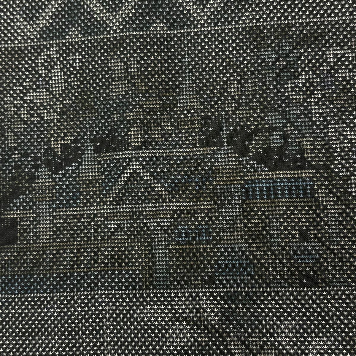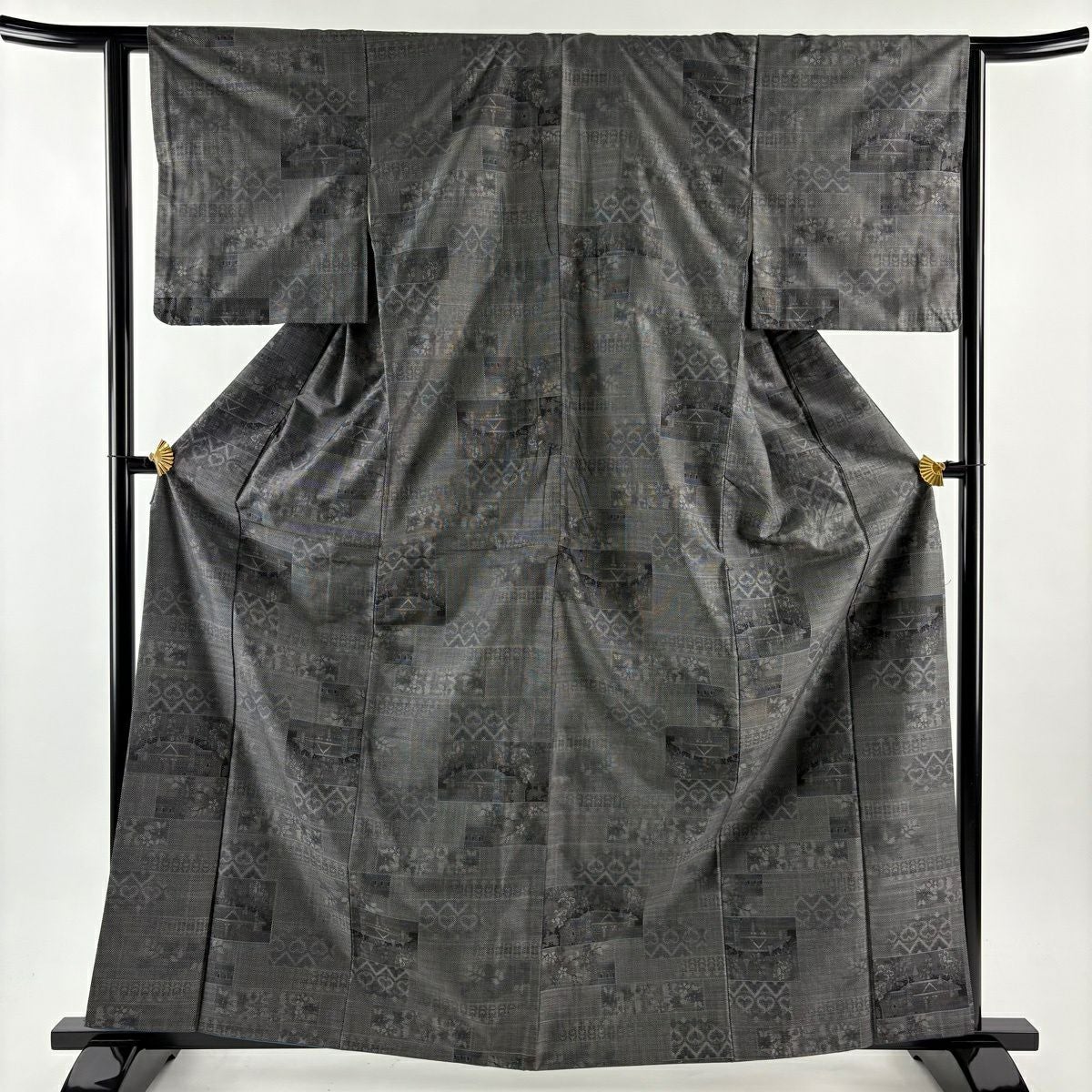 紬 身丈163.5cm 裄丈63cm S 袷 建物 草花 黒 正絹 秀品