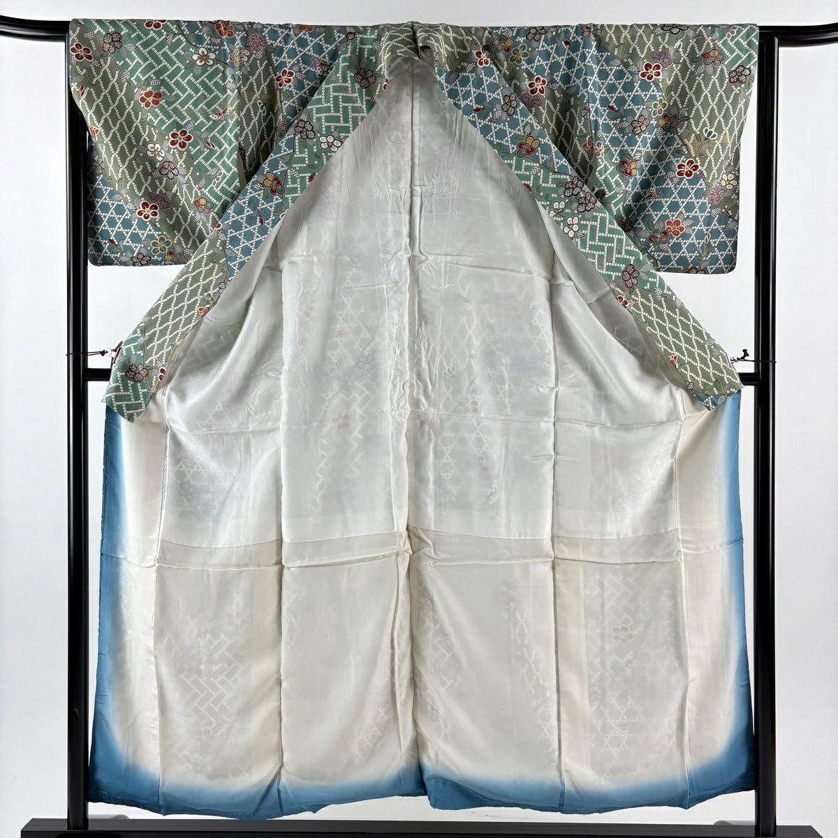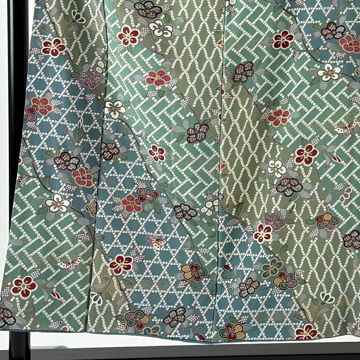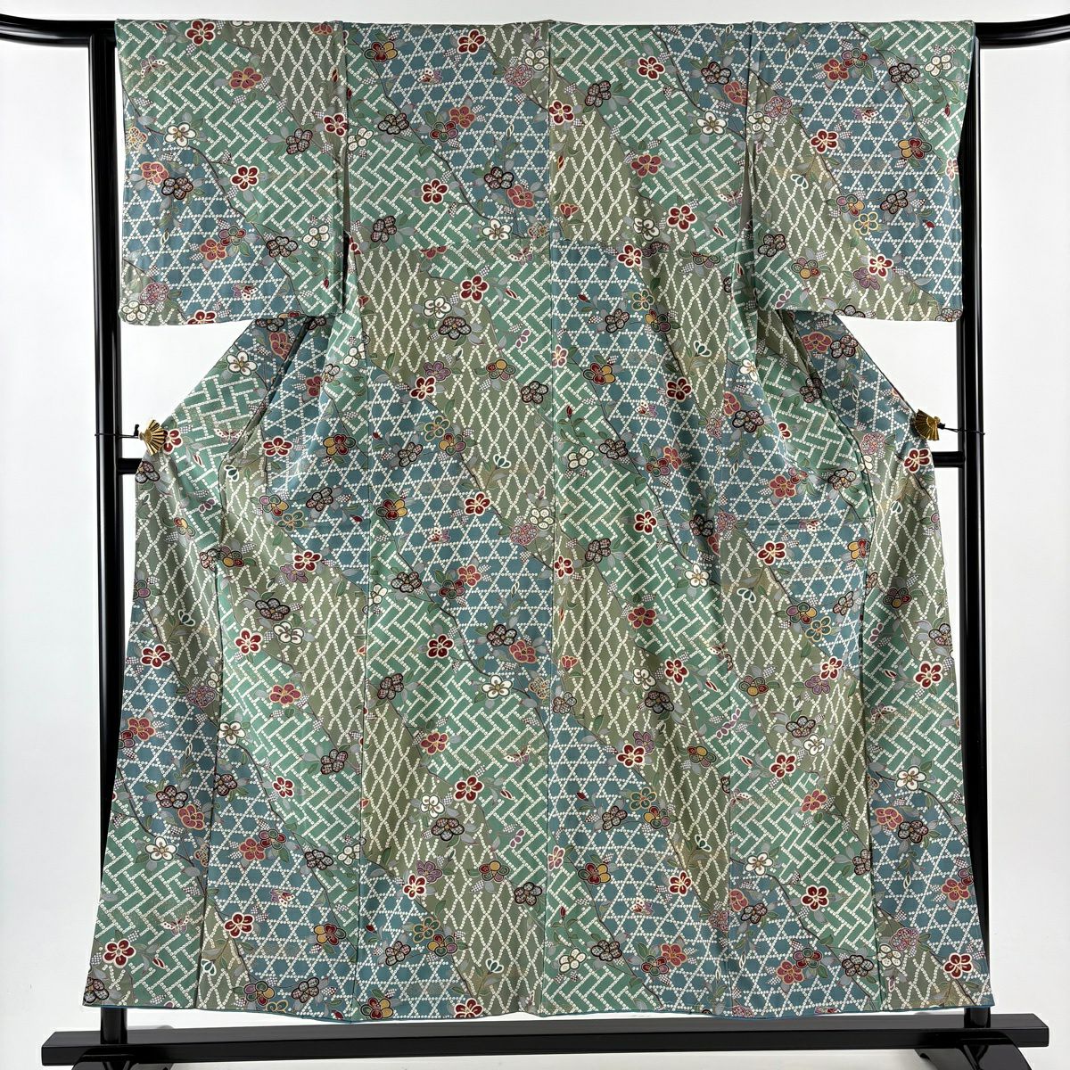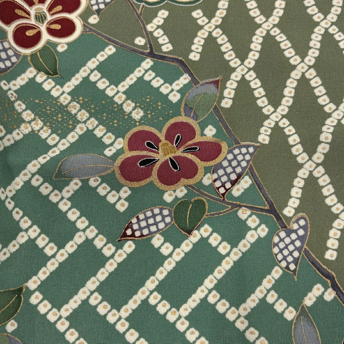 小紋 身丈164.5cm 裄丈69cm L 袷 萩 縮緬 緑 正絹 秀品