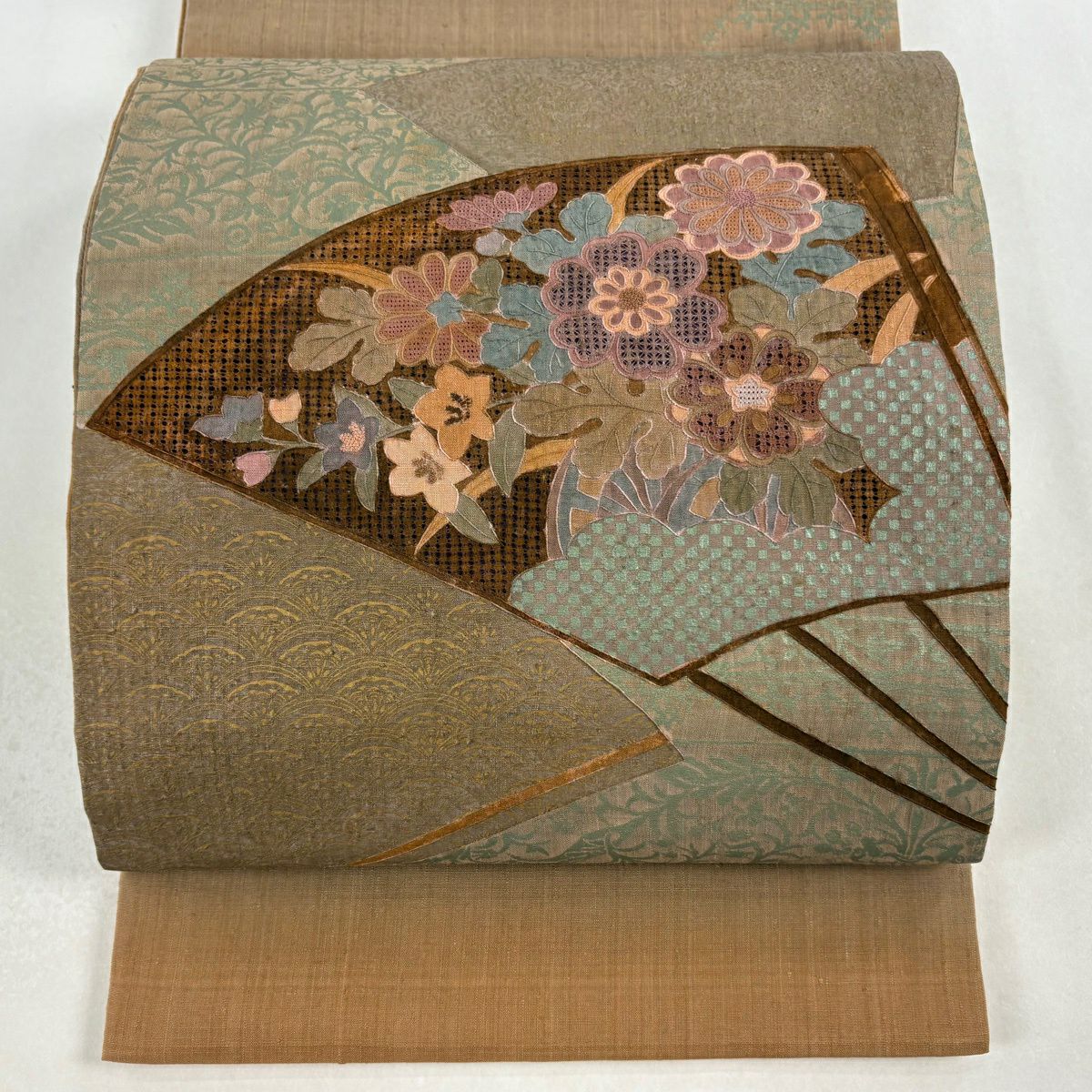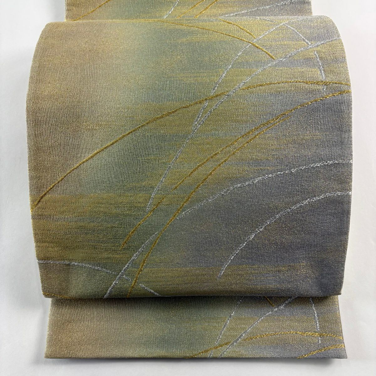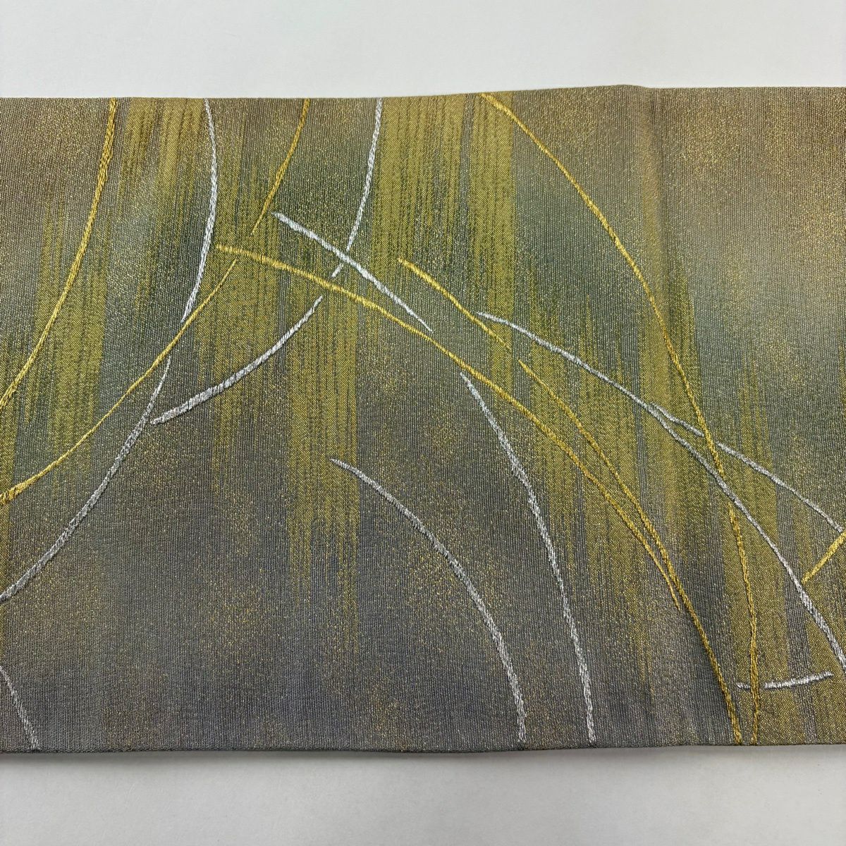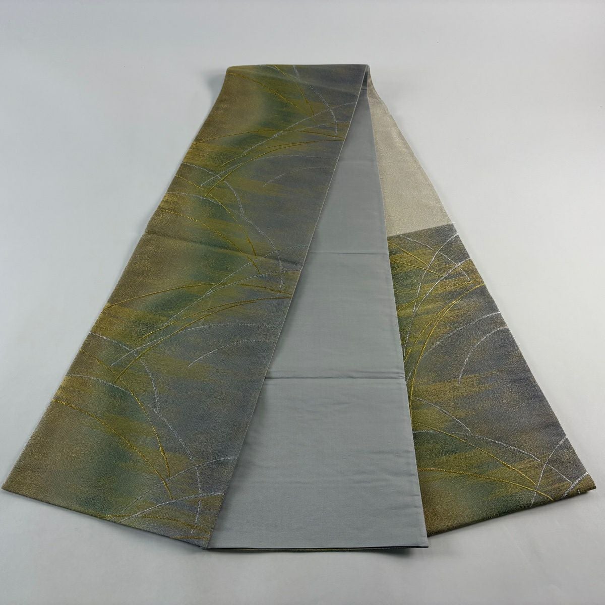 【美品】 袋帯 秀品 草花 葉柄 金通し 金銀糸 茶緑色 お太鼓柄 正絹