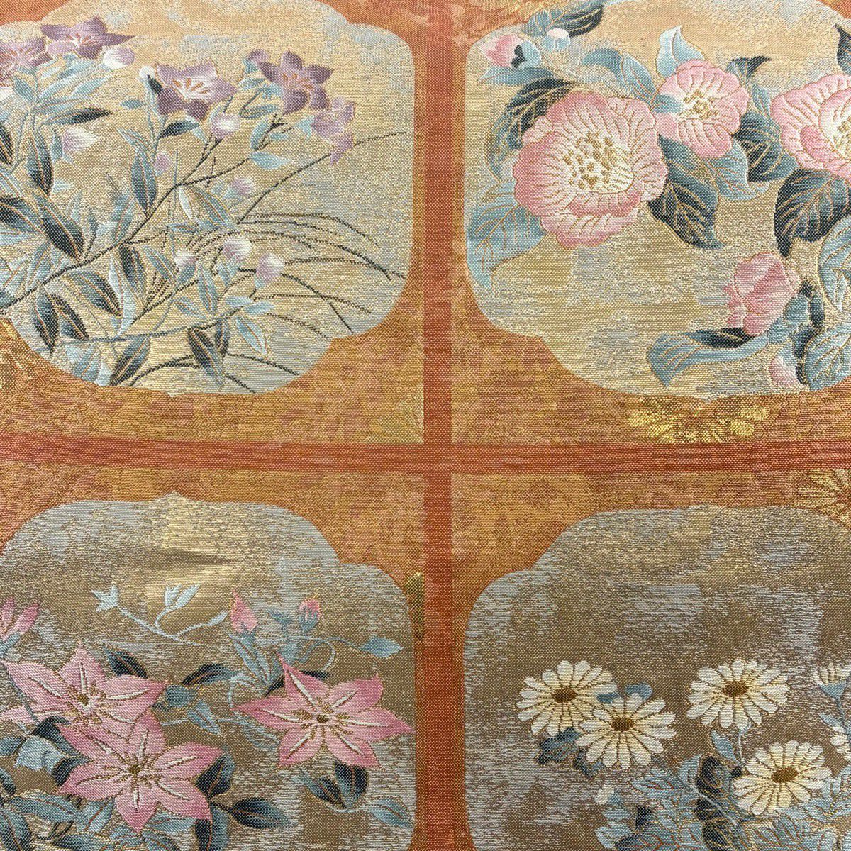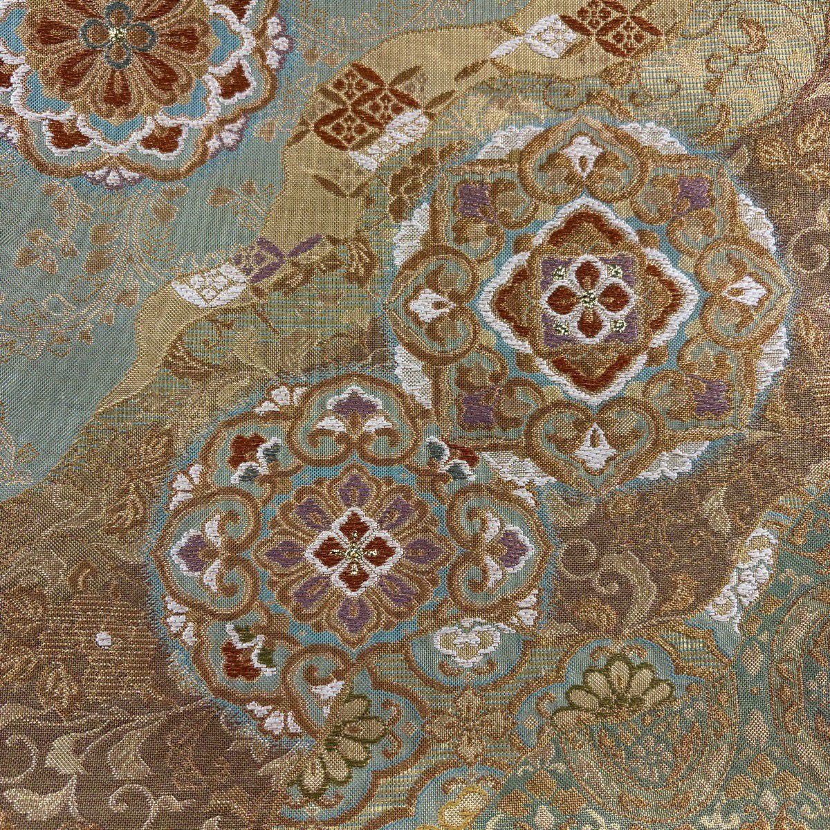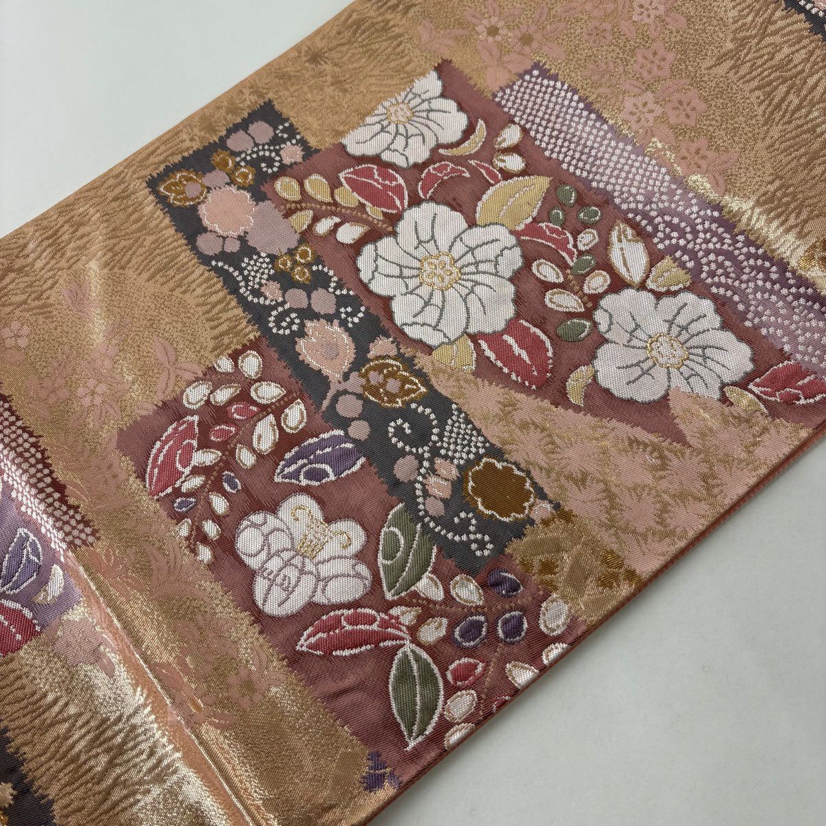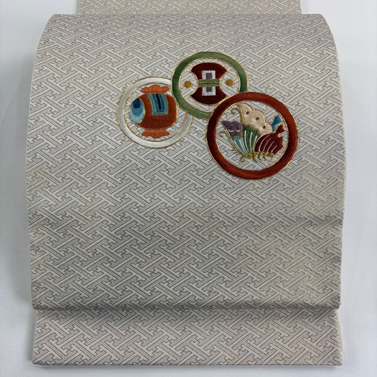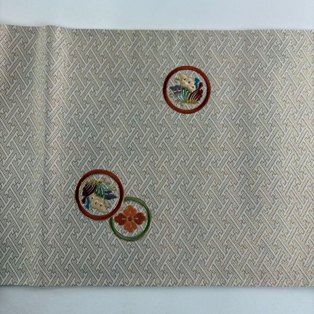 袋帯 秀品 照映粋椿 幾何学模様 金銀糸 箔 ベージュ 六通 正絹