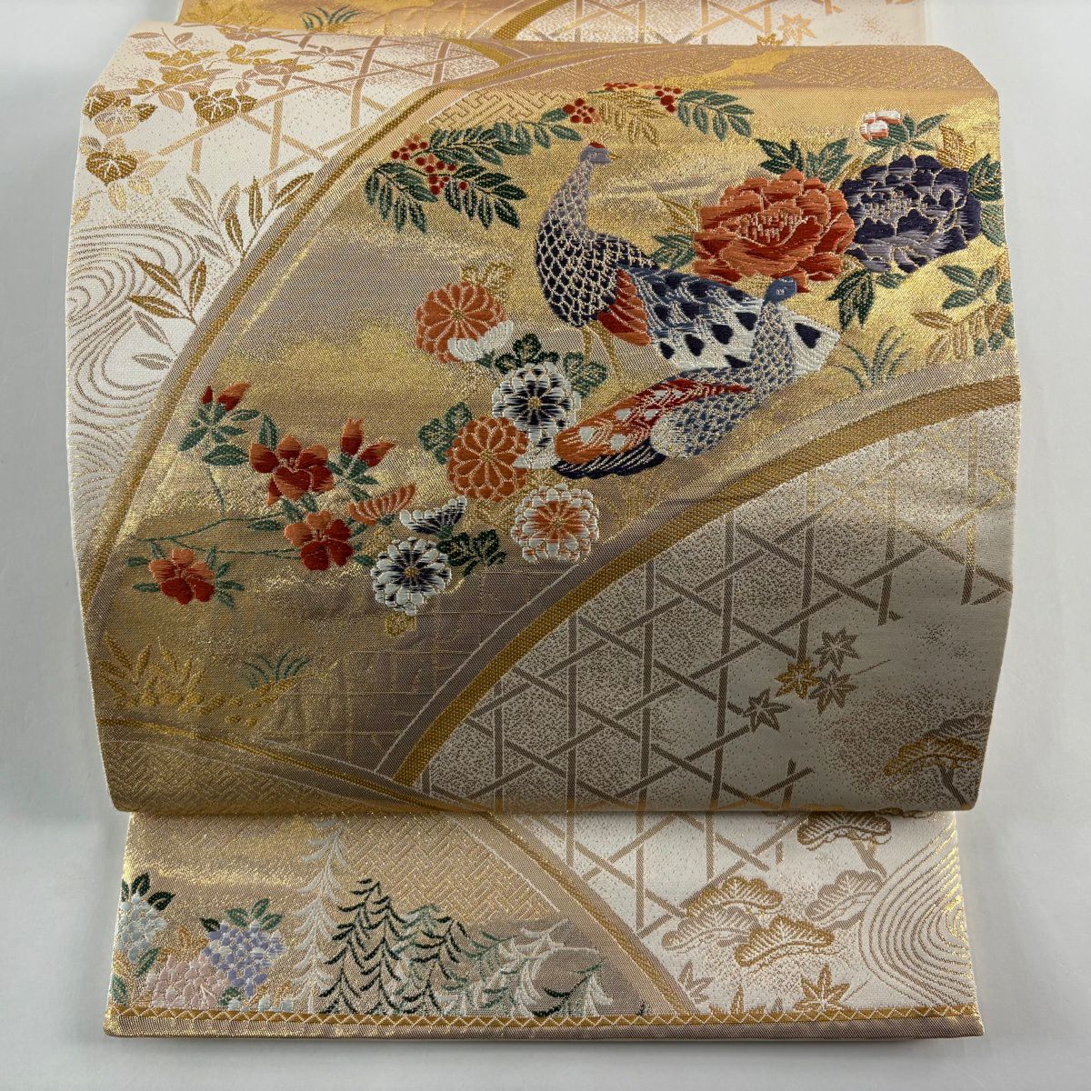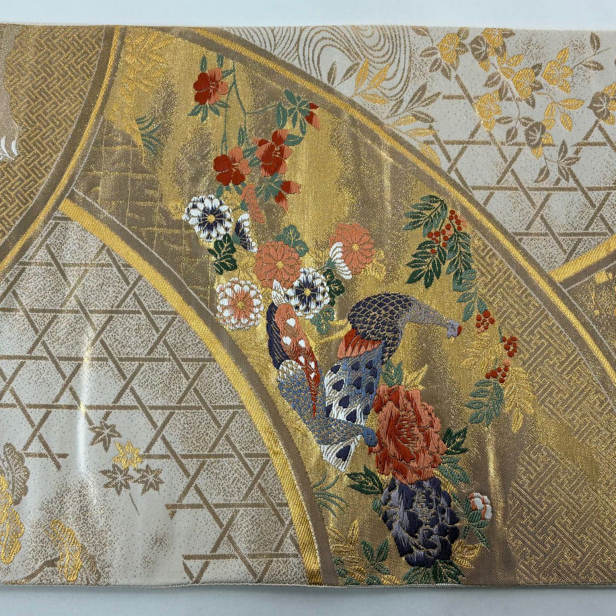 【美品】 袋帯 秀品 花鳥 華文 箔 金銀糸 ベージュ 六通 正絹