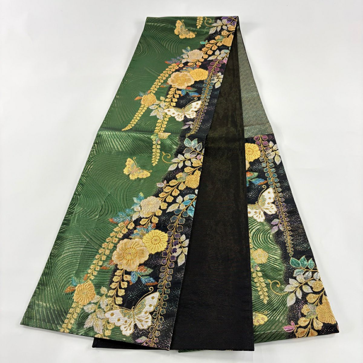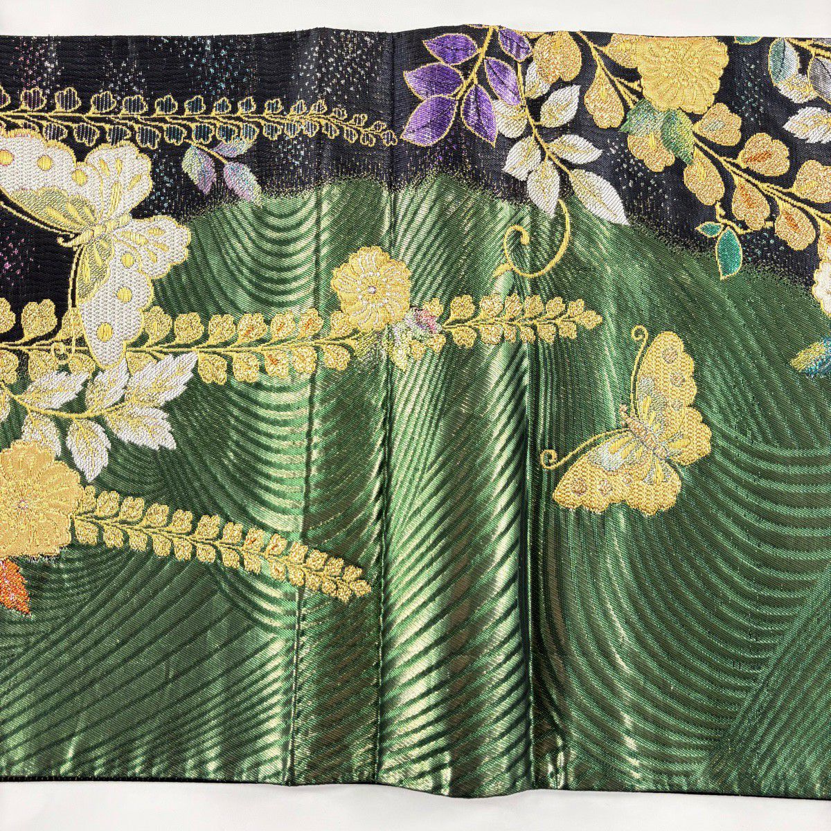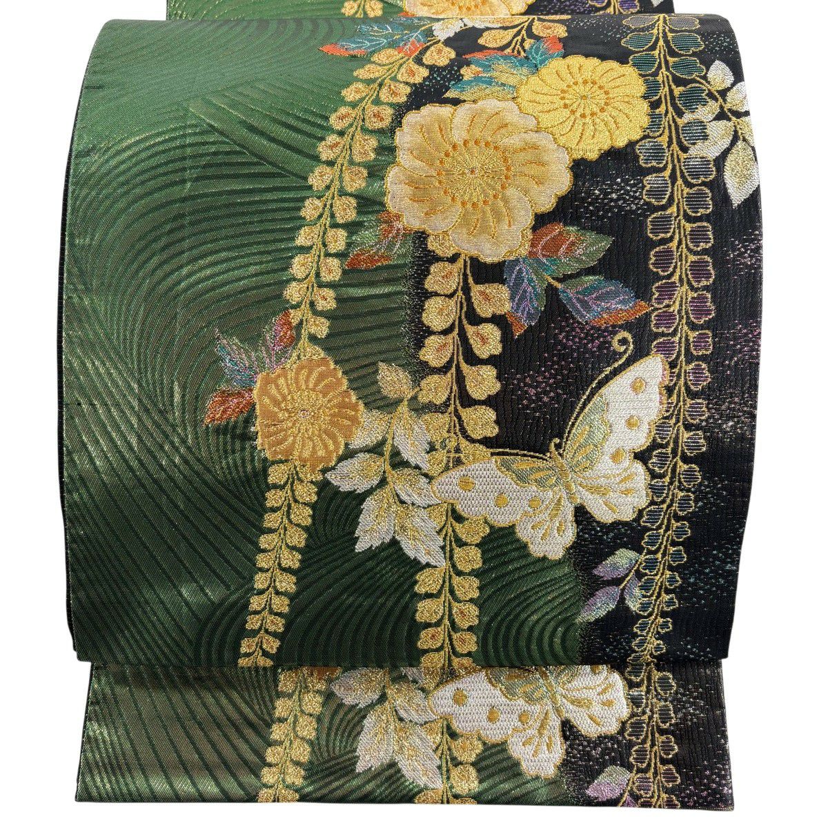 袋帯 秀品 草花 蝶 金糸 箔 緑 六通 正絹